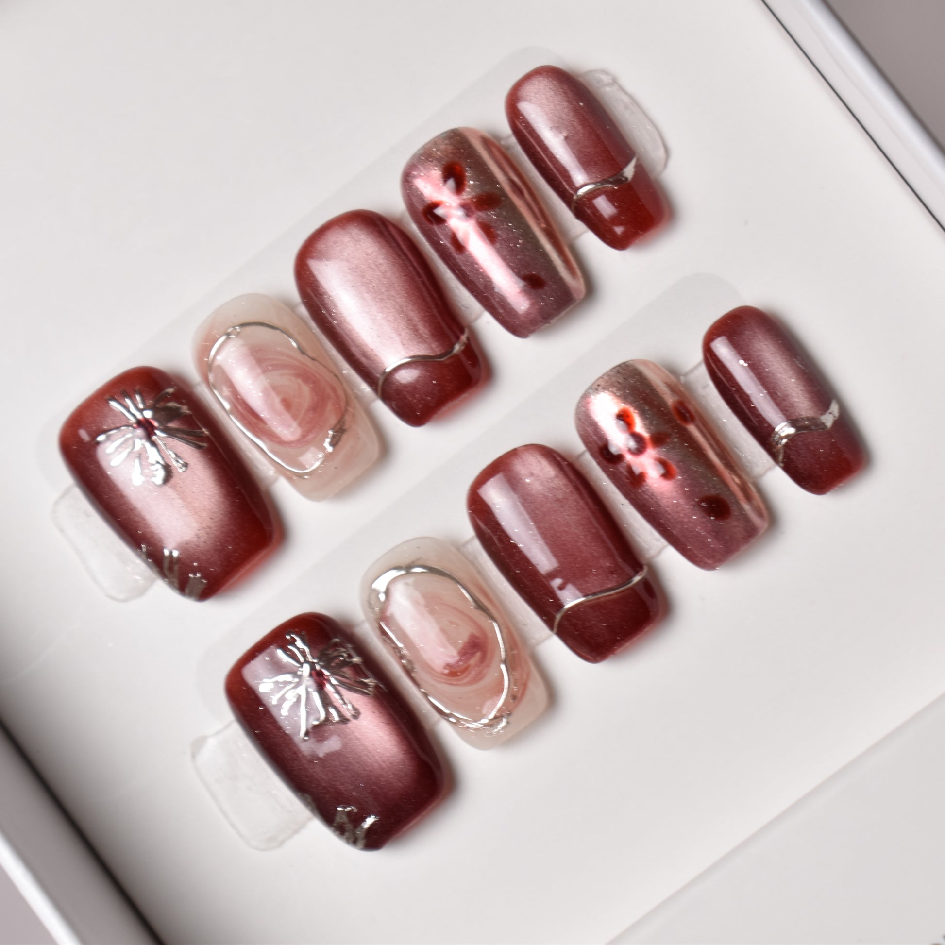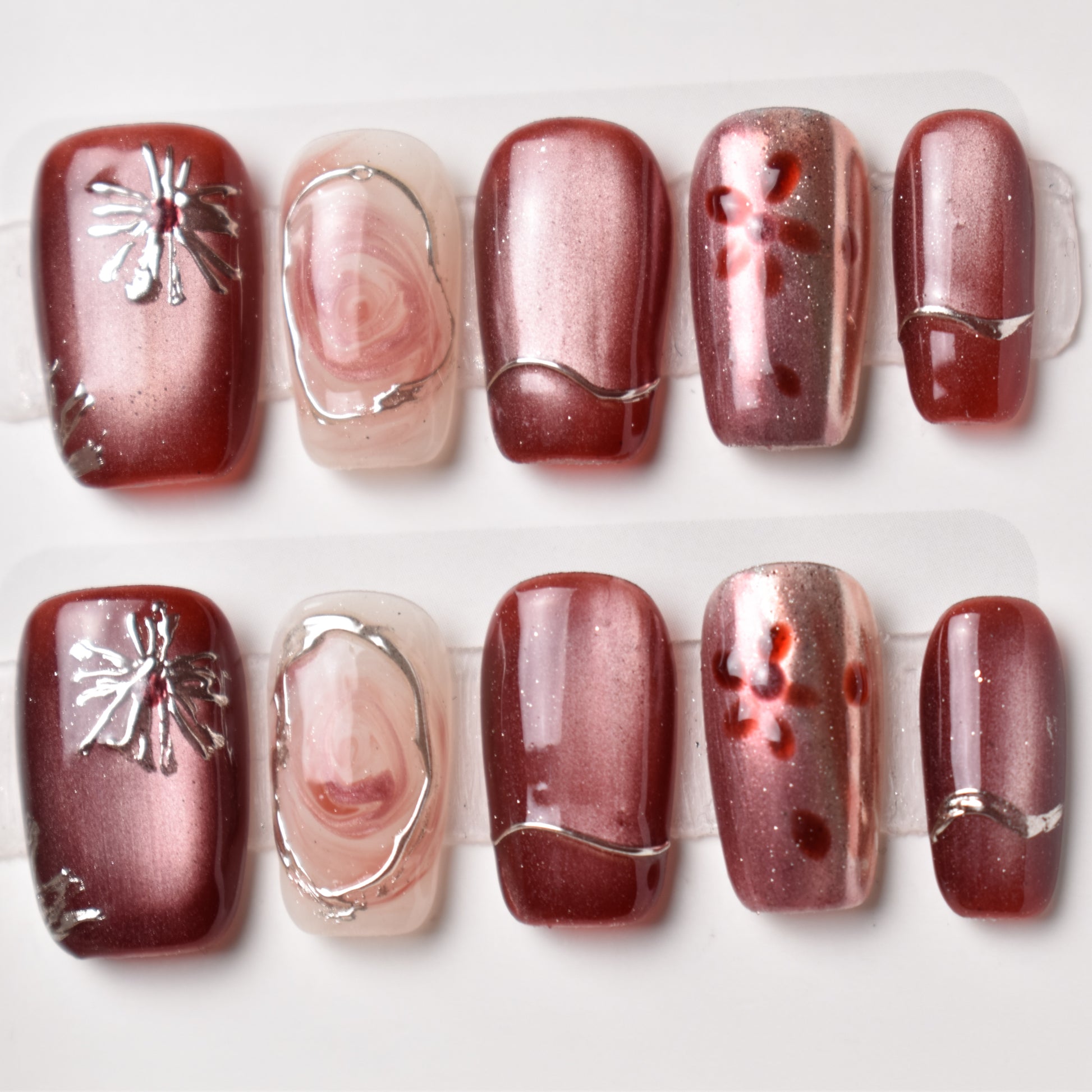 Deep crimson and rose tones sweep across each nail, accented with metallic leaf motifs and abstract petal patterns. A warm yet bold choice, ideal for festive nights, romantic dinners, and moments of passionate expression.