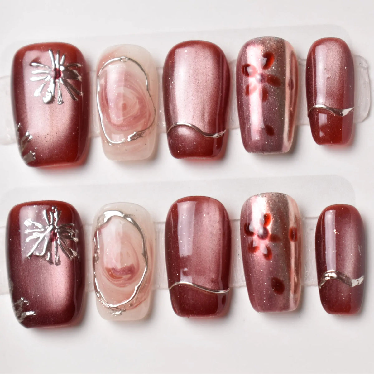 - 10 uniquely designed, hand-painted press-on nails made with high-quality UV gel.