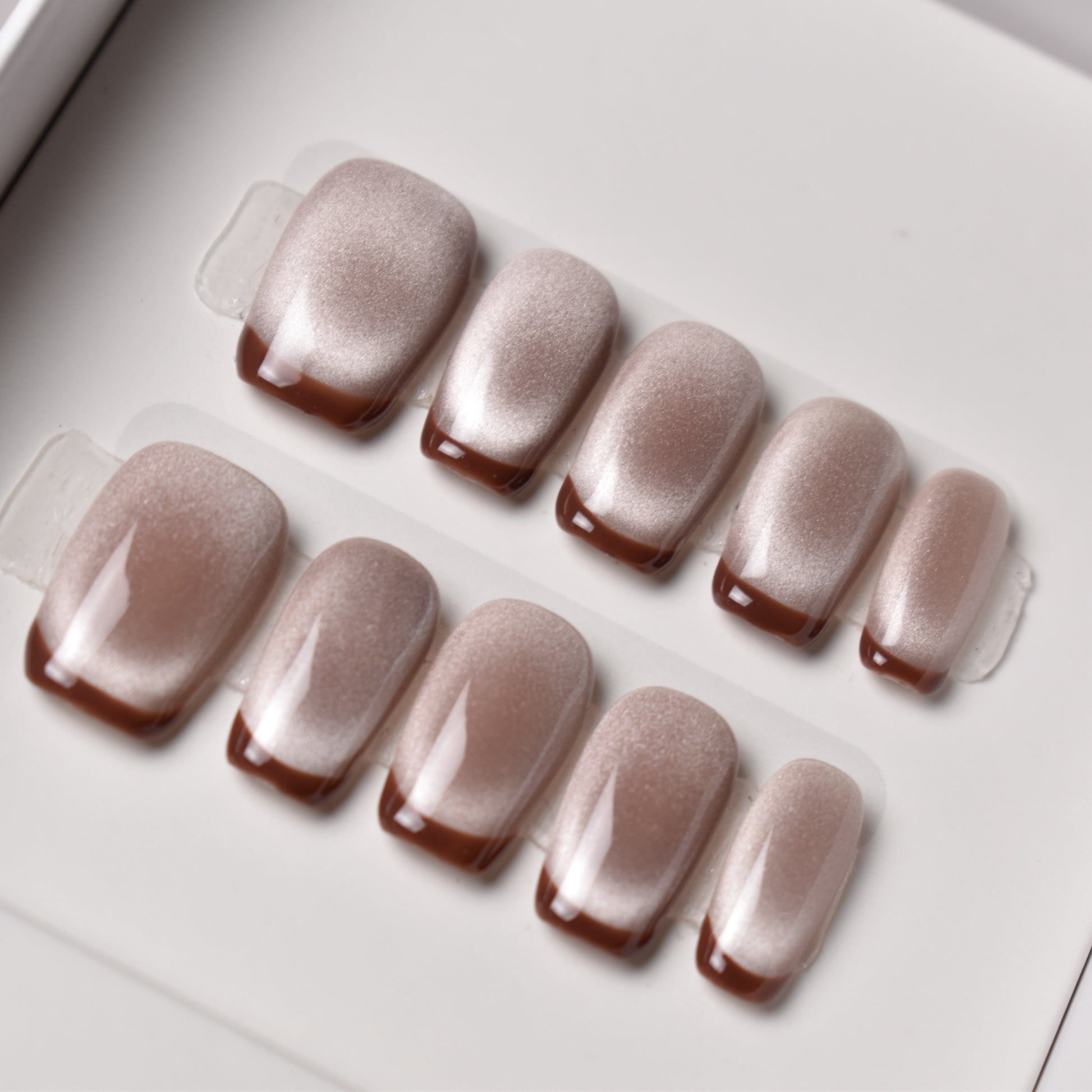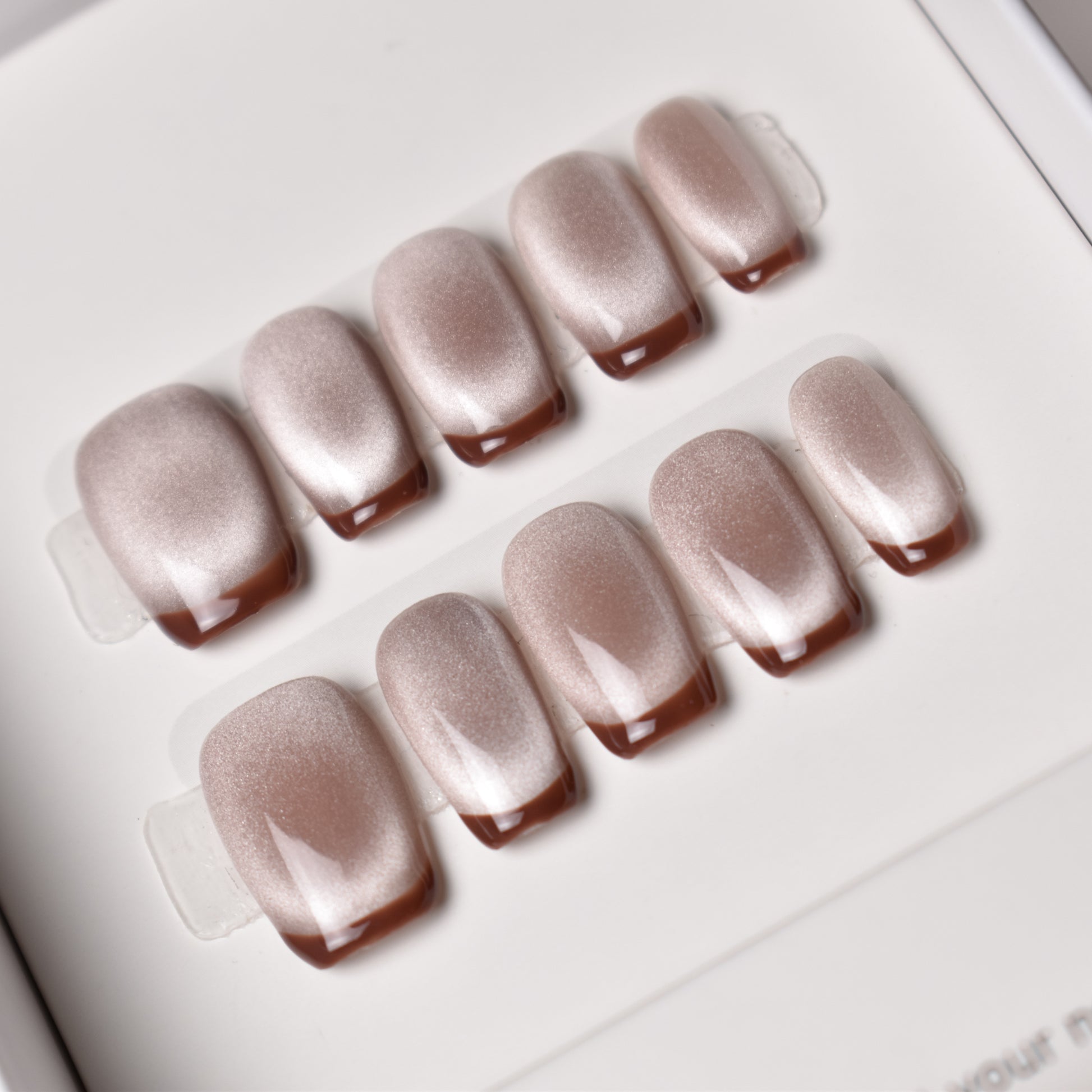 This set exudes understated elegance with a harmonious blend of warm amber-brown tips and a soft champagne pearl base. The fine shimmer in the gel reflects light beautifully, creating a satin-like glow that feels both refined and timeless. Each nail features a smooth, gradual transition from the warm brown French tip into the luminous base, making it a versatile design that pairs perfectly with any outfit. Ideal for those who love a classic look with a hint of Japanese-inspired sophistication.