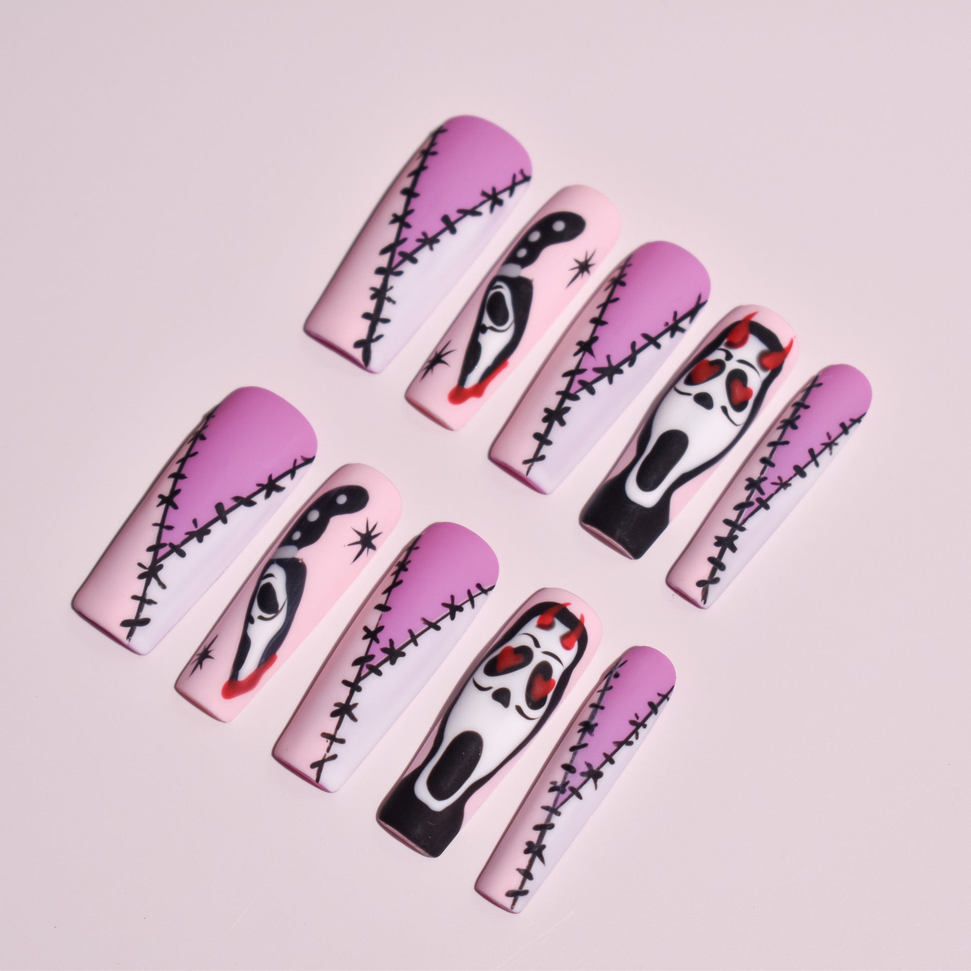Akuma Love Scream is an extra long square press-on nail set that blends playful horror with bold Y2K gothic energy. Featuring hand-painted scream masks with heart eyes and devil horns, stitched scar details, and gradient pink-to-purple bases, this set delivers a dramatic, high-fashion spooky look with a cute twist.