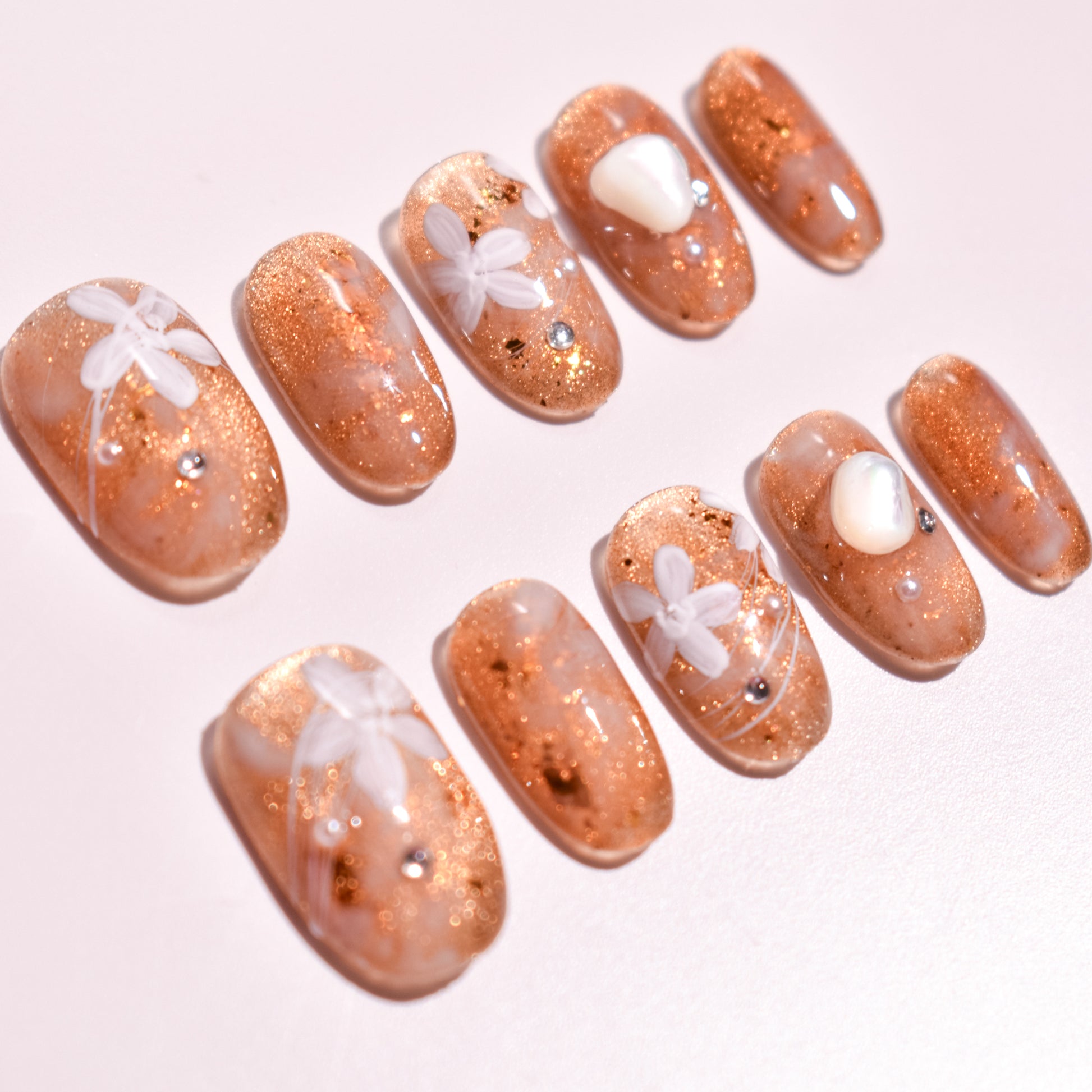 Amber Pearl Bloom is a handcrafted medium oval press-on nail set inspired by warm sunlight, natural stone textures, and soft floral elegance.