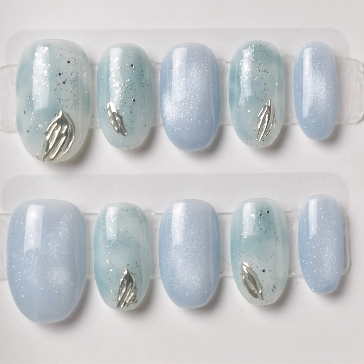 Soft gradients of cloud blue and silver sparkle under tiny droplets of metallic charm, like raindrops glistening on a spring morning. Perfect for rainy day cafés, peaceful journaling, and times when calm beauty shines brightest.