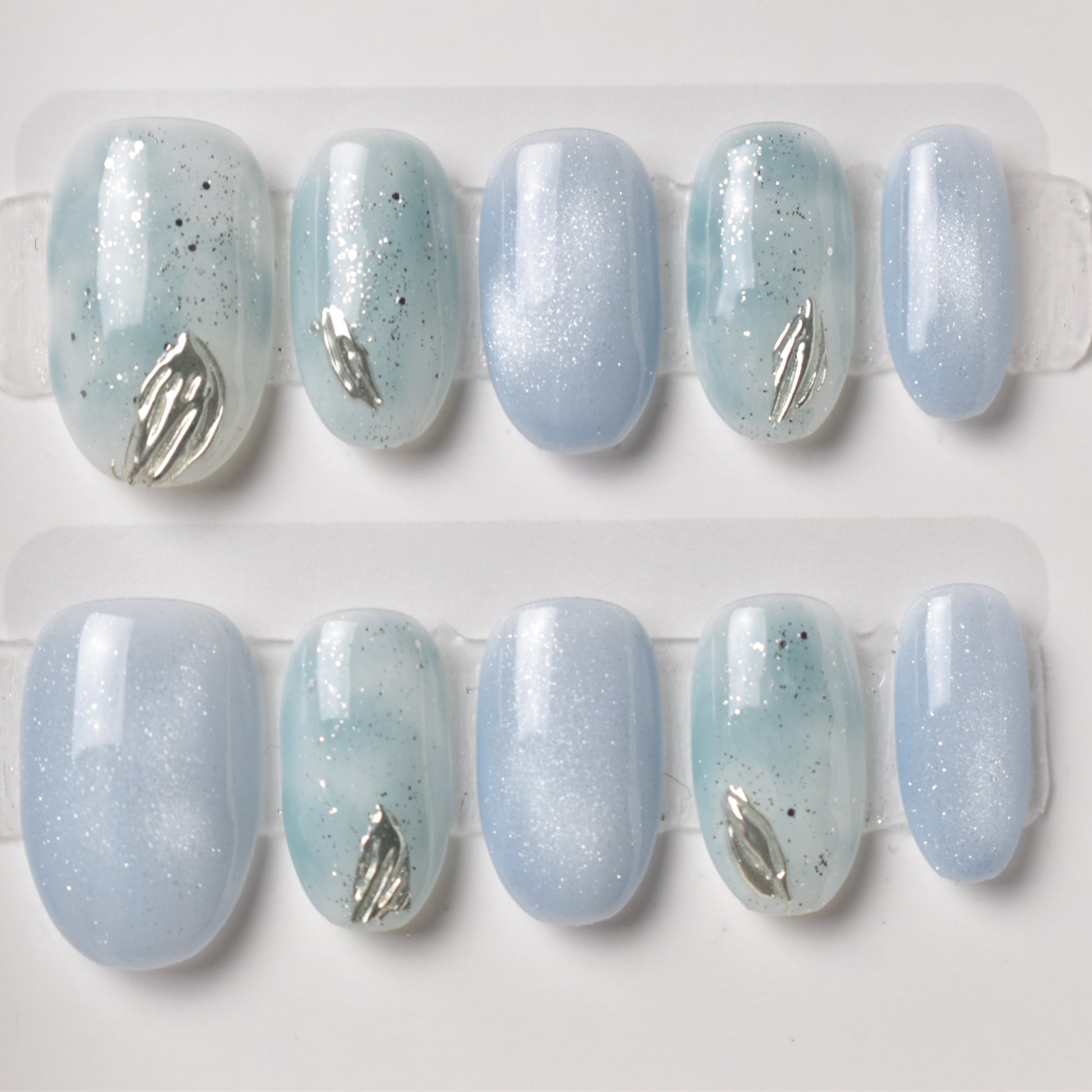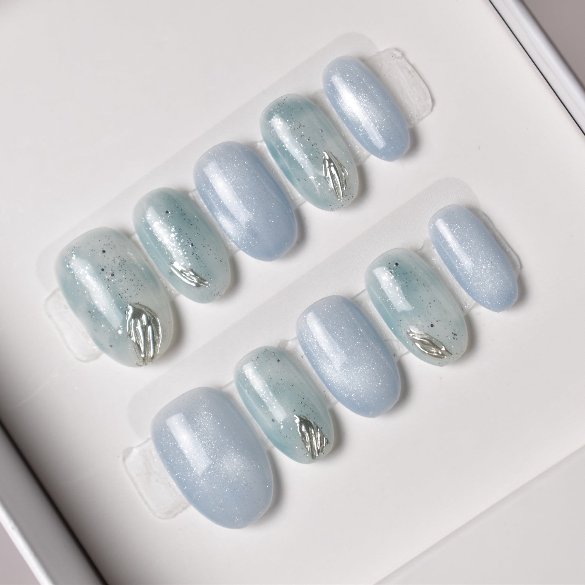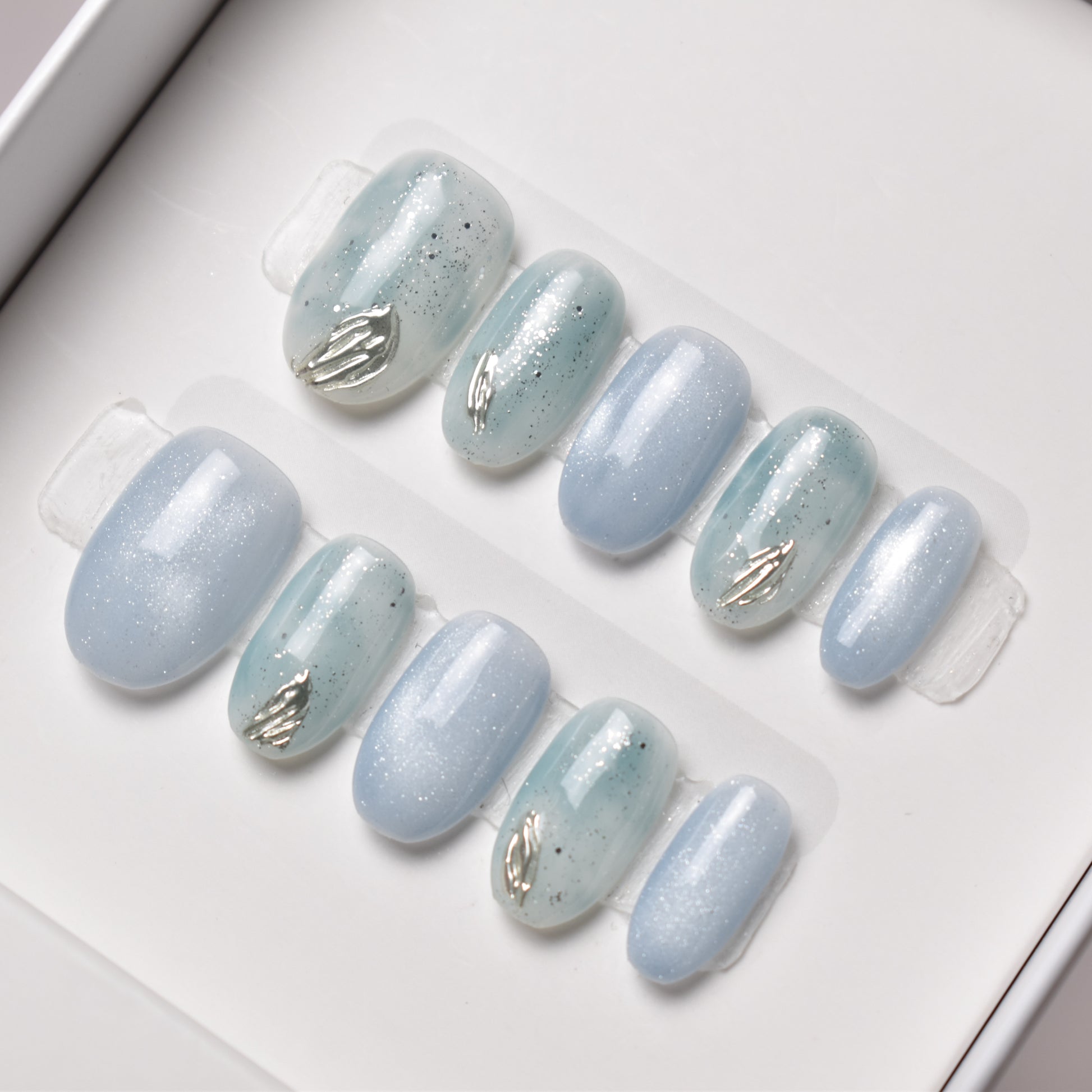 Soft gradients of cloud blue and silver sparkle under tiny droplets of metallic charm, like raindrops glistening on a spring morning. Perfect for rainy day cafés, peaceful journaling, and times when calm beauty shines brightest.