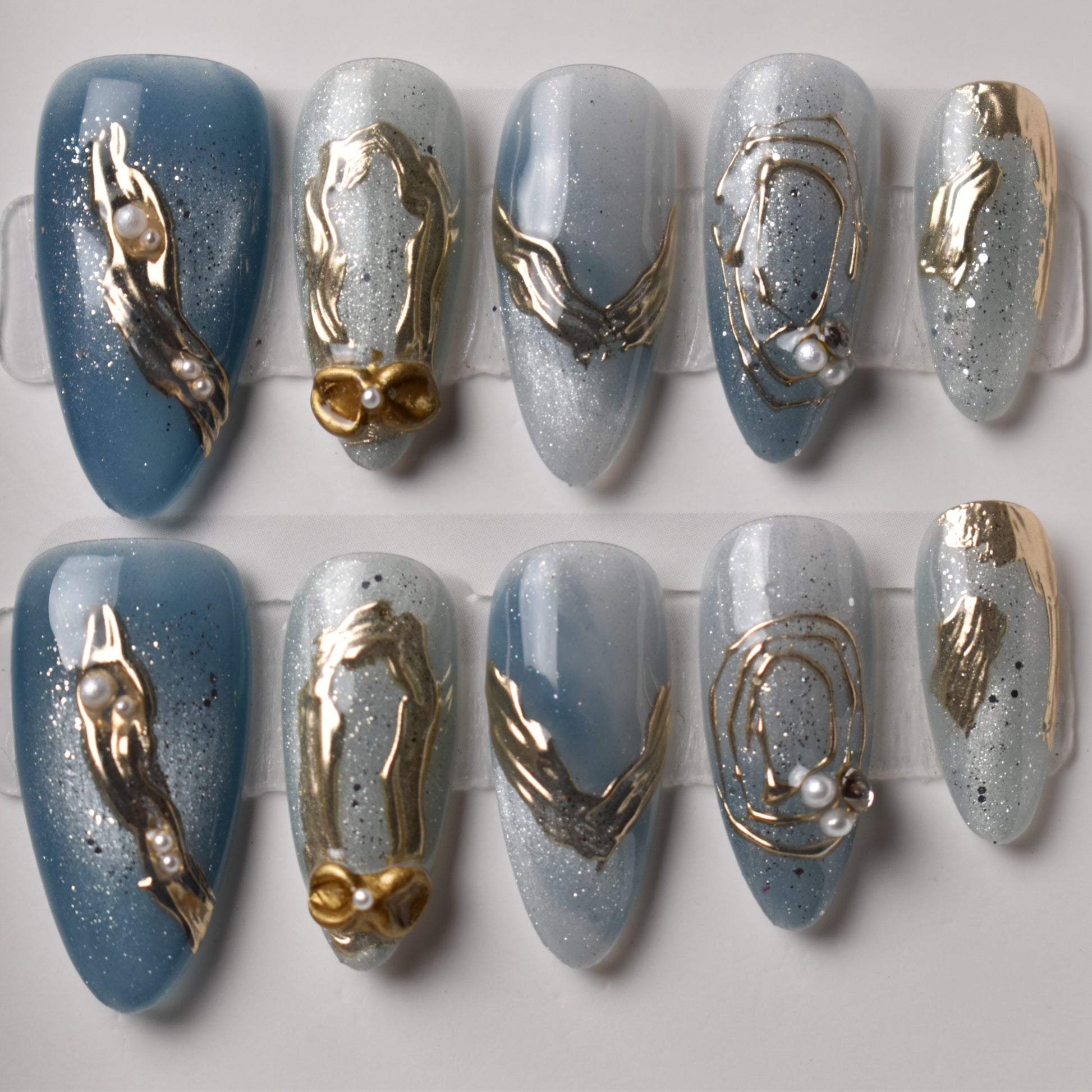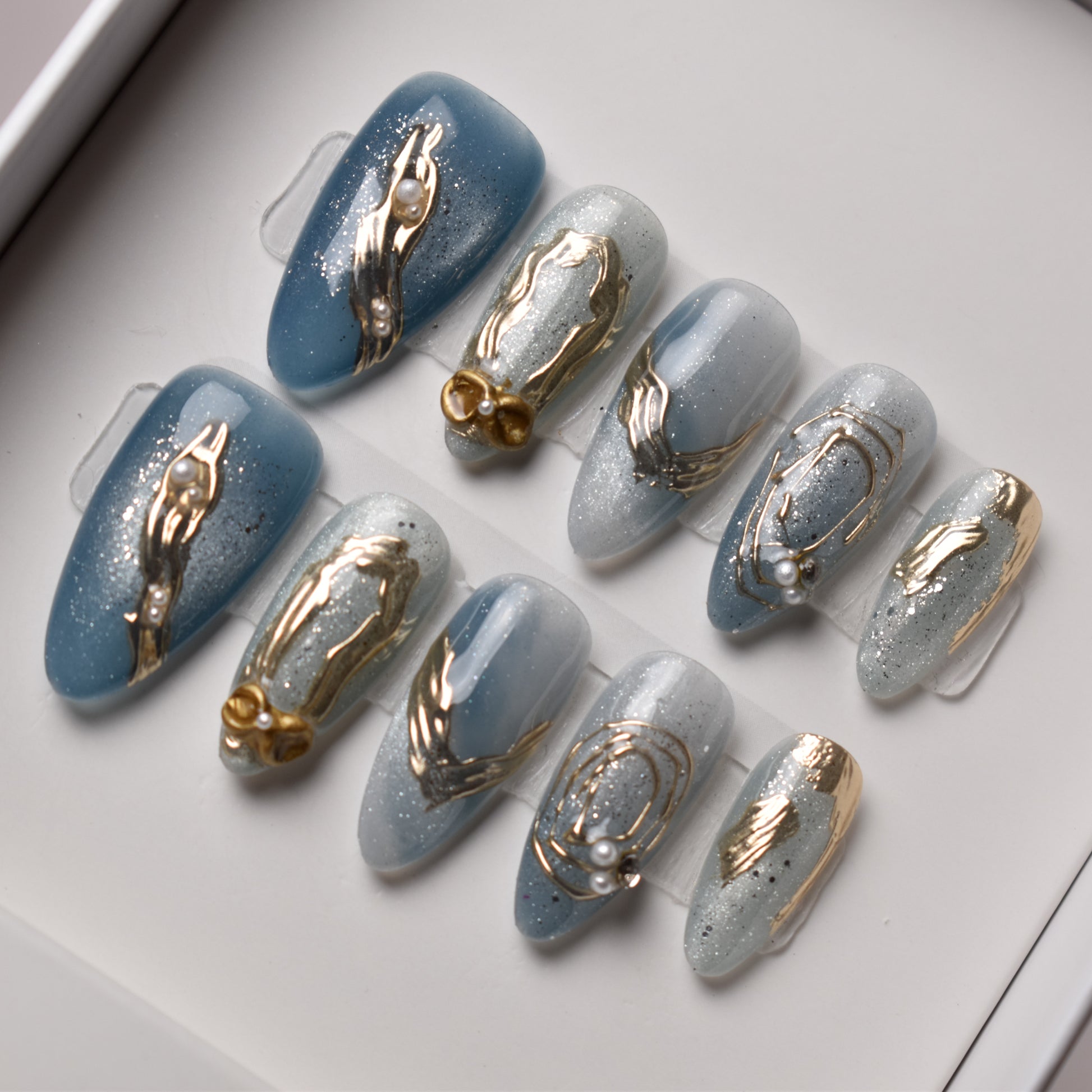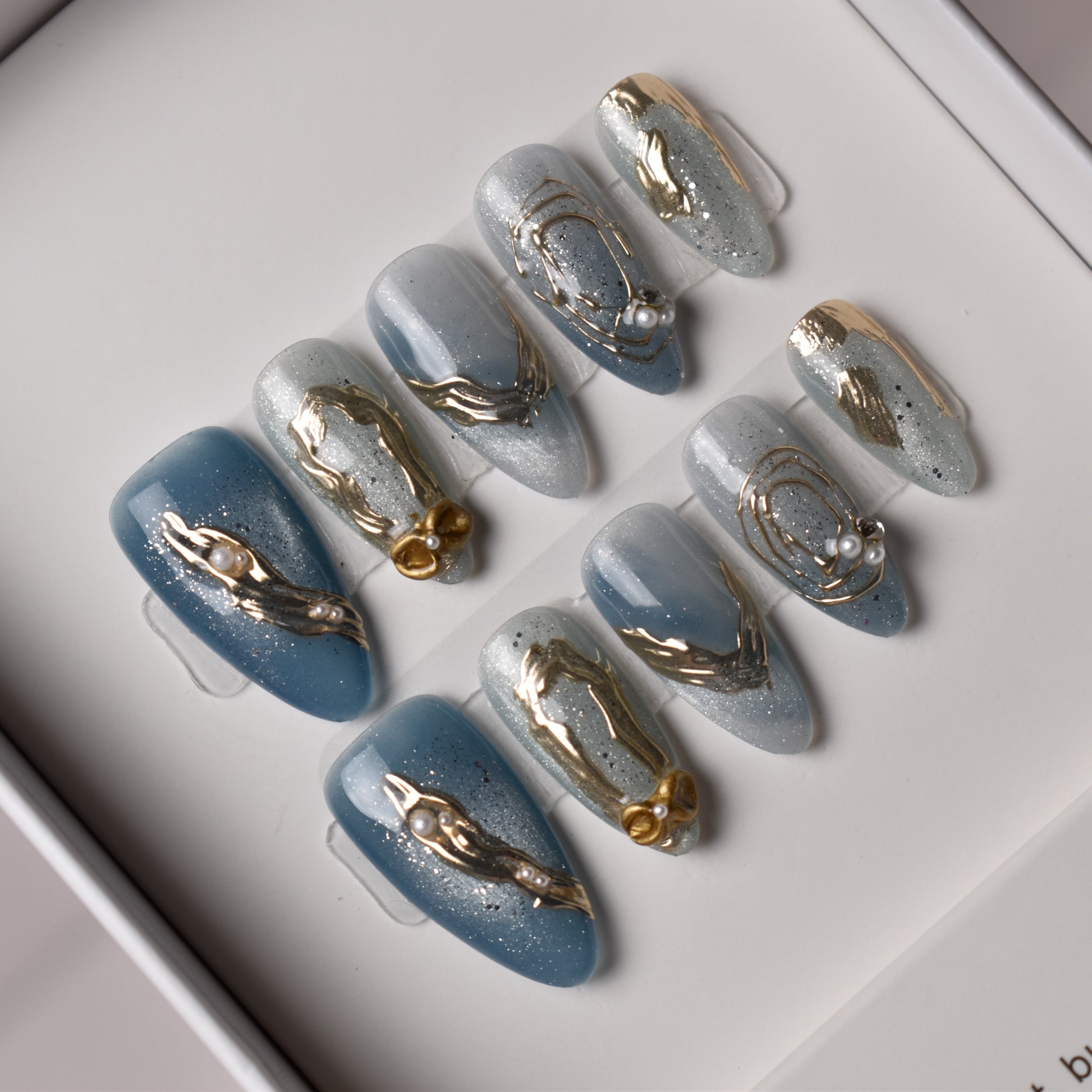 A serene gradient from ocean blue to shimmering silver forms the foundation of this elegant set, accented with gold metal frames and pearl inlays. The organic shapes evoke drifting seaweed and gentle waves, while the cool tones inspire calm confidence. Ideal for seaside soirées, boat parties, and chic summer evenings.