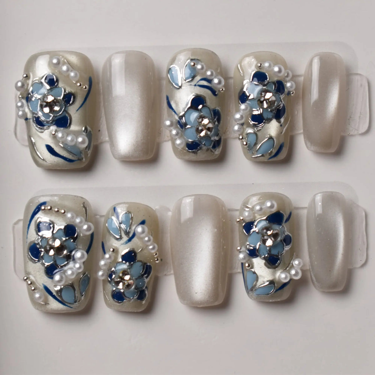 This elegant creation merges the purity of pearl white with intricate hand-painted blossoms in rich cobalt and pastel blue. Each flower is accented with silver and pearl embellishments, forming a textured, three-dimensional garden upon the nails. The interplay of cool tones and lustrous shine evokes winter frost kissed by morning sunlight. Perfect for winter weddings, evening galas, and serene moments of refined beauty.