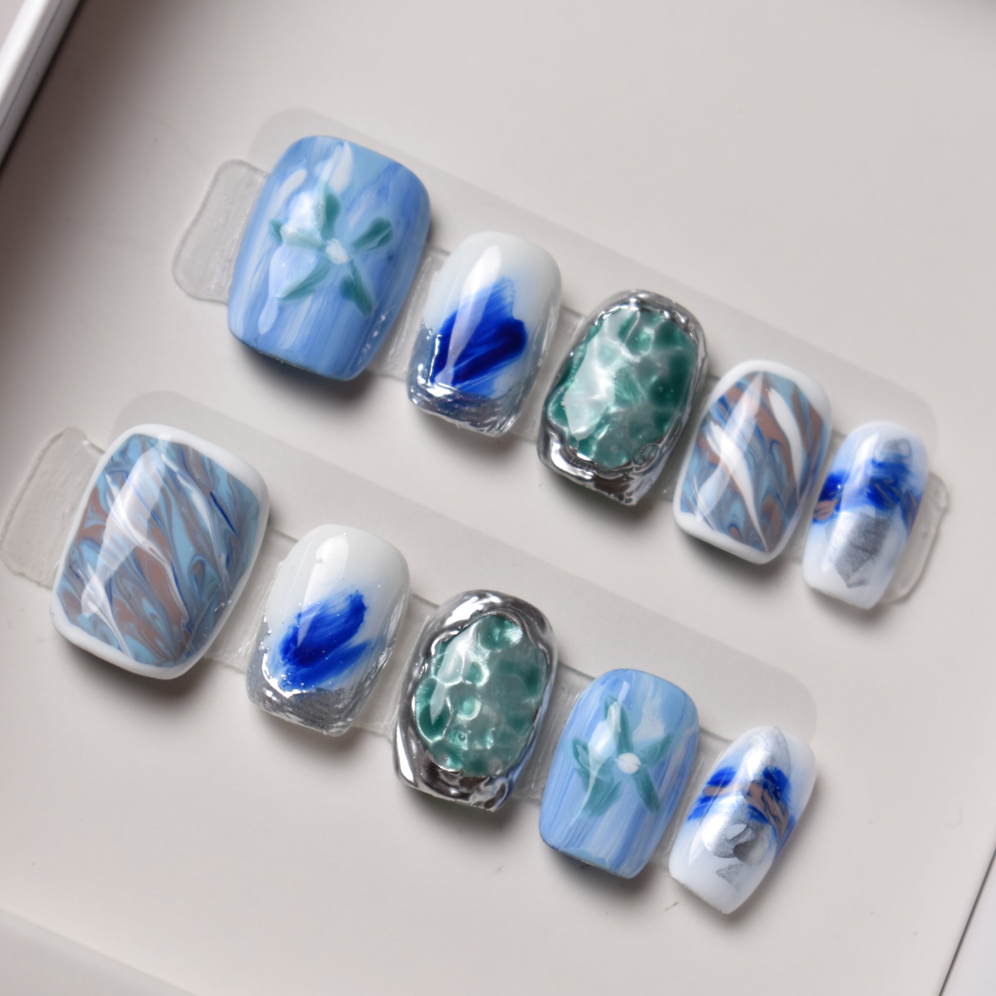 Sky-blue brushstrokes and jade-green textures are framed in silver accents, capturing the ebb and flow of ocean tides. Fresh, artistic, and invigorating, like a seaside escape.