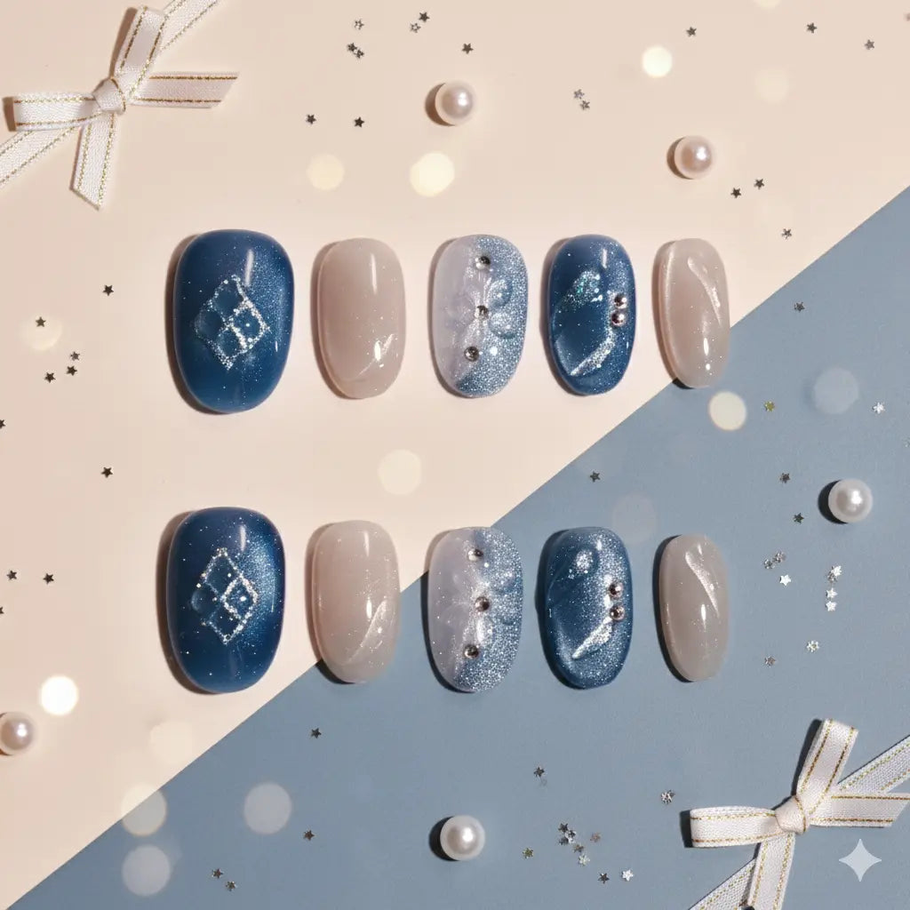 Crafted in a smooth oval shape, the set features layered translucent blues with fine shimmer, subtle sparkle accents, and delicate rhinestone details that resemble droplets suspended in motion. Soft nude accent nails provide balance and elegance, allowing the richer blues to glow without overwhelming the set.