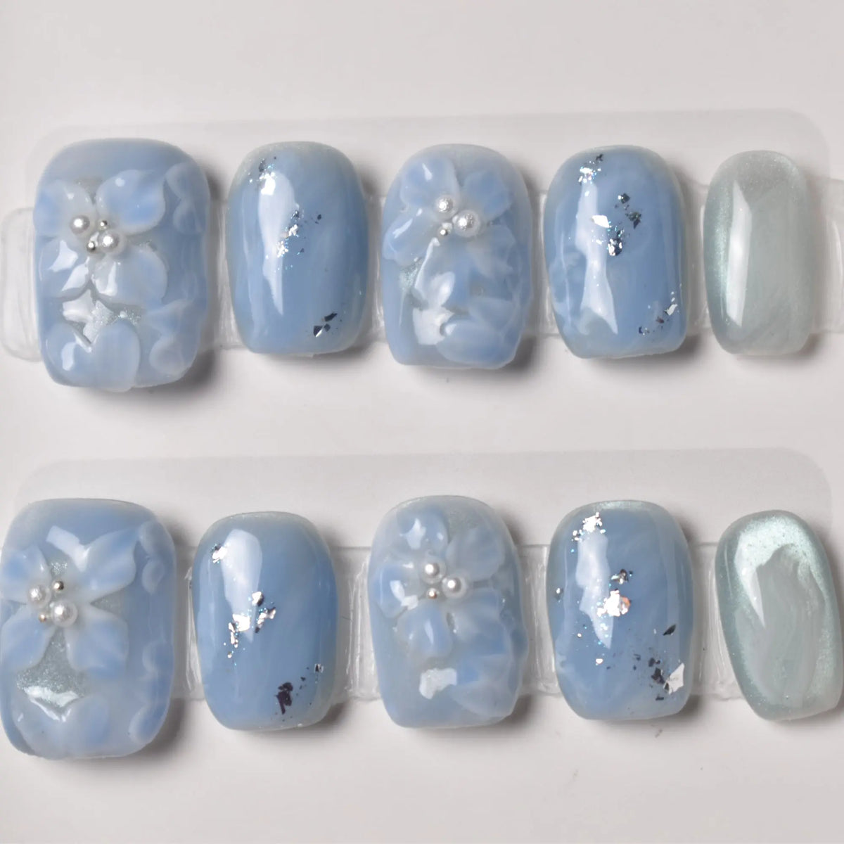 Gentle sky blues flow into pearly whites, kissed with silver leaf and soft floral sculptures. The serene palette evokes fresh spring mornings, where dew sparkles on delicate petals. Perfect for weddings, garden parties, and days filled with light.
