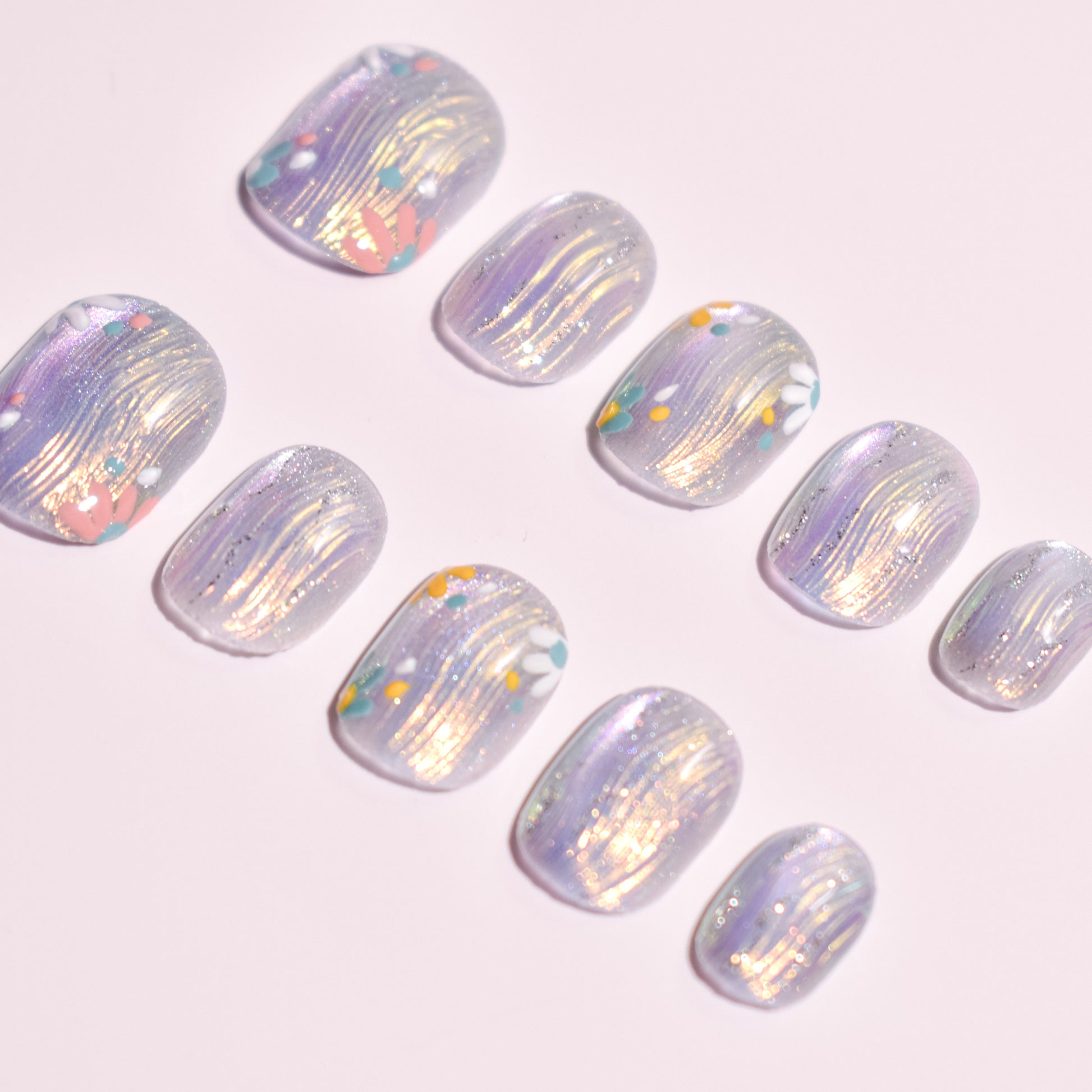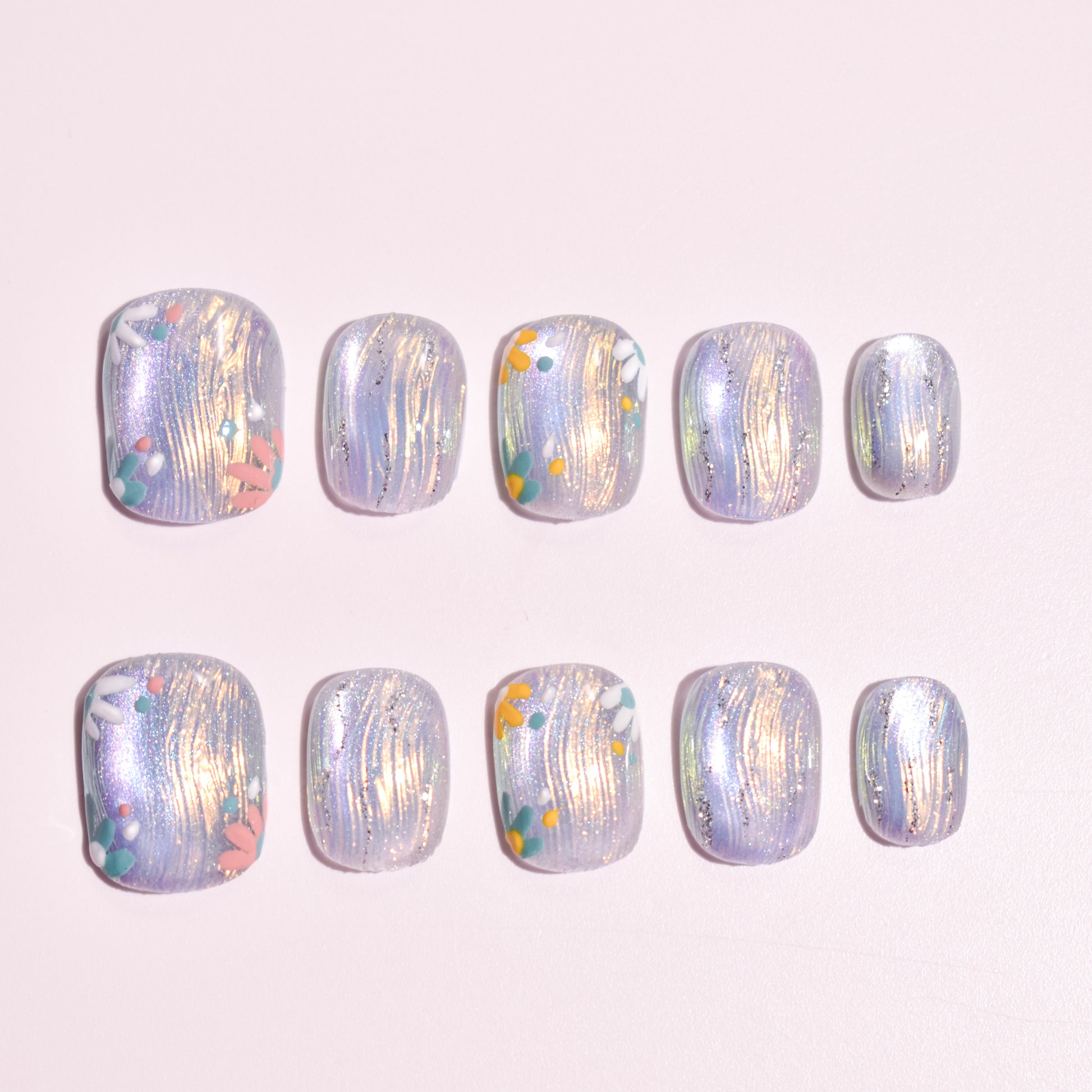This design features a luminous lavender-blue base with fine pearlescent shimmer, layered with subtle vertical metallic strokes that catch the light beautifully. Delicate pastel floral accents in soft yellow, mint, blush, and white add a playful yet refined touch, creating a dreamy, airy aesthetic. The short oval shape offers a natural, wearable silhouette that’s perfect for everyday elegance.