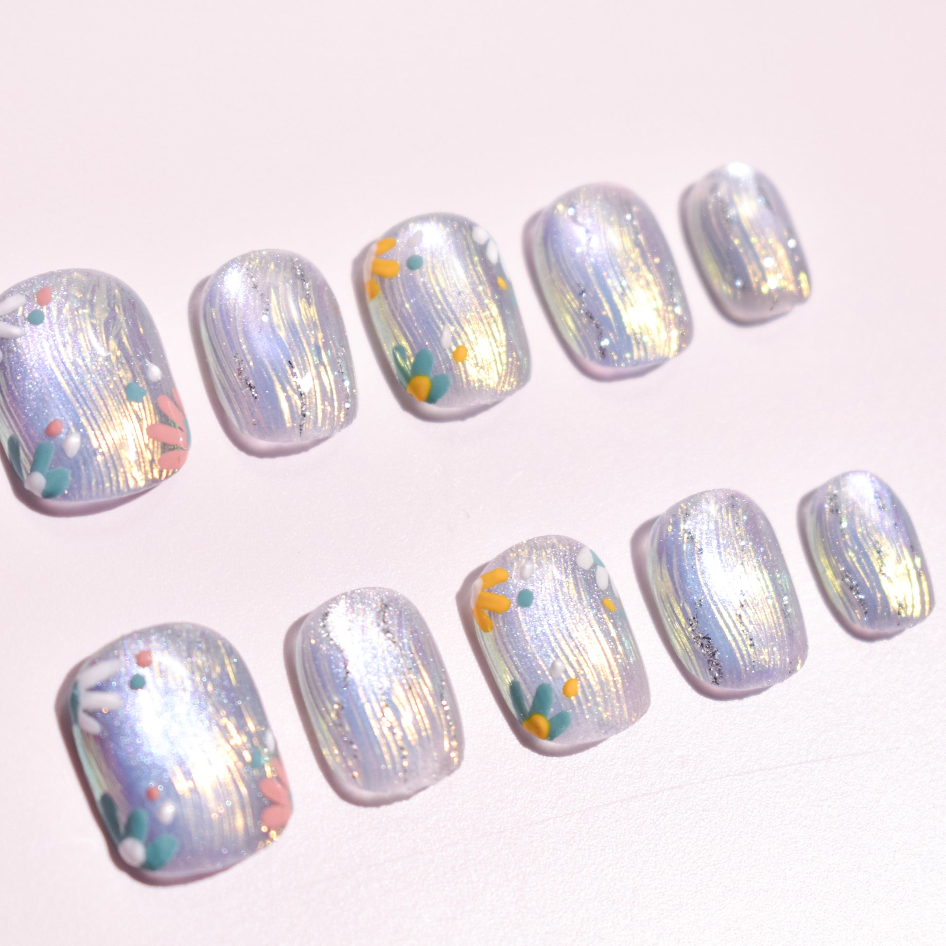 Aurora Meadow is a handcrafted short oval press-on nail set inspired by soft daylight, iridescent shimmer, and scattered pastel florals.