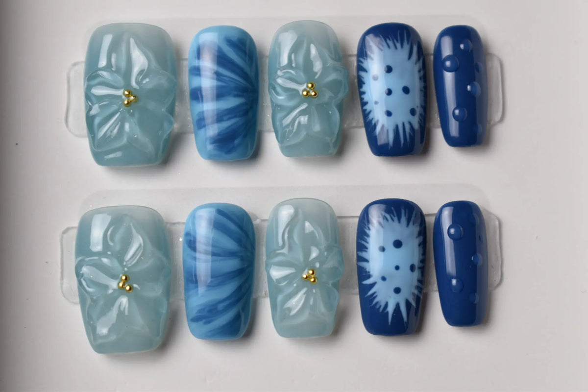 This serene set blends soft nude and white tones with delicate sky-blue marbling at the tips, outlined in fine silver glitter for an elegant finish. Two accent nails feature hand-sculpted 3D blue flowers with gold bead centers, evoking the calm beauty of blossoms against a clear spring sky. The combination of airy colors and subtle shimmer creates a refined, peaceful look that feels both fresh and timeless.