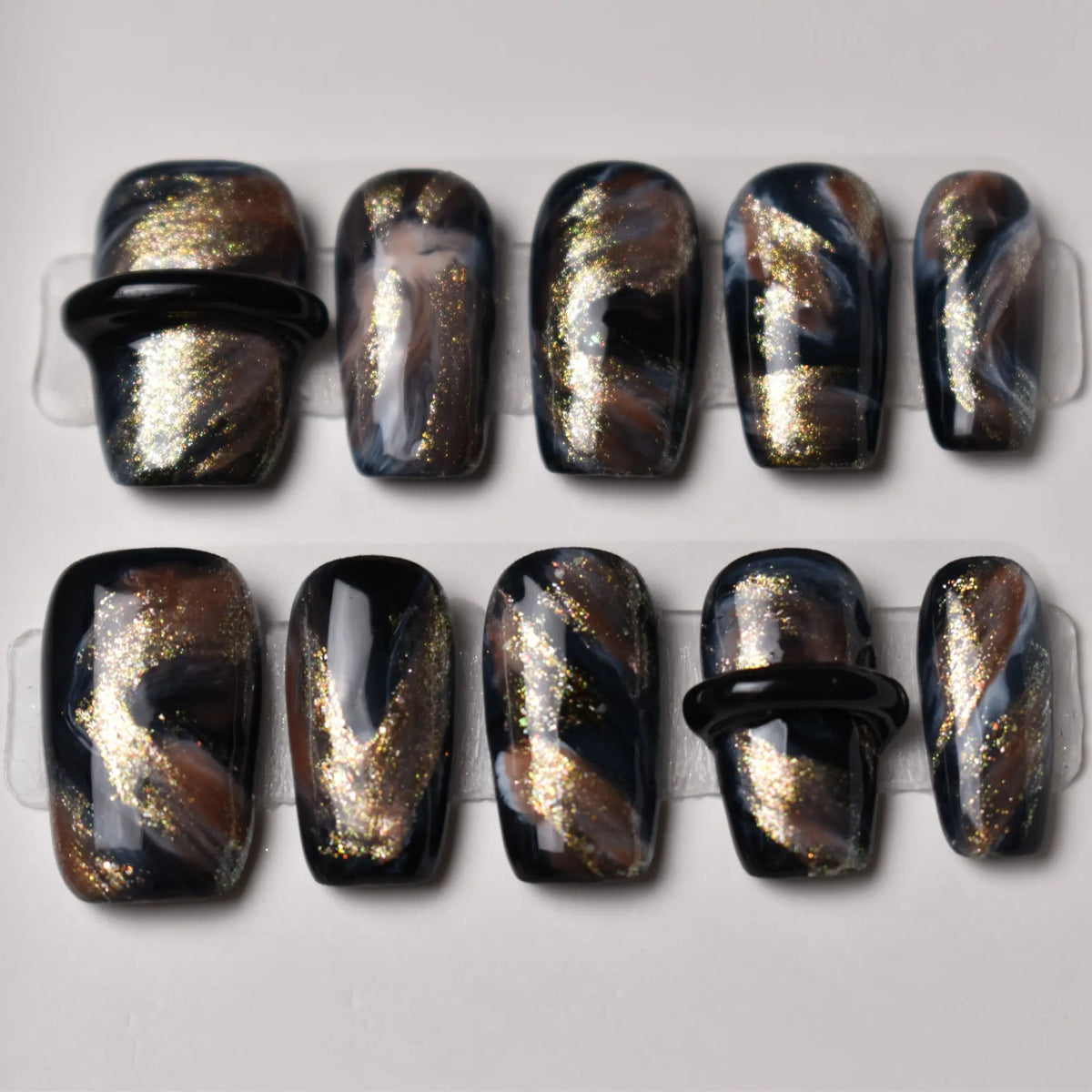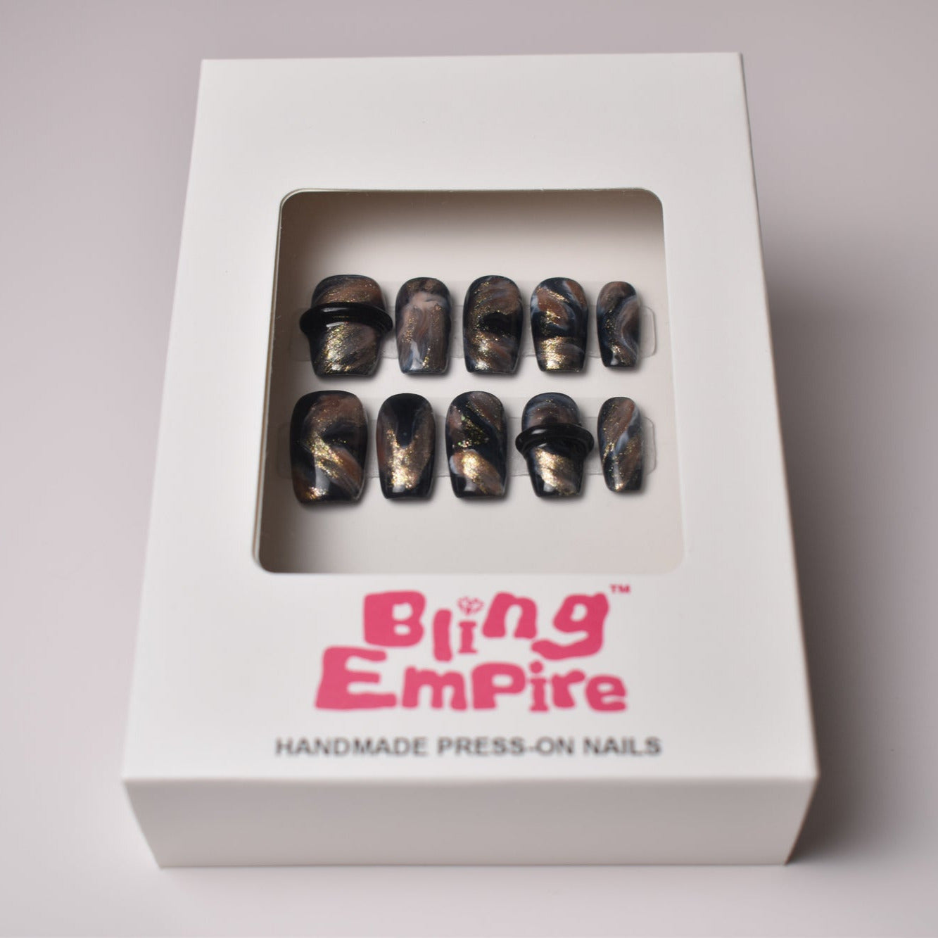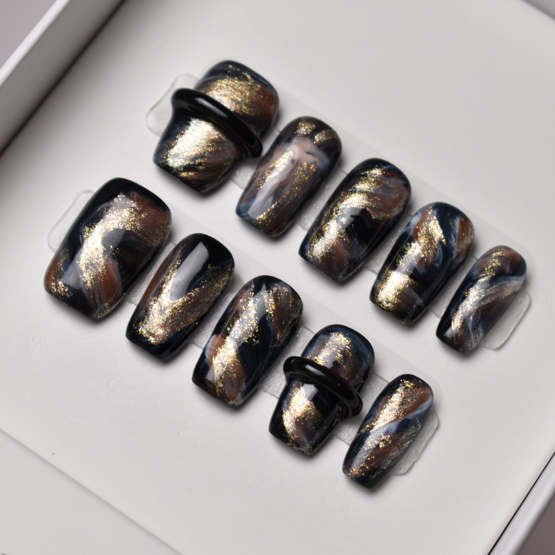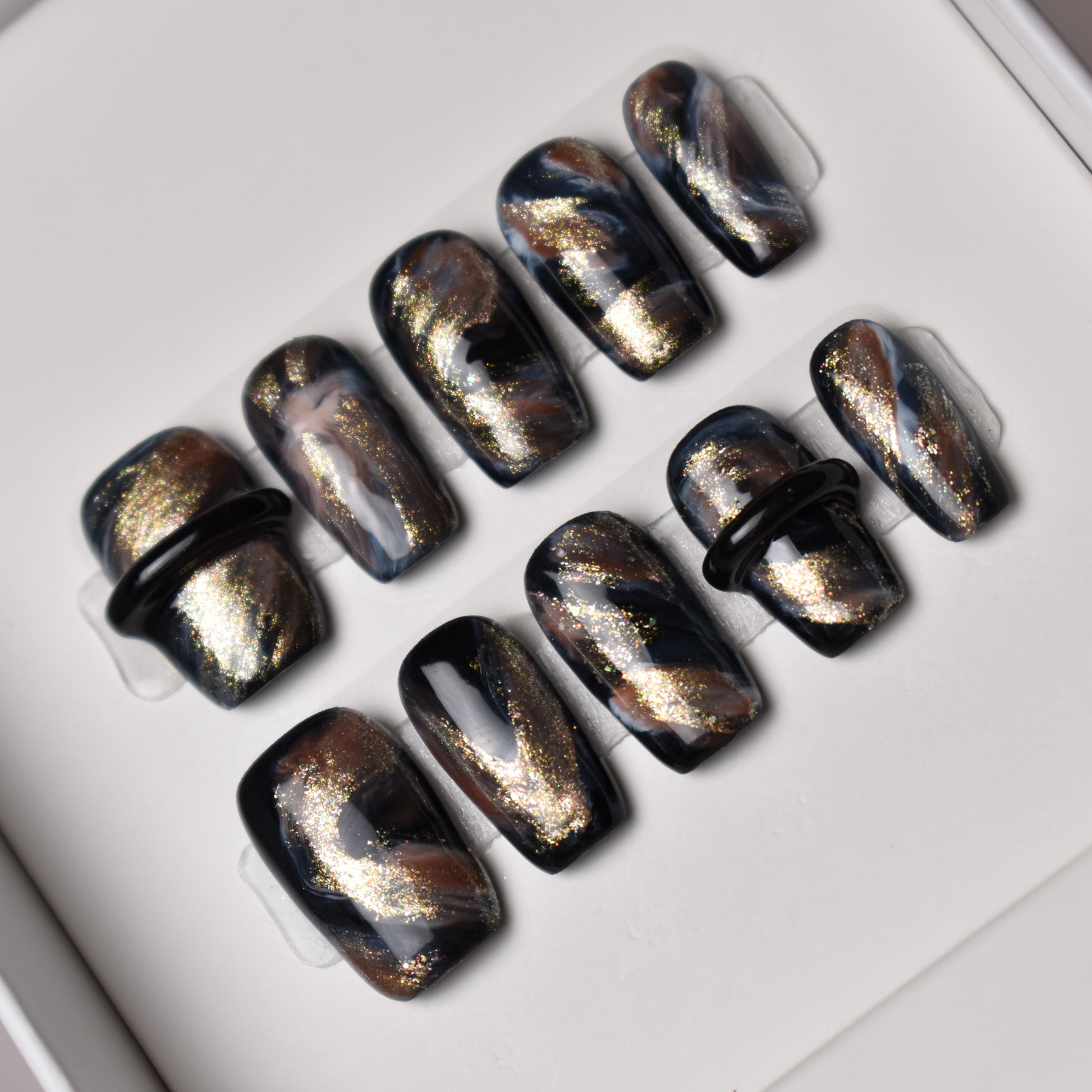 Bold, mysterious, and effortlessly chic, our Yoru no Kage press-on nail set captures the allure of a starless night sky. Deep black and smoky swirls are intertwined with shimmering bronze and gold accents, creating a marbled effect that’s both dramatic and refined. Statement black ring embellishments on select nails add a high-fashion edge, making this set perfect for trendsetters who love a touch of avant-garde style.