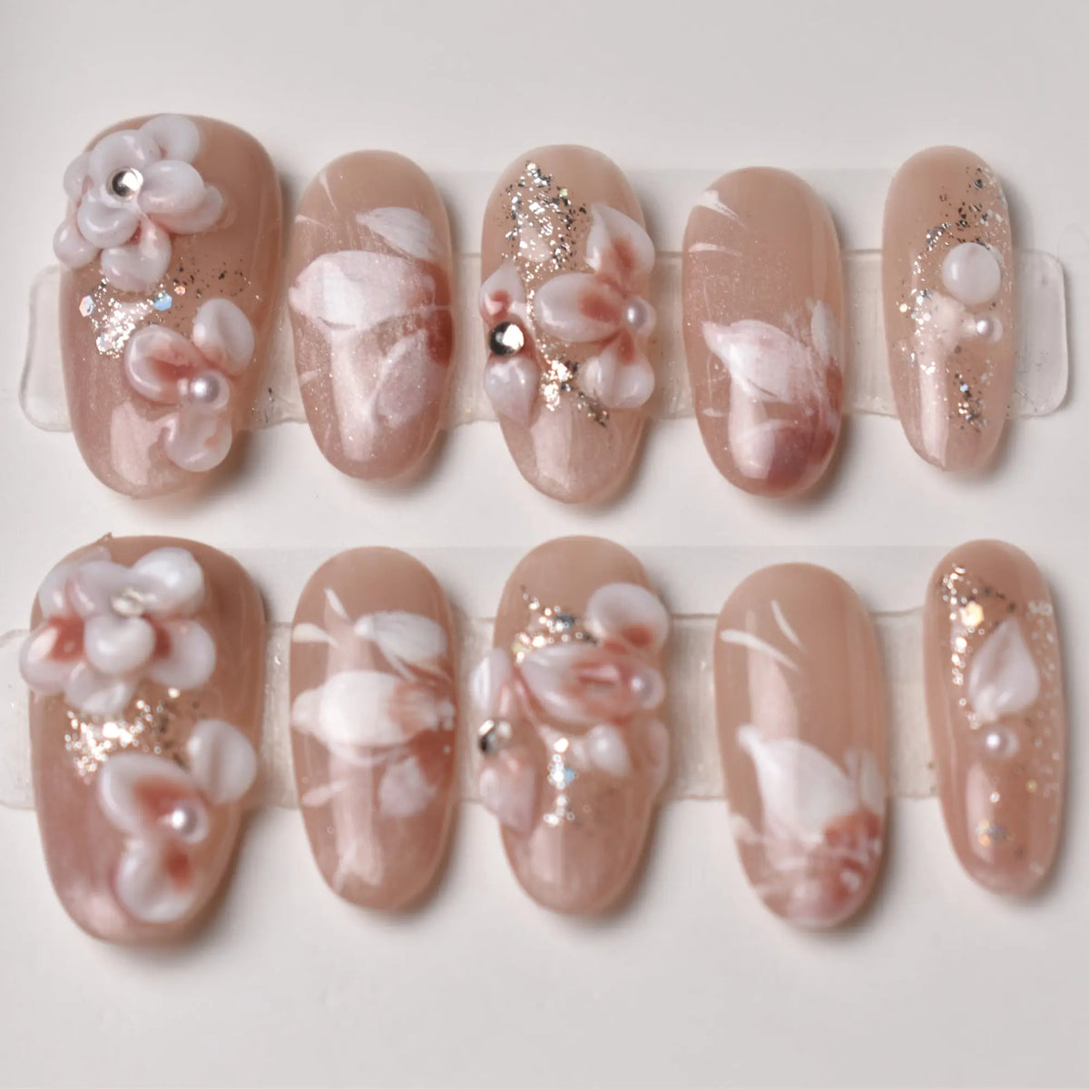 Soft, romantic, and delicately luxurious, our Hōjun Sakura press-on nail set evokes the beauty of sakura petals drifting in a gentle spring breeze. A warm nude base is adorned with hand-painted white-and-blush petals, shimmering glitter accents, and 3D floral blossoms with pearl and crystal centers. The layered textures and soft color palette make this set both timeless and versatile—perfect for Eastern elegance and Western chic.