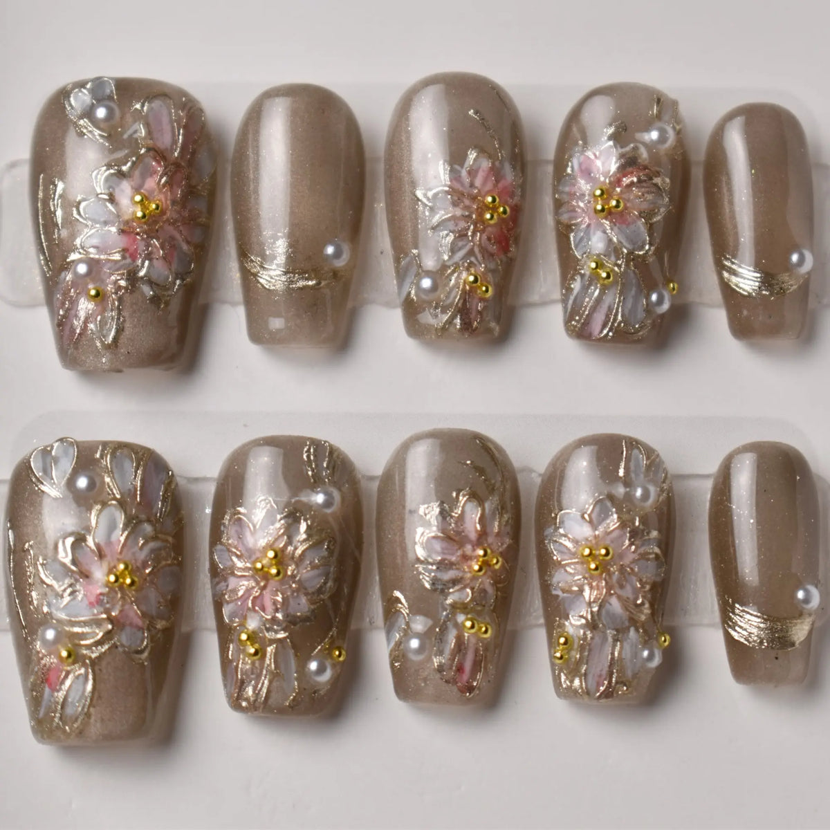 Elegant and soothing, our Kōcha Sakura press-on nail set blends the warmth of earthy tea tones with the delicate beauty of cherry blossoms. A shimmering taupe base is adorned with hand-painted pink-and-white sakura petals outlined in gold, accented with pearl beads and golden centers for a refined touch. Crafted in a chic coffin shape, this design feels like a peaceful afternoon in a Kyoto teahouse, yet sophisticated enough to shine at Western formal events.