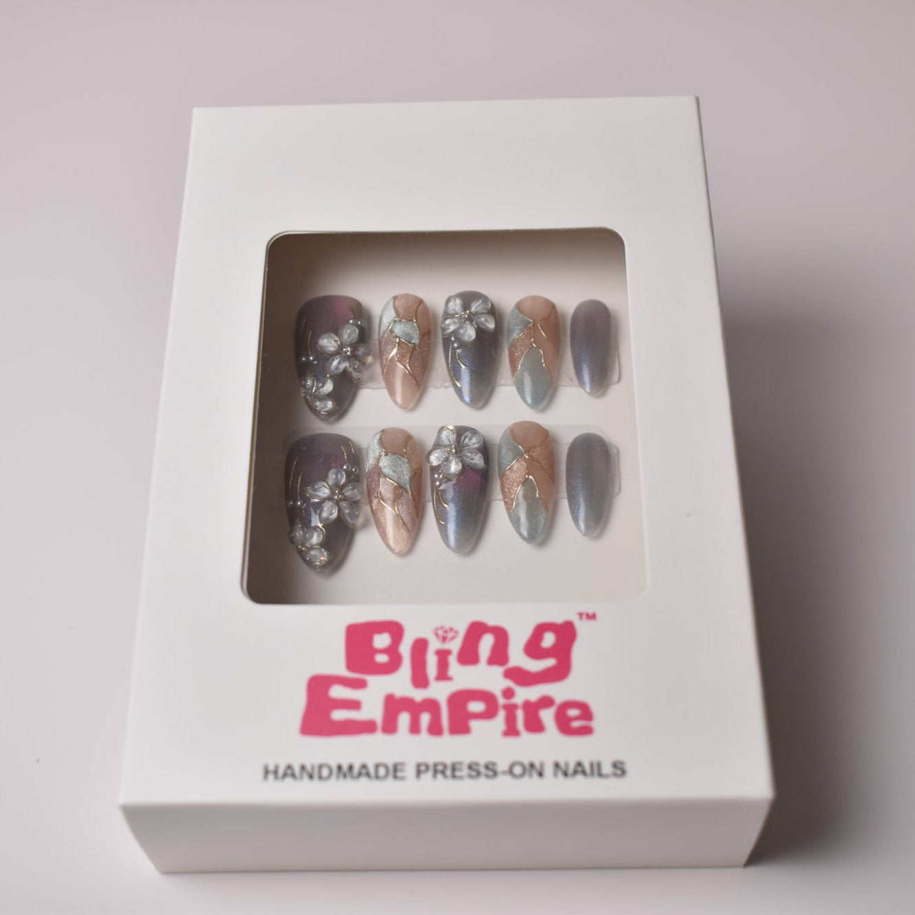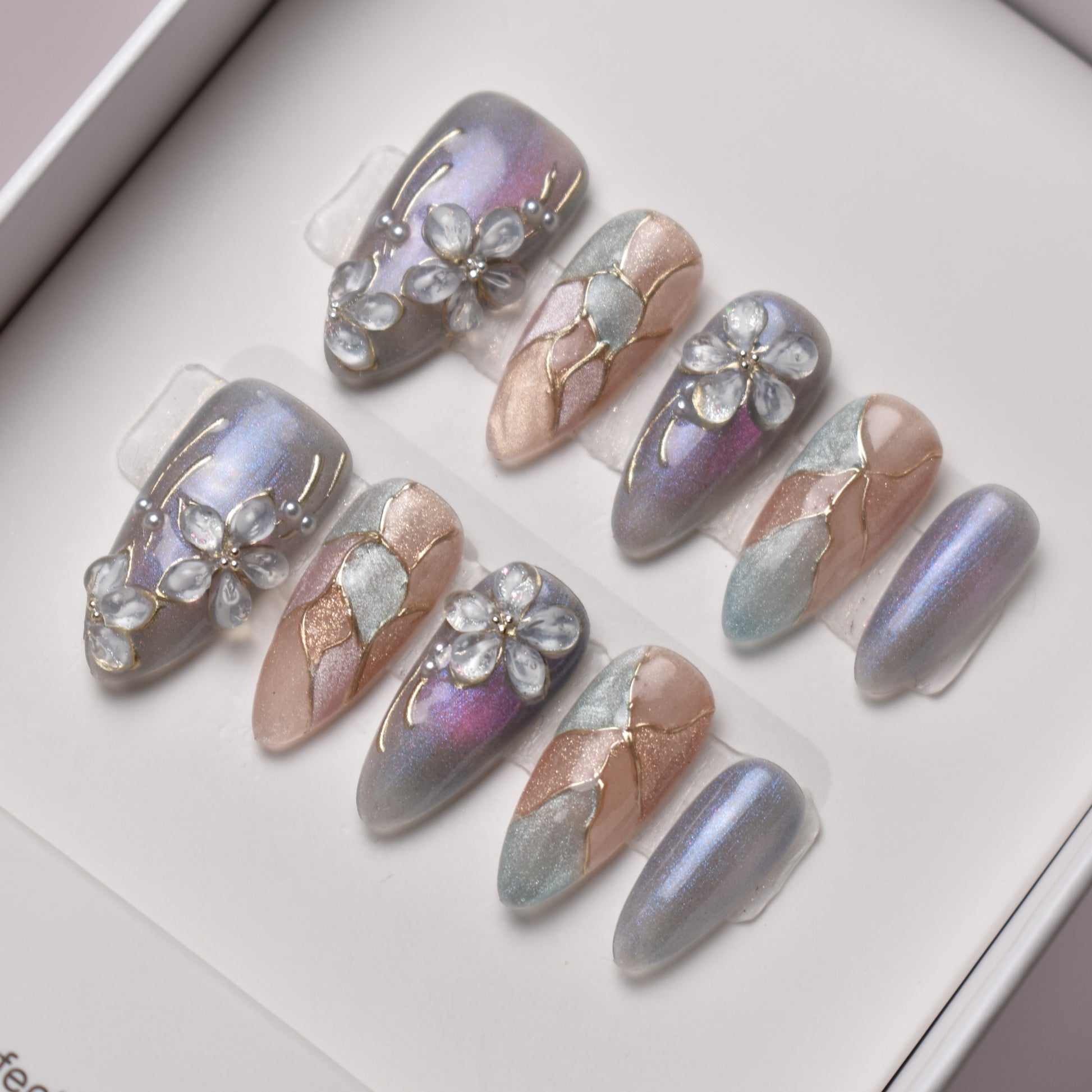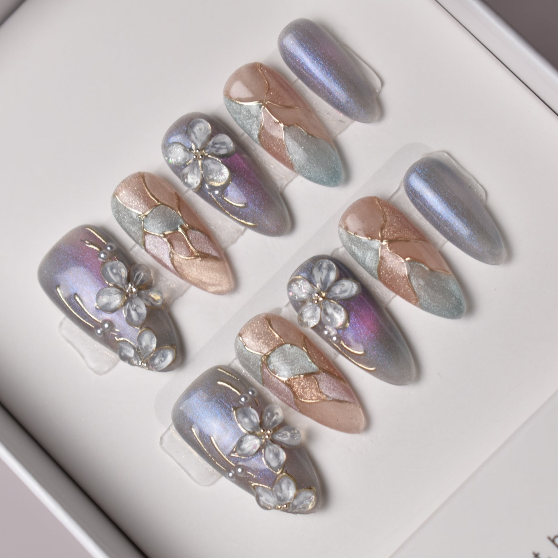 Elegant and deeply symbolic, our Kintsugi no Sakura press-on nail set is inspired by the Japanese art of kintsugi—repairing broken pottery with gold to celebrate its history and beauty. Soft gradients of mauve, blue, and champagne are “mended” with delicate gold lines, creating a mosaic effect. 3D crystal-like cherry blossoms and pearl accents add a touch of femininity and grace, making this design a wearable expression of resilience and artistry.