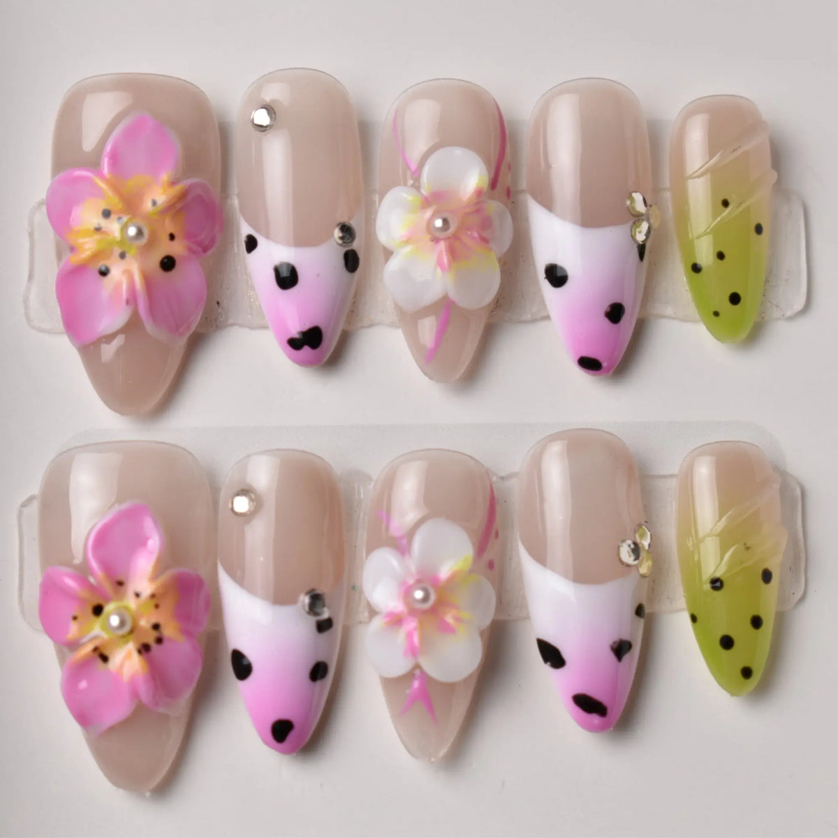 Bright, cheerful, and full of life, our Natsuiro Hanabira press-on nail set captures the playful energy of a Japanese summer festival. Featuring a glossy nude base with vibrant pink-to-white gradients, pops of lime green, and fun black speckles, this design feels like summer fruit and sunshine. 3D blossoms with pearl centers and sparkling rhinestones add a touch of festive glamour, making it perfect for warm-weather adventures.