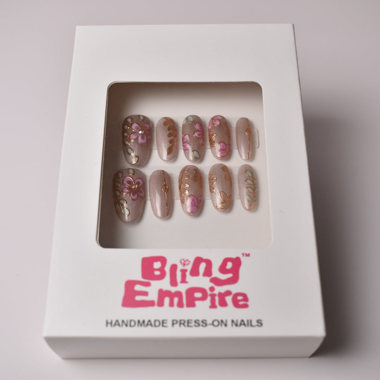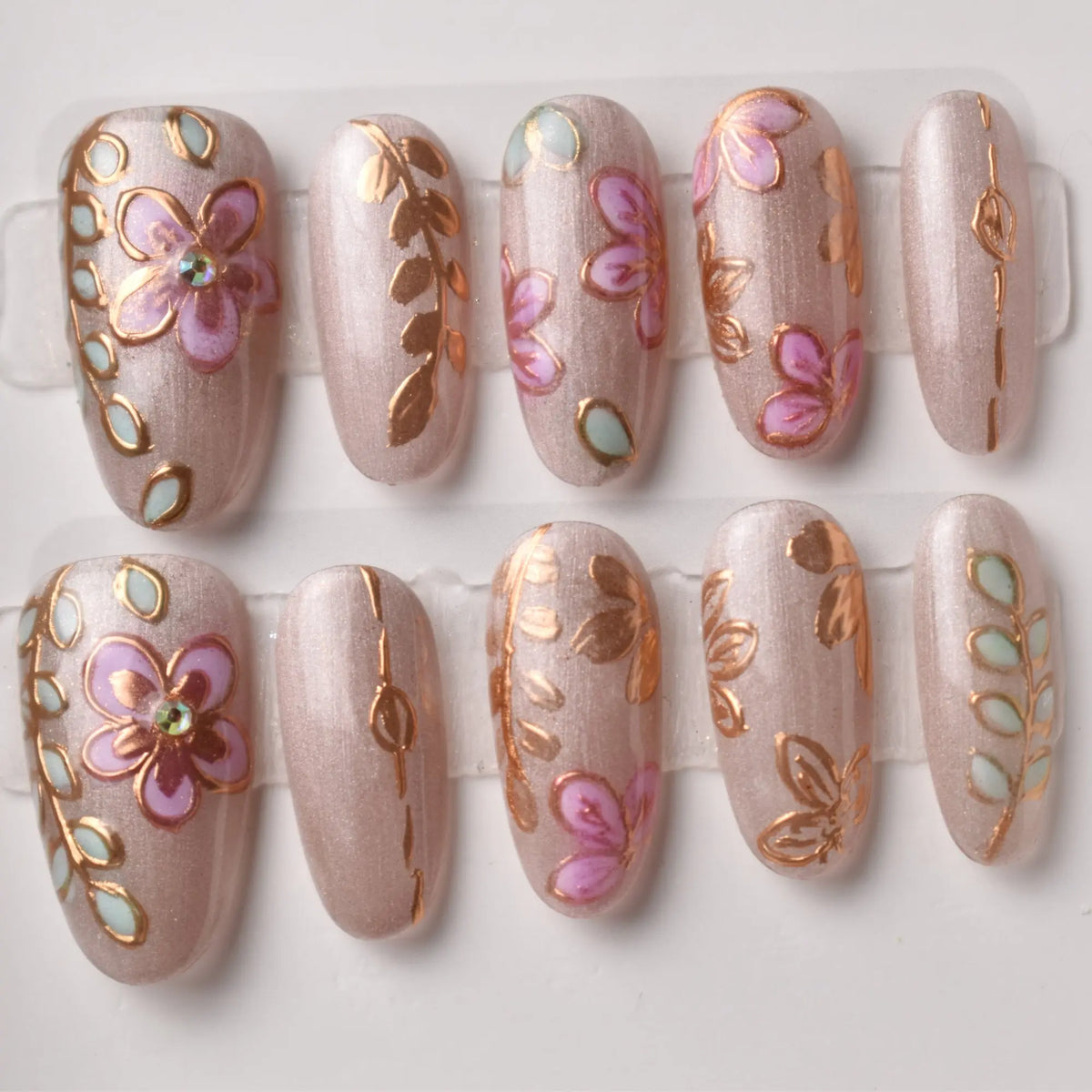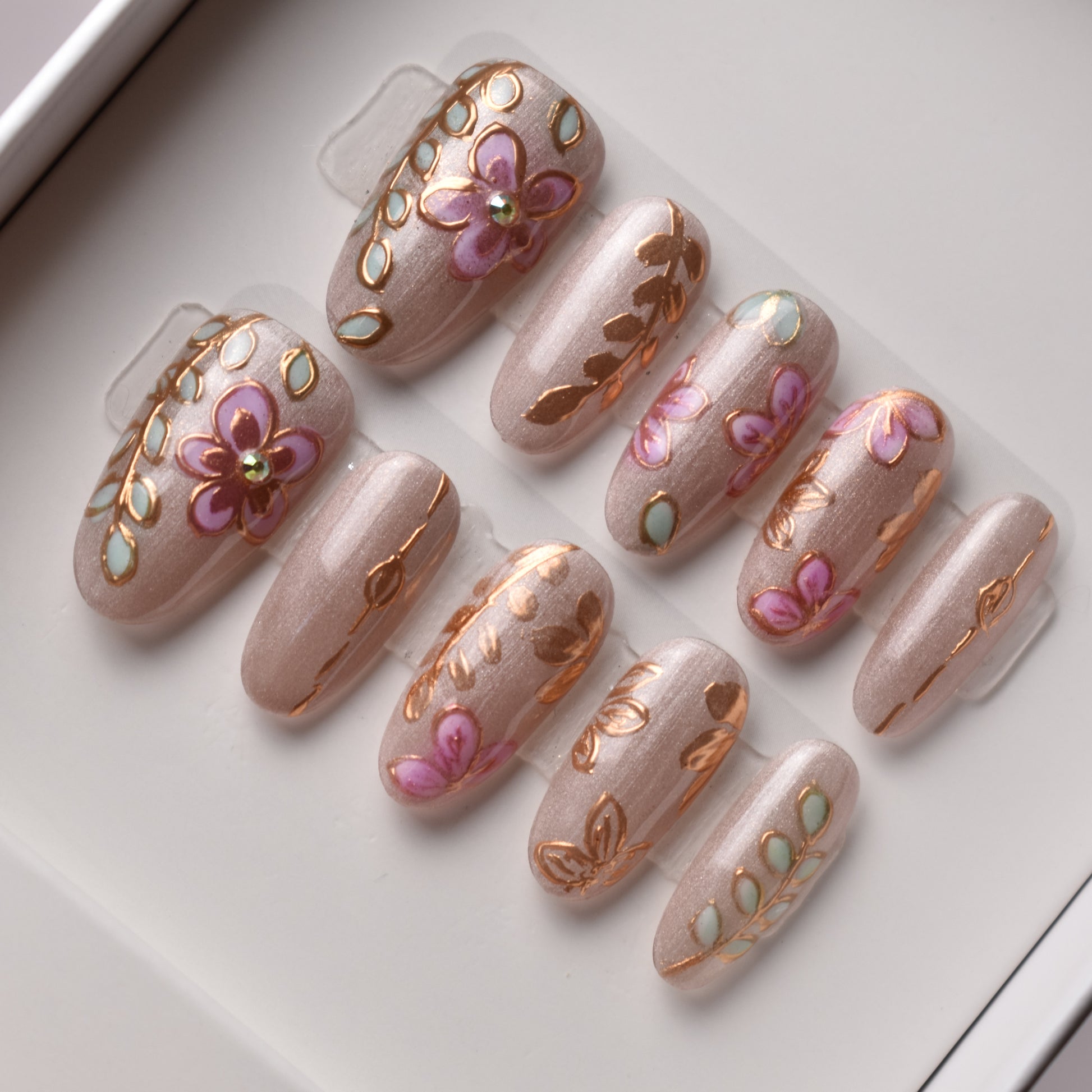 Elegant and artistic, our Kinbyōe no Hana press-on nail set draws inspiration from traditional Japanese folding screens (byōbu) adorned with golden floral paintings. A soft champagne base is detailed with hand-painted blossoms in shades of pink and lavender, outlined in gleaming gold. Delicate green and gold leaf motifs add depth and a touch of refined opulence, making this set a wearable work of art.