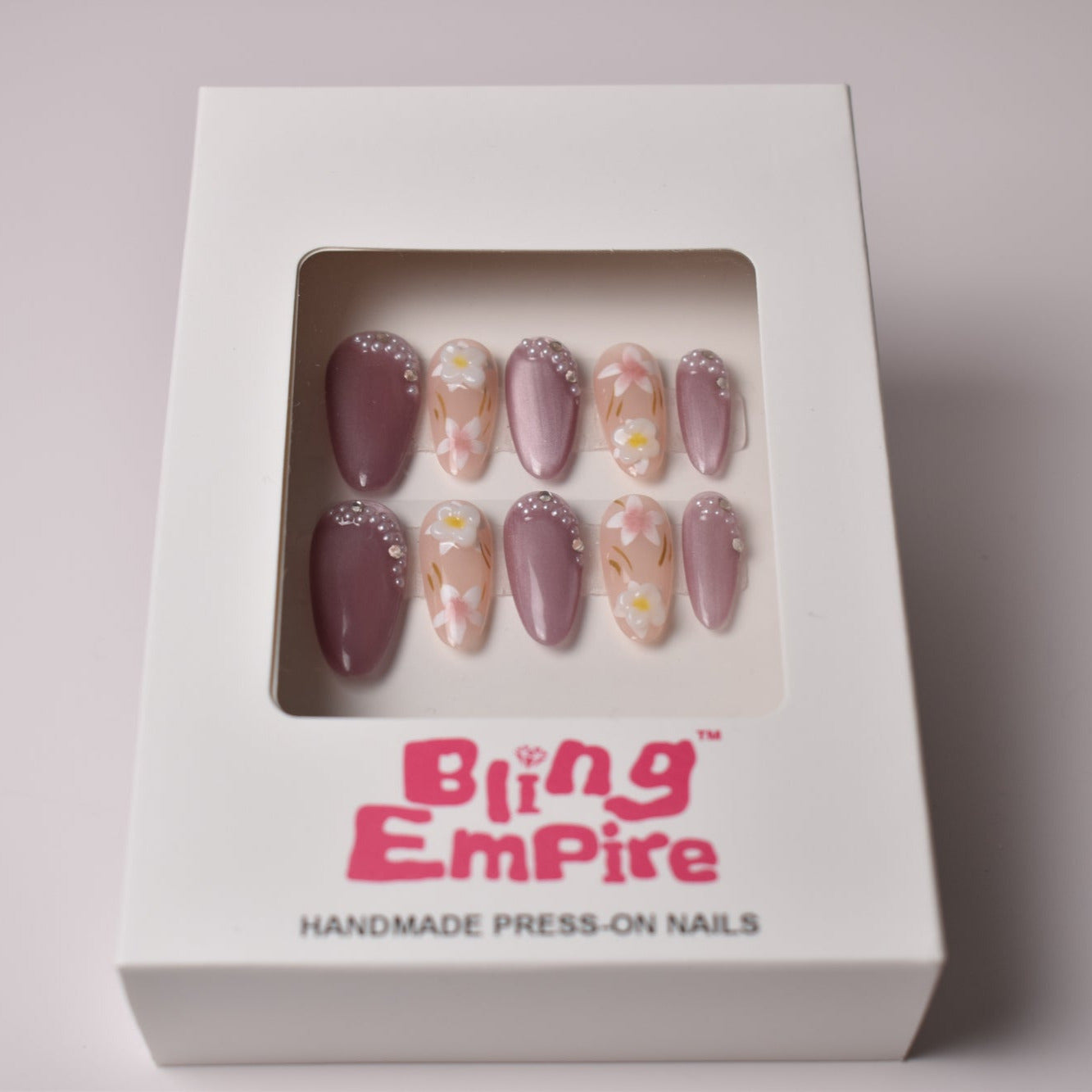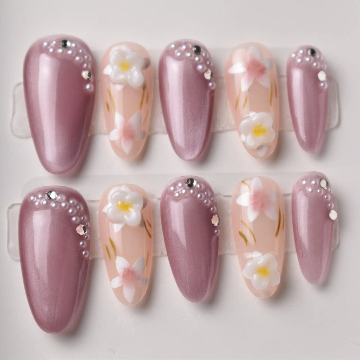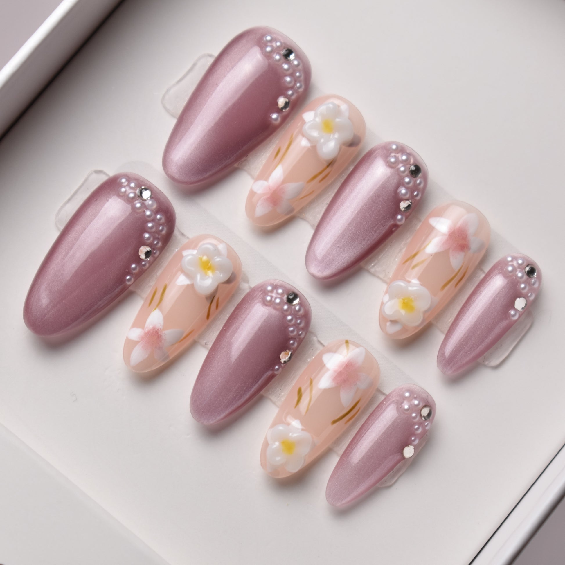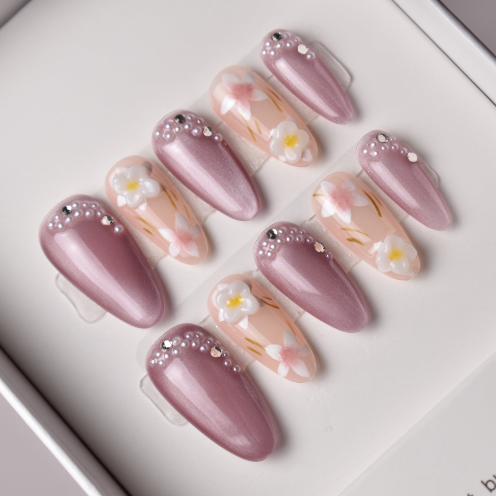 Elegant and feminine, our Ume no Shirabe press-on nail set is inspired by the delicate beauty of blooming plum blossoms in early spring Japan. A graceful mauve-pink shimmer pairs with soft nude nails adorned with 3D white blossoms, each with a sunny yellow center. Pearl accents and rhinestones add a refined sparkle, making this design a perfect harmony of traditional floral charm and modern sophistication.