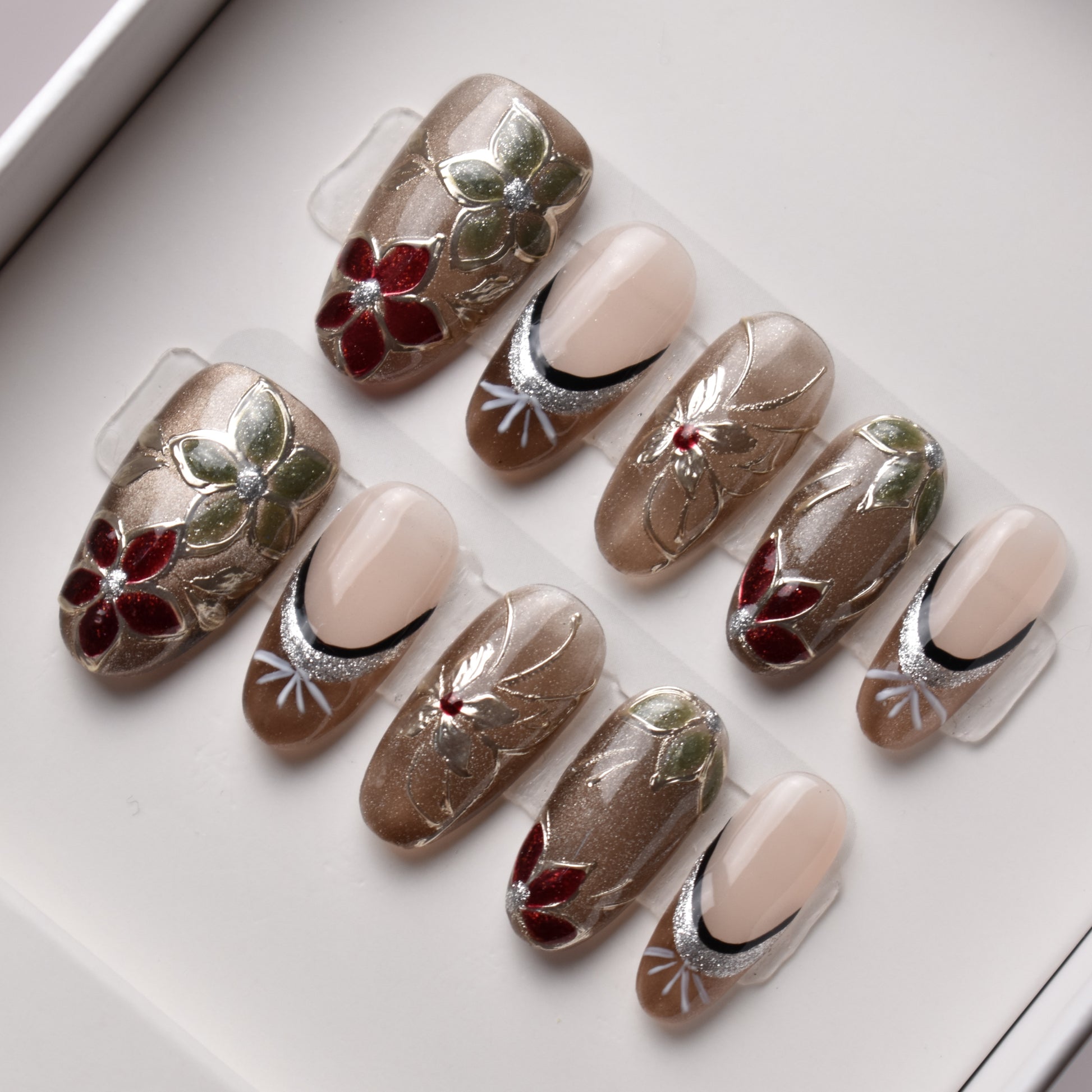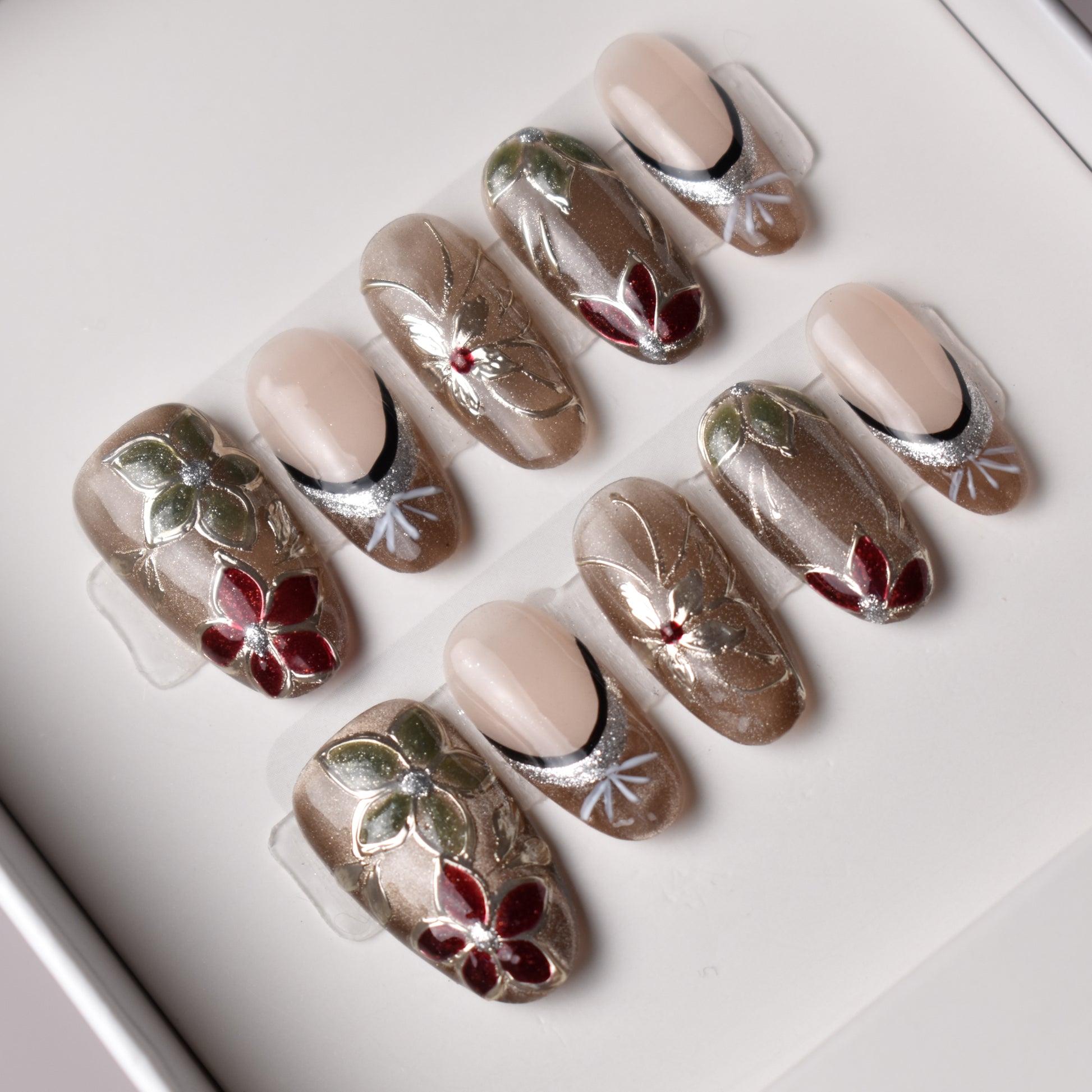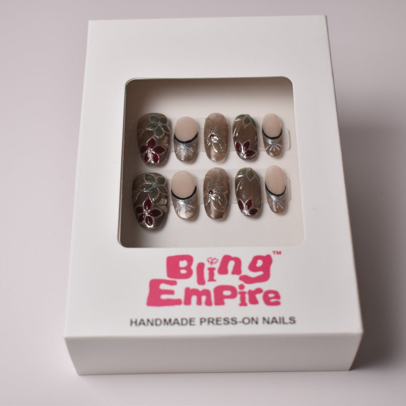 - 10 uniquely designed, hand-painted press-on nails made with high-quality UV gel.