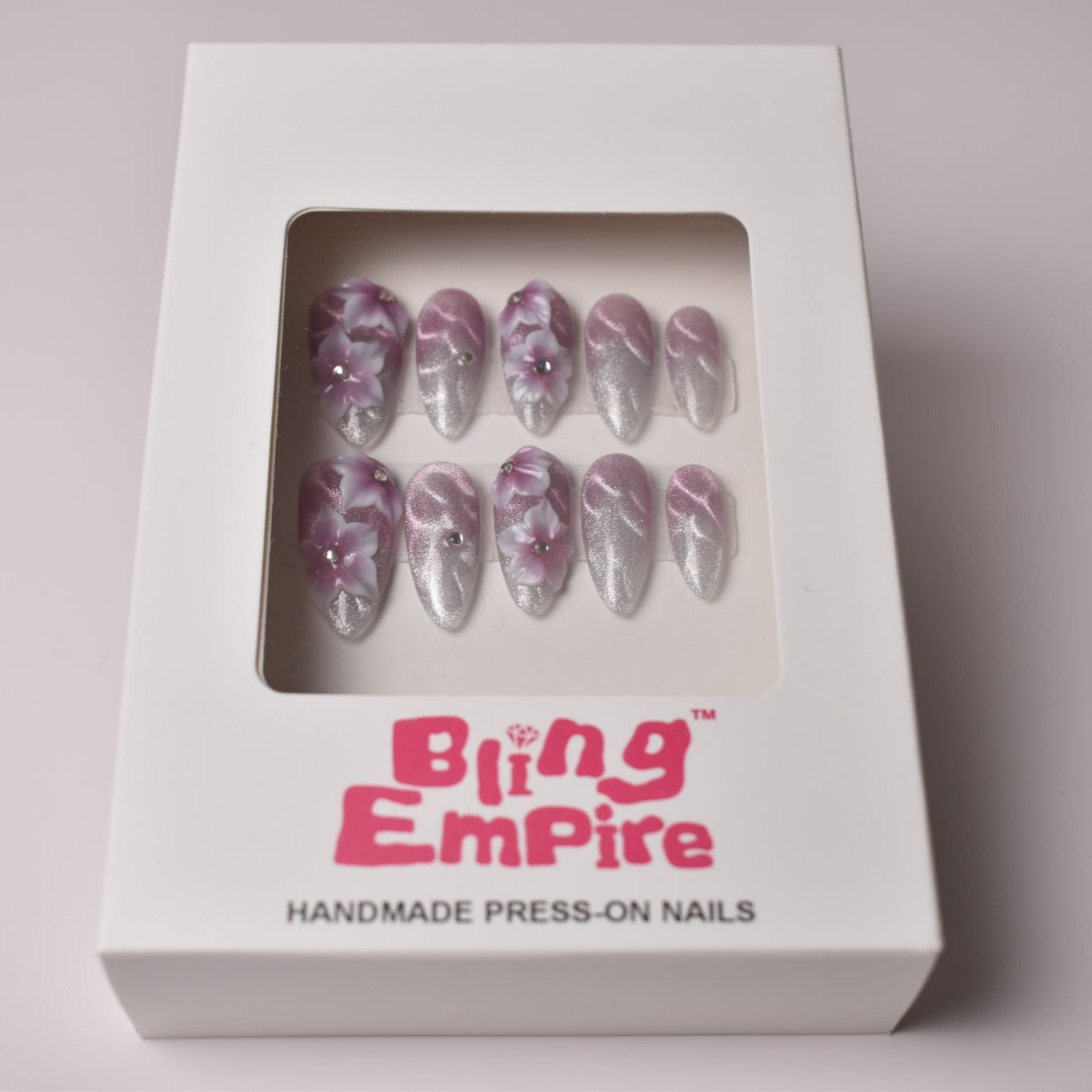 - 10 uniquely designed, hand-painted press-on nails made with high-quality UV gel.
