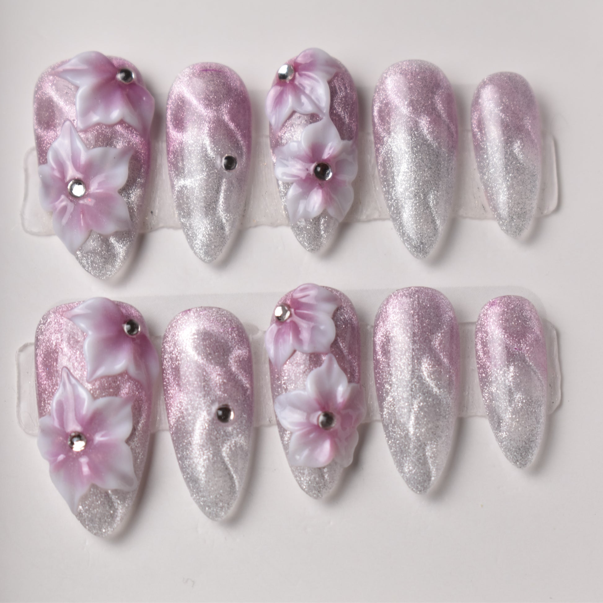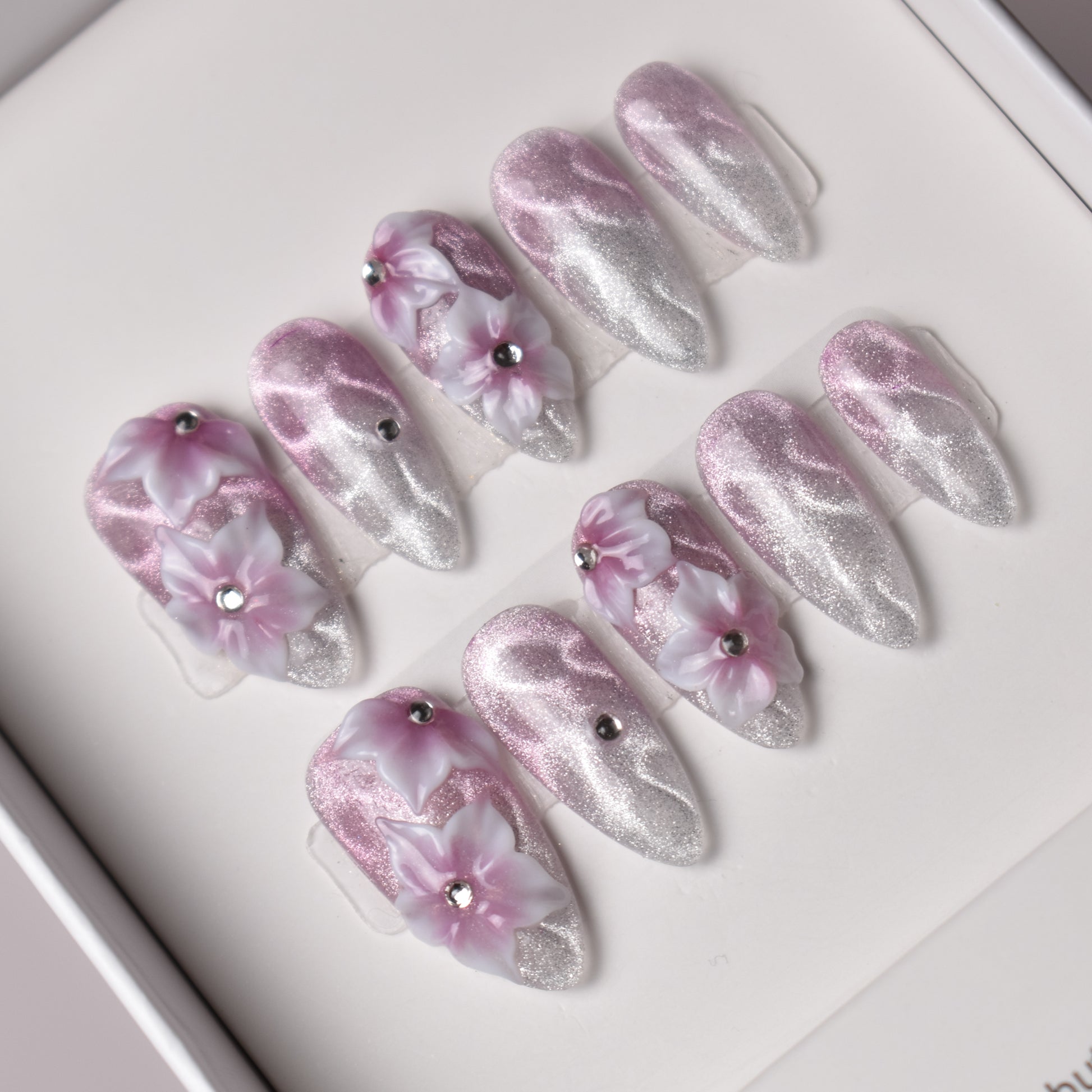 Finish: Glitter gradient with 3D floral accents & rhinestones