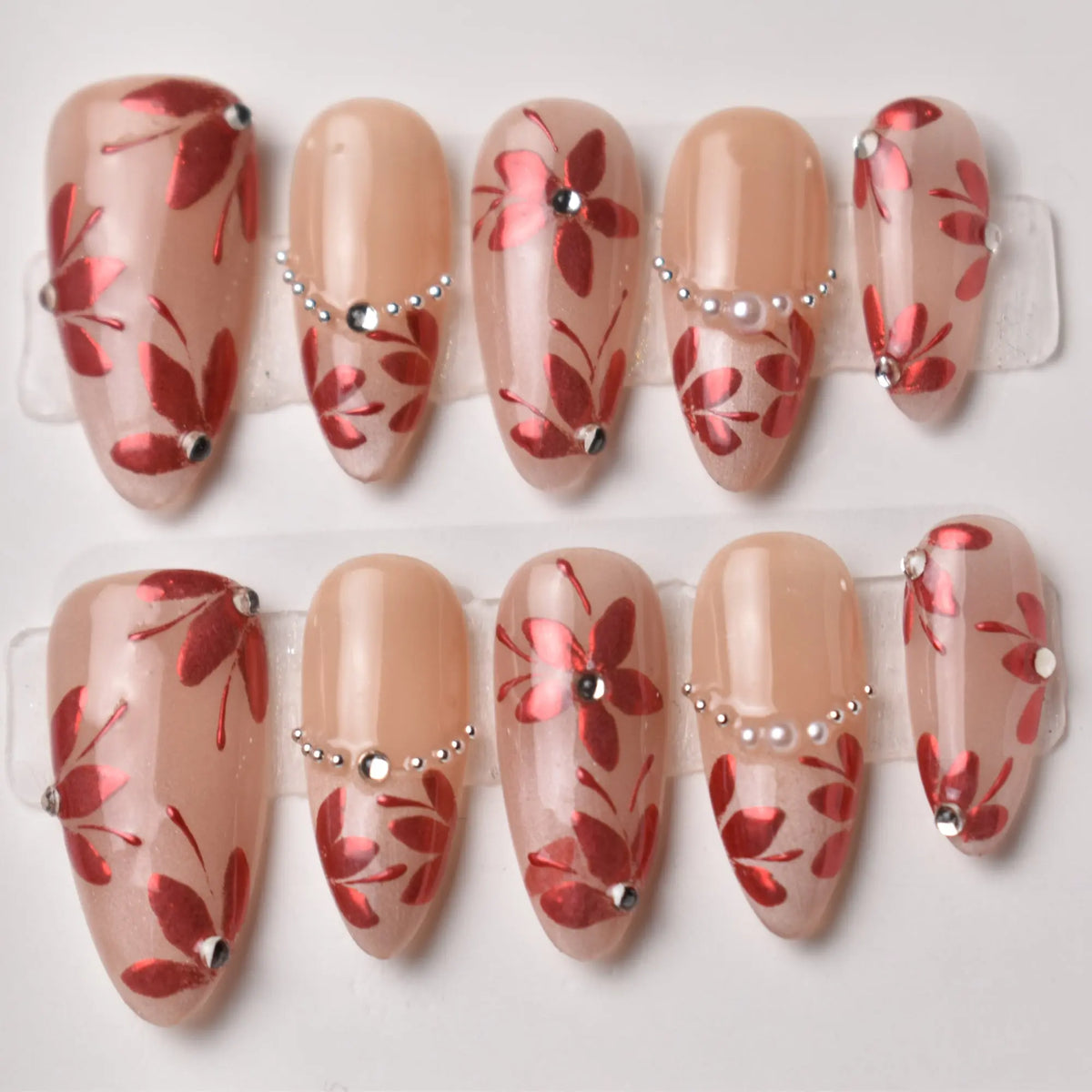 Romantic and bold, our Akahana no Koi press-on nail set channels the elegance of Japanese floral motifs with a modern twist. A soft nude base provides the perfect canvas for striking metallic red blossoms, each petal outlined for depth and shimmer. Sparkling rhinestones and pearls add a touch of glamour, creating a look that’s both sophisticated and eye-catching. This design draws inspiration from traditional Japanese patterns often seen in kimonos, reimagined for contemporary wear.