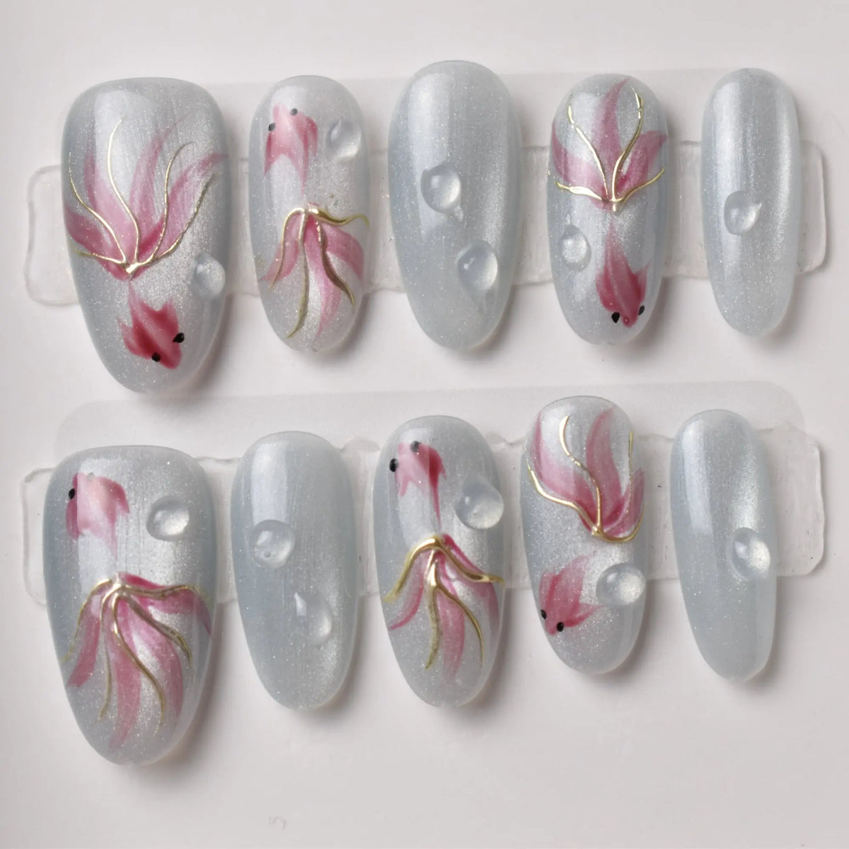 Delicate and serene, our Kingyo no Mai press-on nail set is inspired by the graceful movement of goldfish in a Japanese summer festival pond. Set against a soft shimmering silver-blue base, each nail features hand-painted red-pink goldfish with flowing fins outlined in gold, creating an elegant sense of motion. Clear water droplet accents bring a realistic, refreshing touch—perfect for evoking the beauty of traditional kingyo-sukui goldfish scooping games.