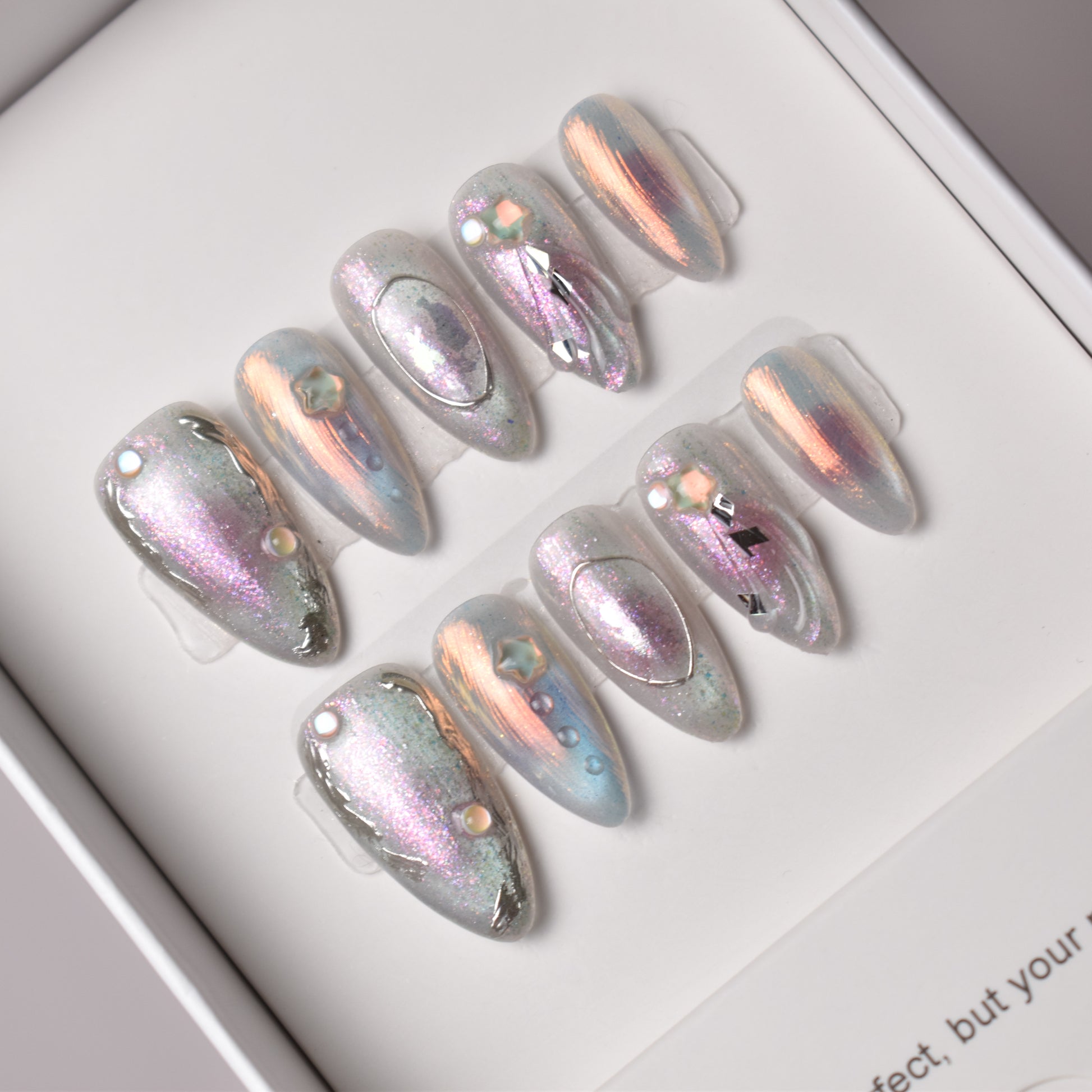 Ethereal and futuristic, our Amanogawa Dreams press-on nail set is inspired by Japan’s romantic Tanabata festival, when the Milky Way becomes the bridge for two star-crossed lovers to meet. Iridescent pink, lavender, and blue shimmer flow together like stardust, accented with golden light streaks and delicate pearl drops. Star charms, crystal embellishments, and sleek abstract detailing give this set a dreamy, high-fashion edge that works beautifully in both Japanese street style and Western glam.