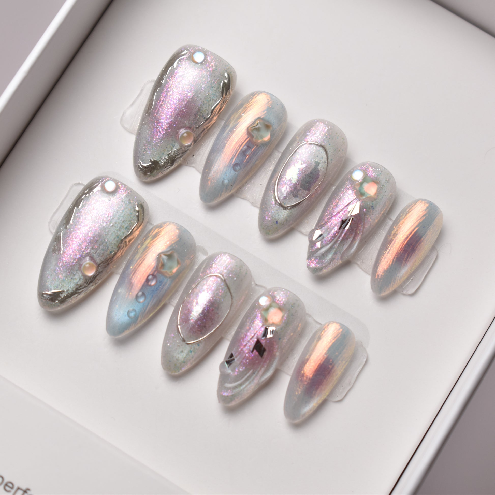 - 10 uniquely designed, hand-painted press-on nails made with high-quality UV gel.
