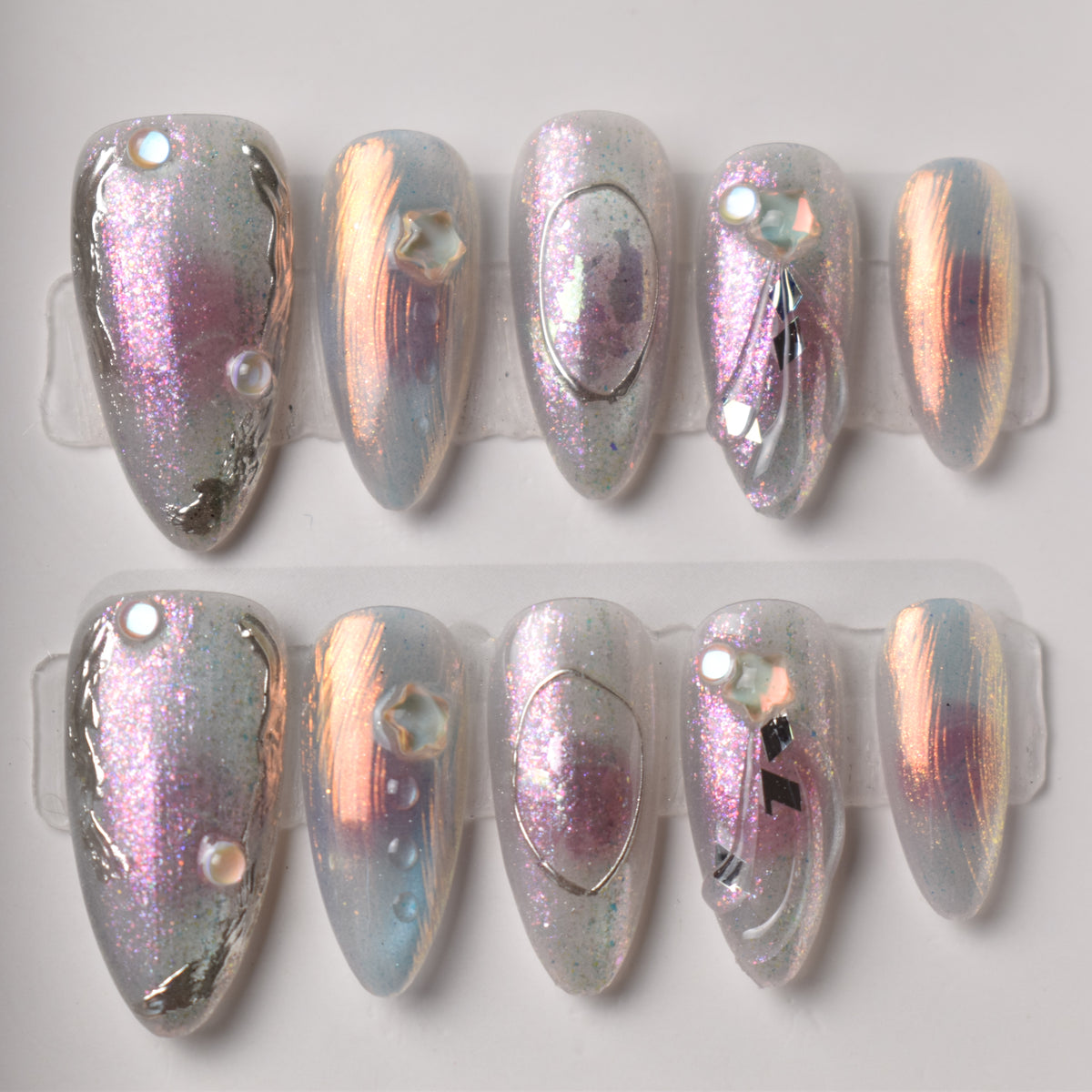 Ethereal and futuristic, our Amanogawa Dreams press-on nail set is inspired by Japan’s romantic Tanabata festival, when the Milky Way becomes the bridge for two star-crossed lovers to meet. Iridescent pink, lavender, and blue shimmer flow together like stardust, accented with golden light streaks and delicate pearl drops. Star charms, crystal embellishments, and sleek abstract detailing give this set a dreamy, high-fashion edge that works beautifully in both Japanese street style and Western glam.