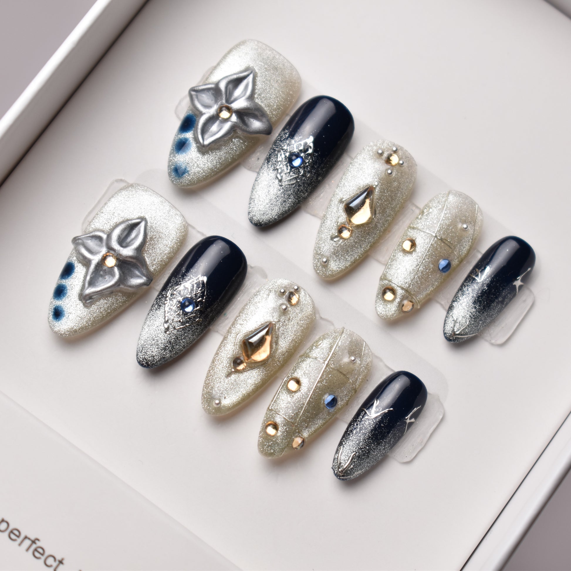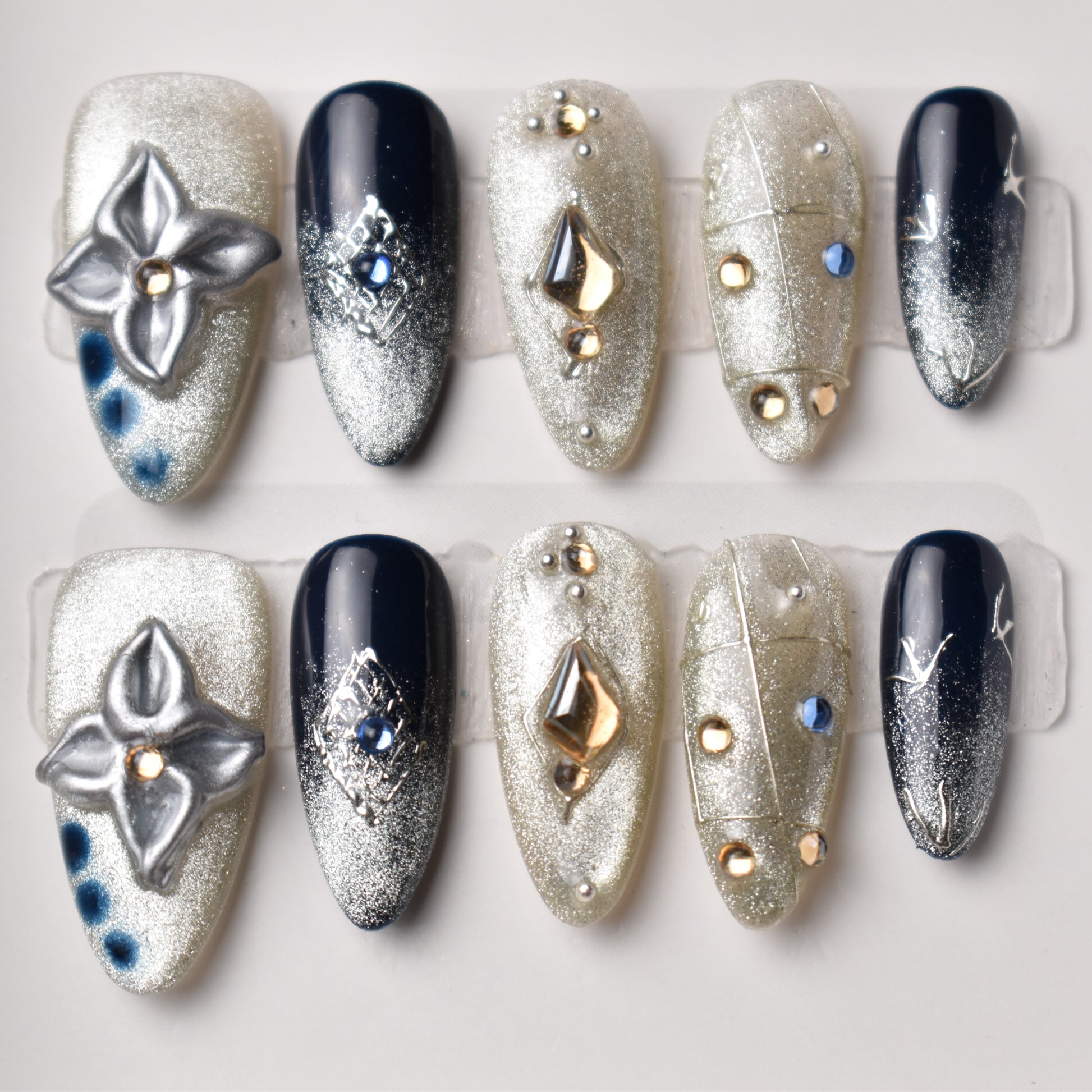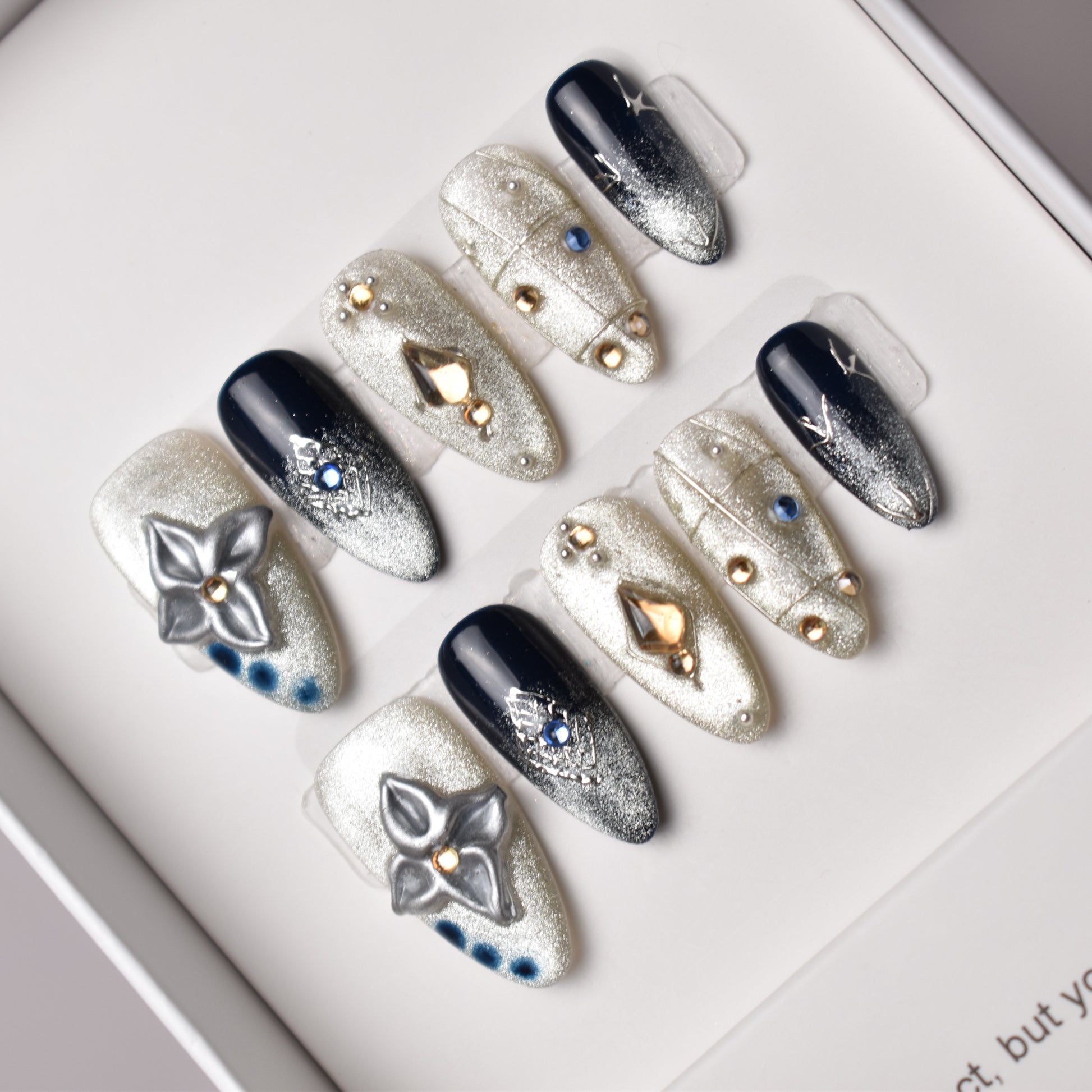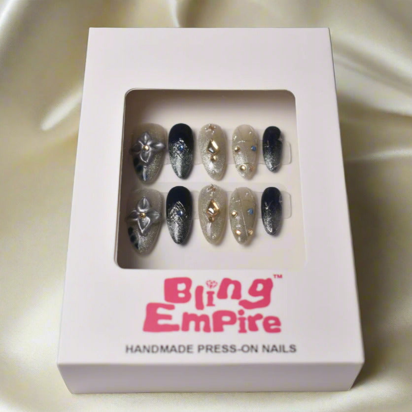 Mysterious, luxurious, and sparkling with cosmic beauty, our Ginga no Yoru press-on nail set is inspired by the elegance of Japanese starry night motifs and the glittering Milky Way. A deep navy base blends seamlessly into silver gradients, adorned with gemstone accents and geometric metallic designs reminiscent of constellations and celestial maps. 3D metallic flowers and pearl details add depth and artistry, creating a style that feels both culturally rich and fashion-forward.