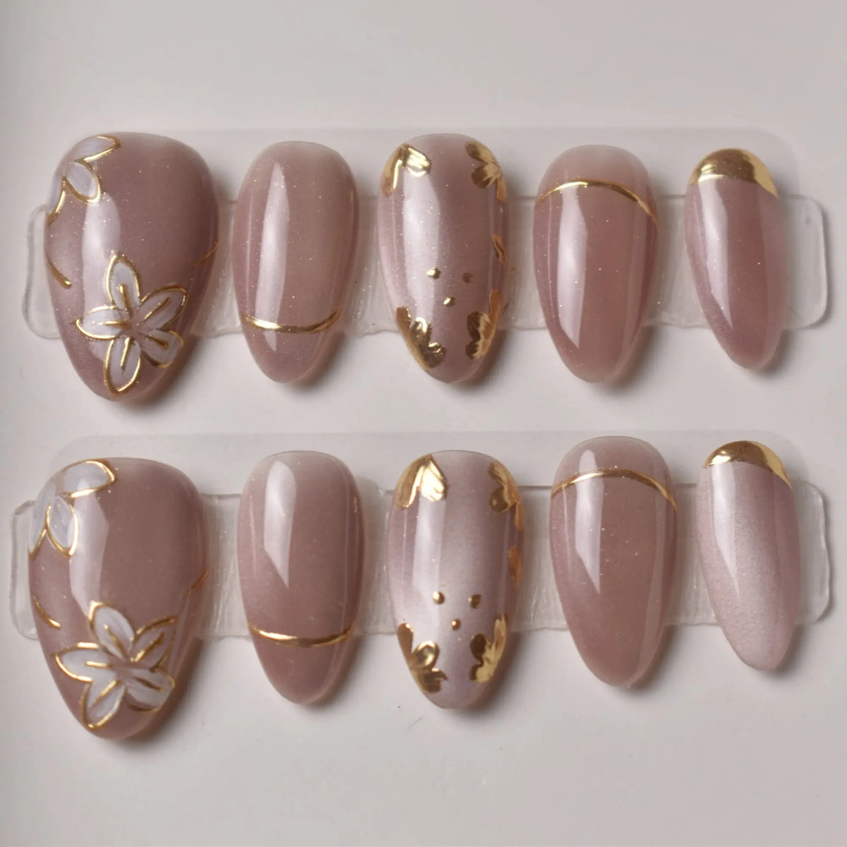 - 10 uniquely designed, hand-painted press-on nails made with high-quality UV gel.