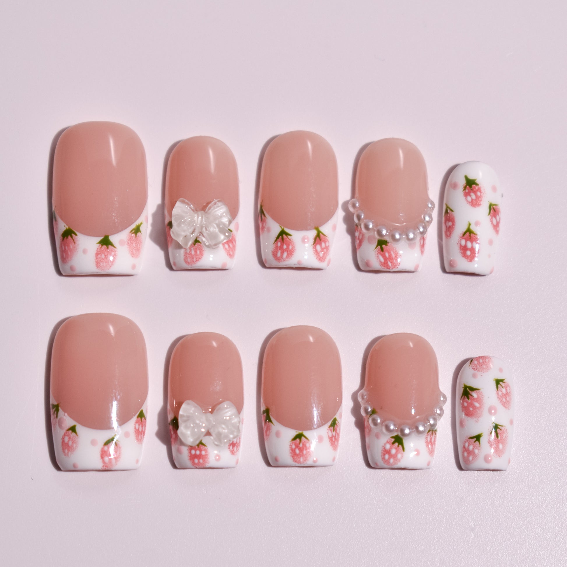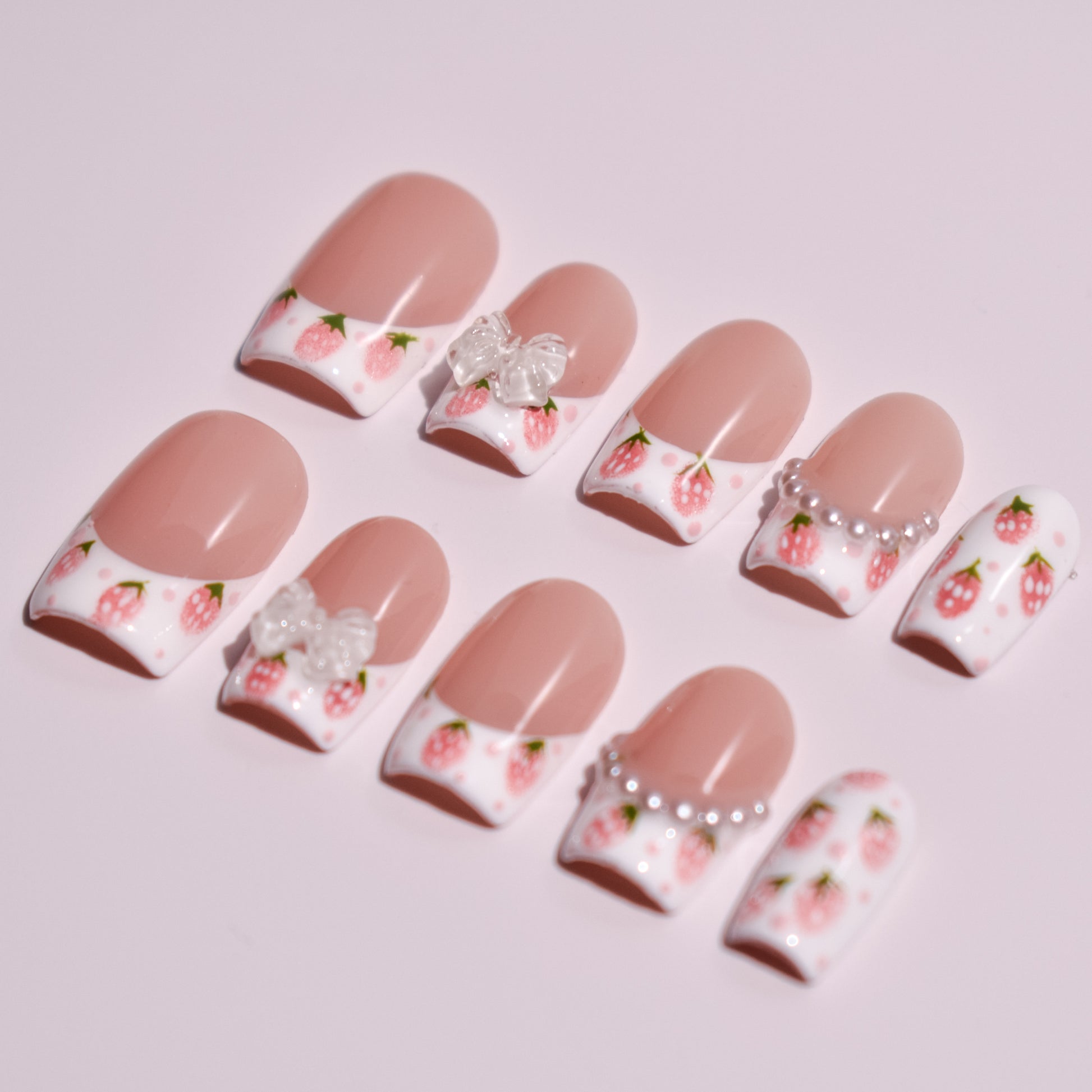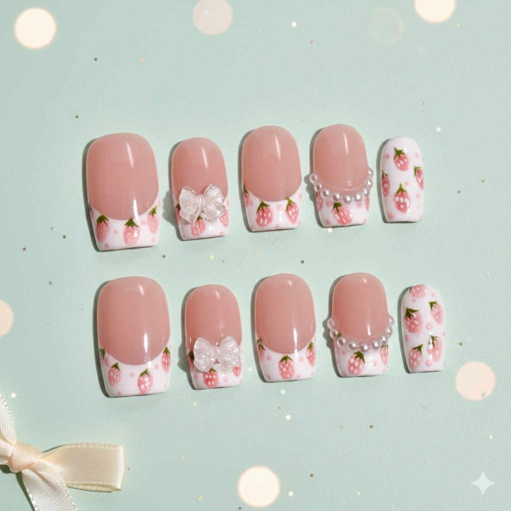 Each nail features hand-painted strawberry motifs applied with fine detailing and soft shading to create depth and charm. Subtle pink dot accents add a whimsical touch, while select nails are elevated with sculpted gel embellishments, including a translucent bow and a curved row of pearl accents. The designs are carefully layered to maintain smooth transitions and a cohesive, boutique-quality appearance.