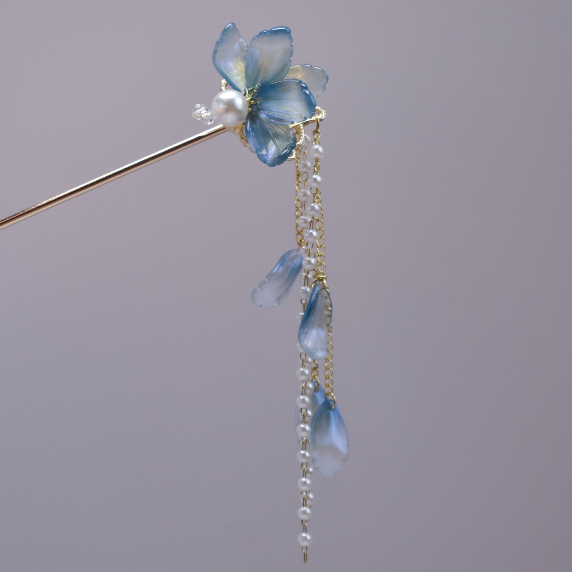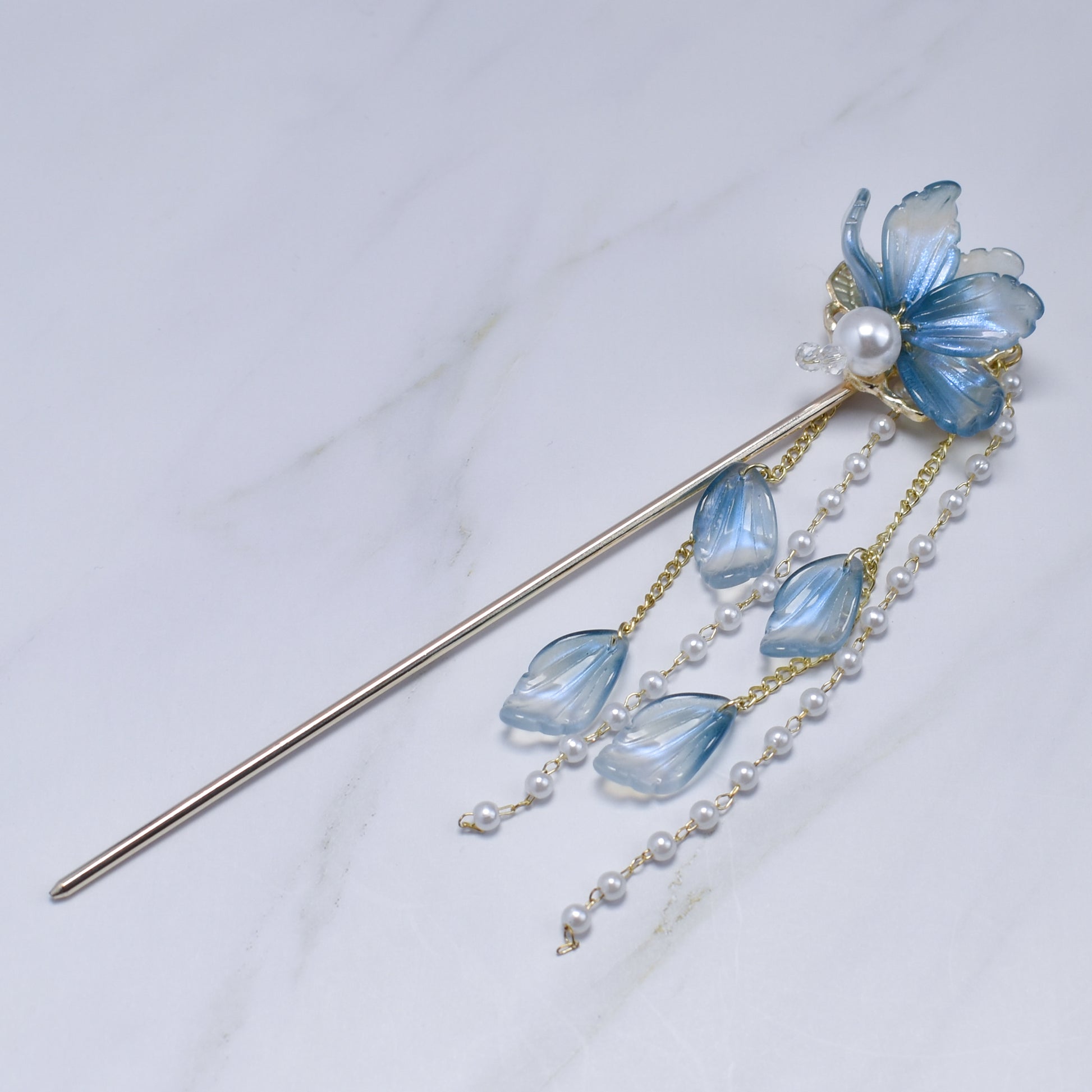 Soft, airy, and beautifully elegant—this Blue Blossom Tassel Hairpin brings a serene floral touch to any hairstyle. The translucent blue petals create a delicate watercolor-like bloom, paired with a luminous pearl center for a refined and graceful finish. Flowing gold chains adorned with pearl beads and blue resin petal charms sway gently with movement, adding lightness and charm to your look.
