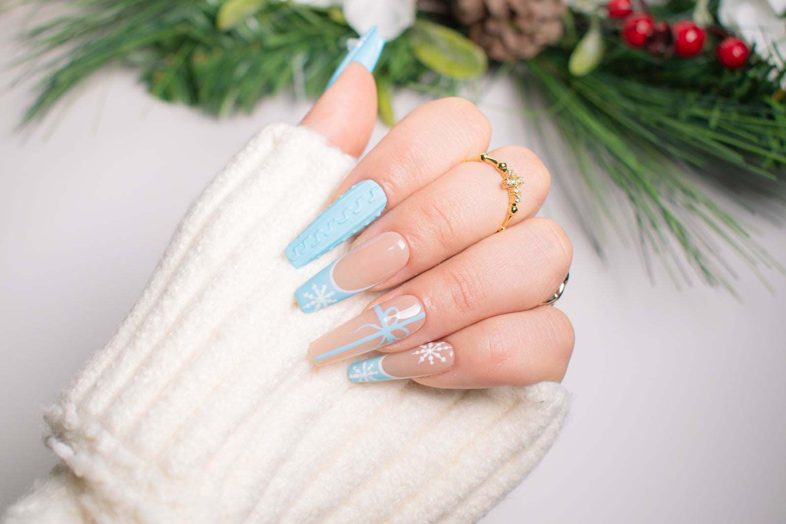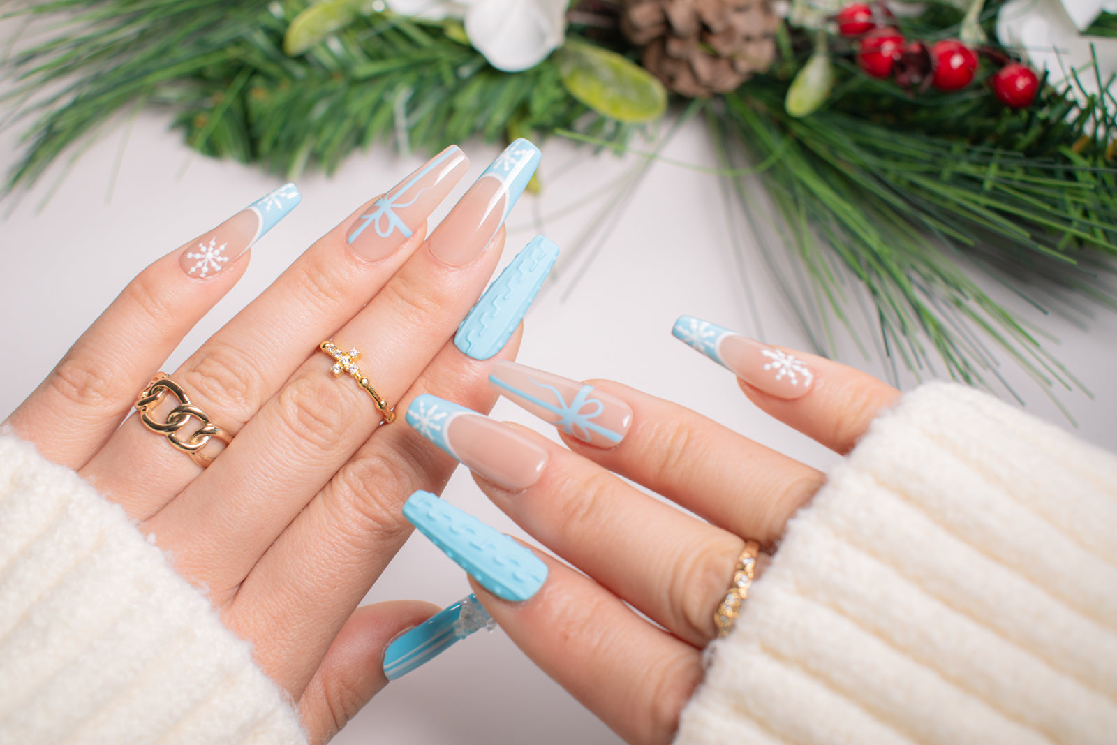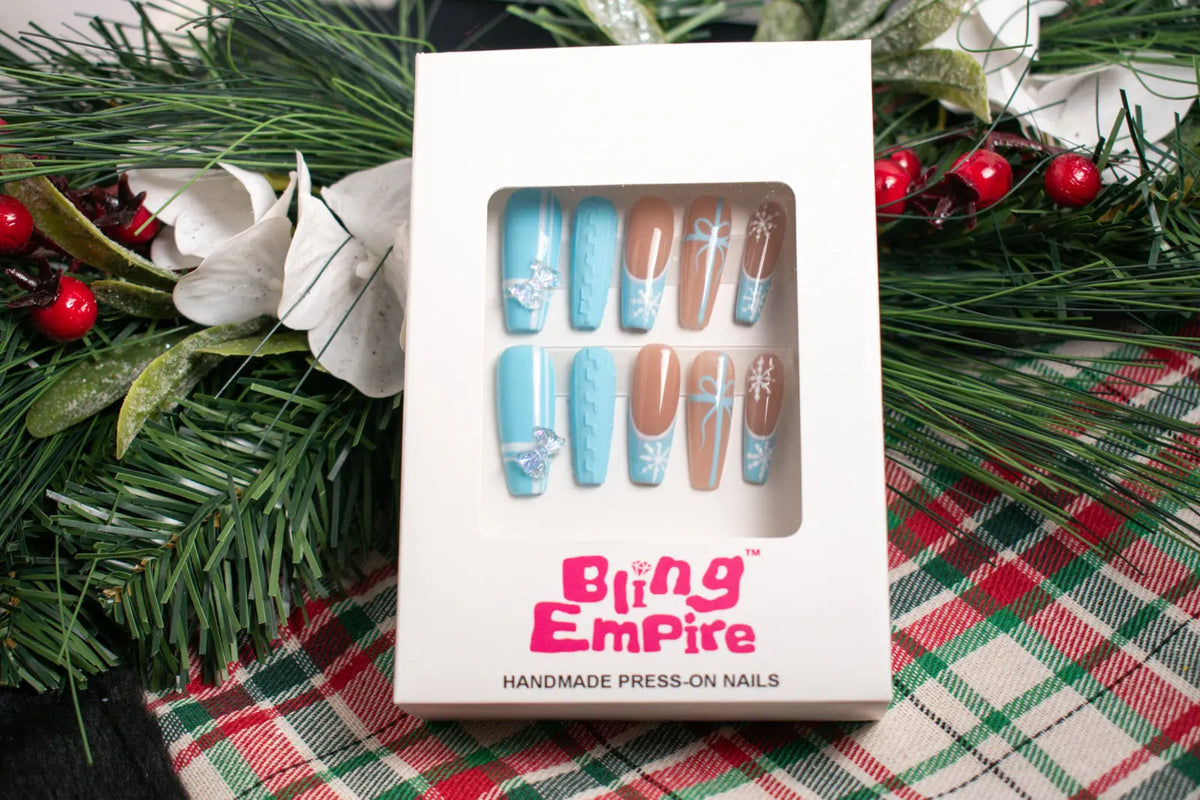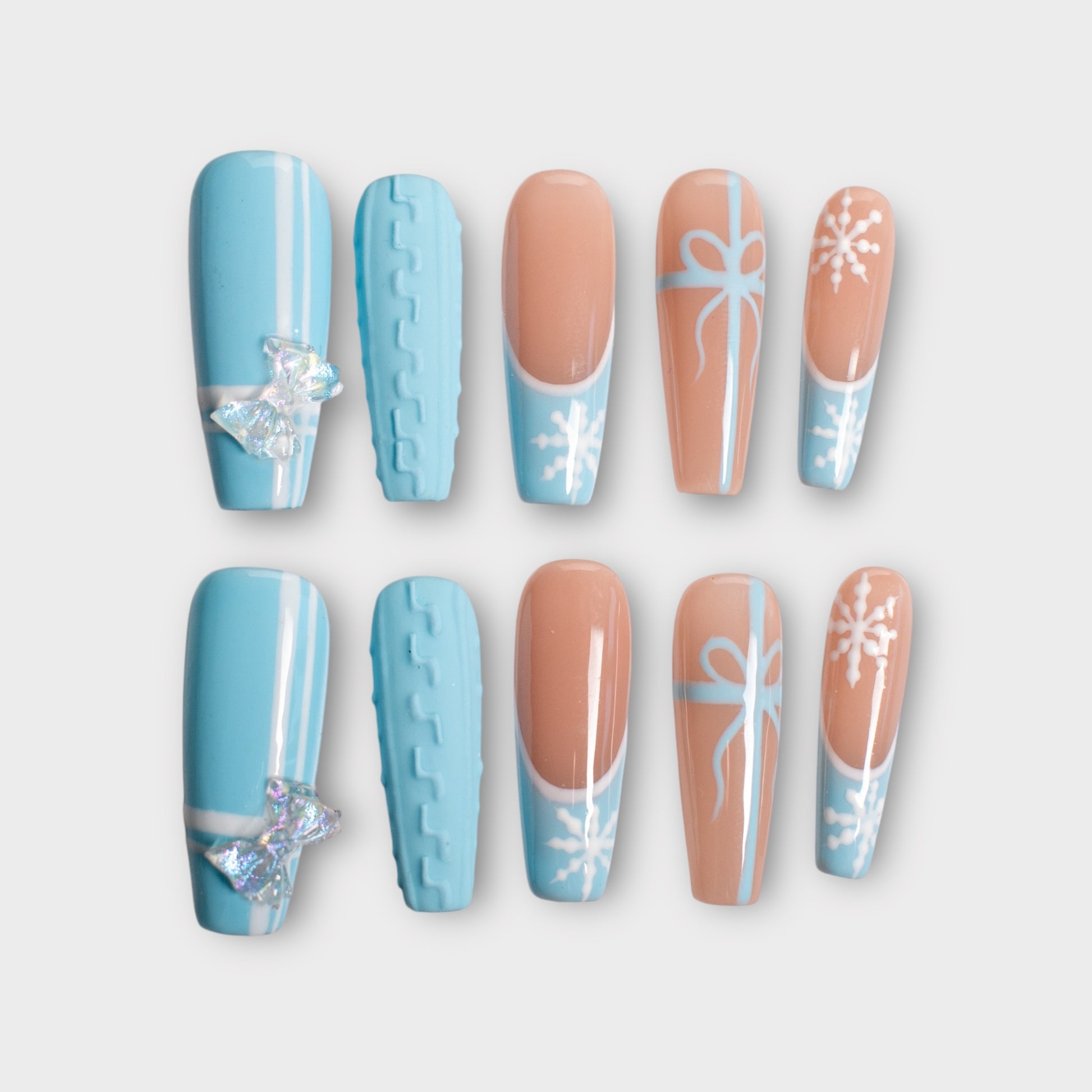 The Winter Wonderland Wrap nail set captures the magic of the holiday season with its gift box-inspired ribbons, delicate snowflake accents, and cozy sweater texture. This set blends warmth and festivity, making it the perfect accessory for your winter celebrations.