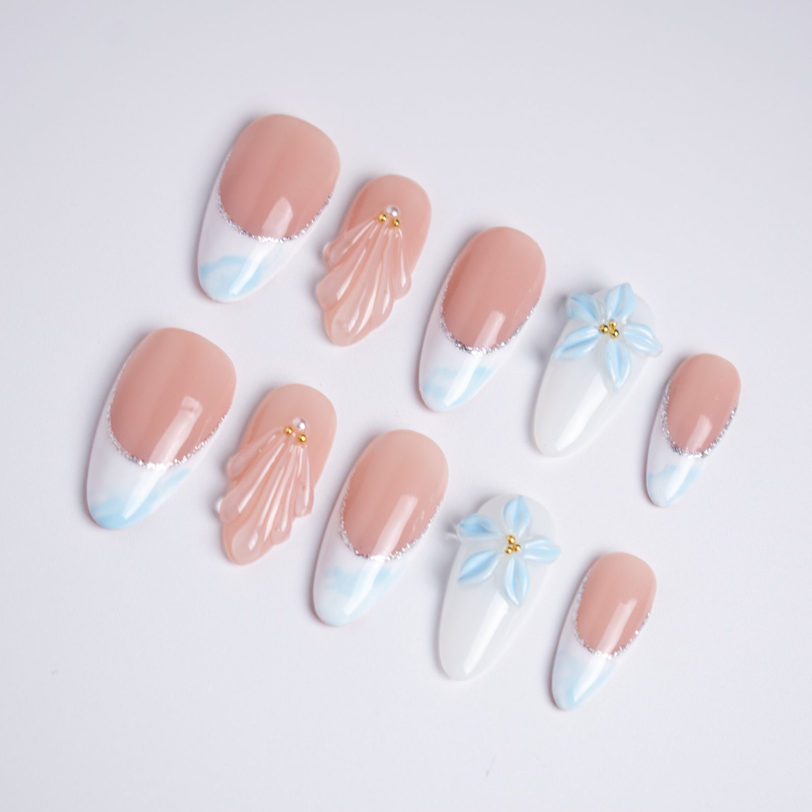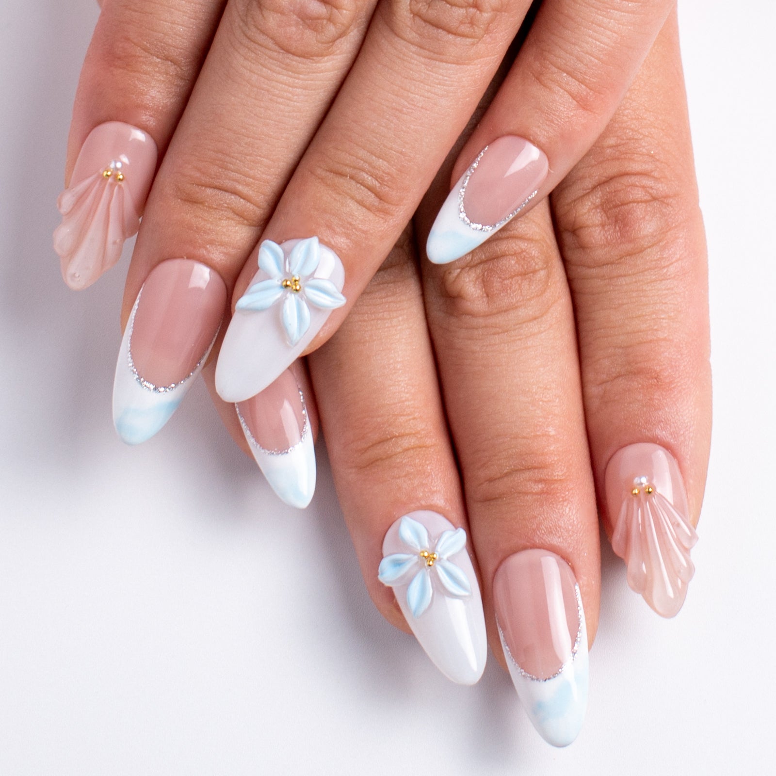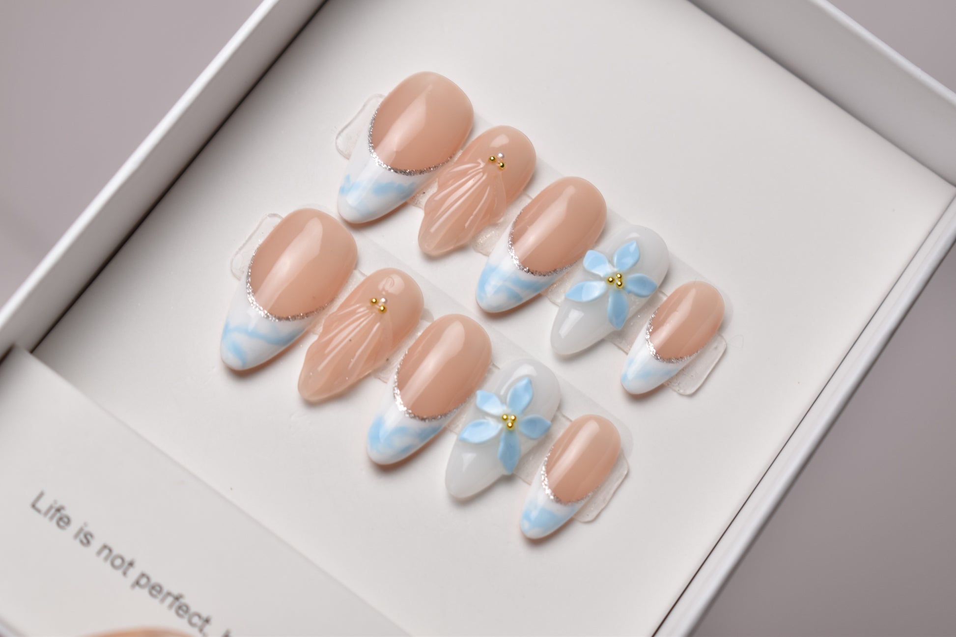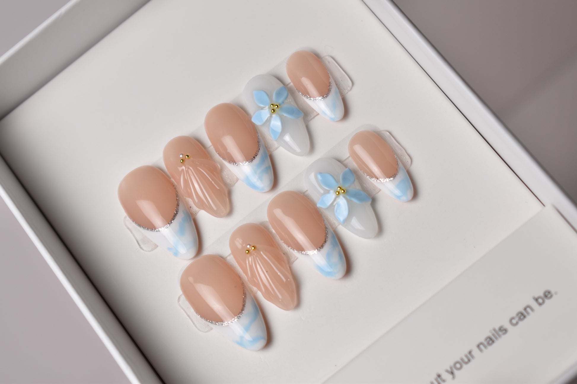 This serene set blends soft nude and white tones with delicate sky-blue marbling at the tips, outlined in fine silver glitter for an elegant finish. Two accent nails feature hand-sculpted 3D blue flowers with gold bead centers, evoking the calm beauty of blossoms against a clear spring sky. The combination of airy colors and subtle shimmer creates a refined, peaceful look that feels both fresh and timeless.