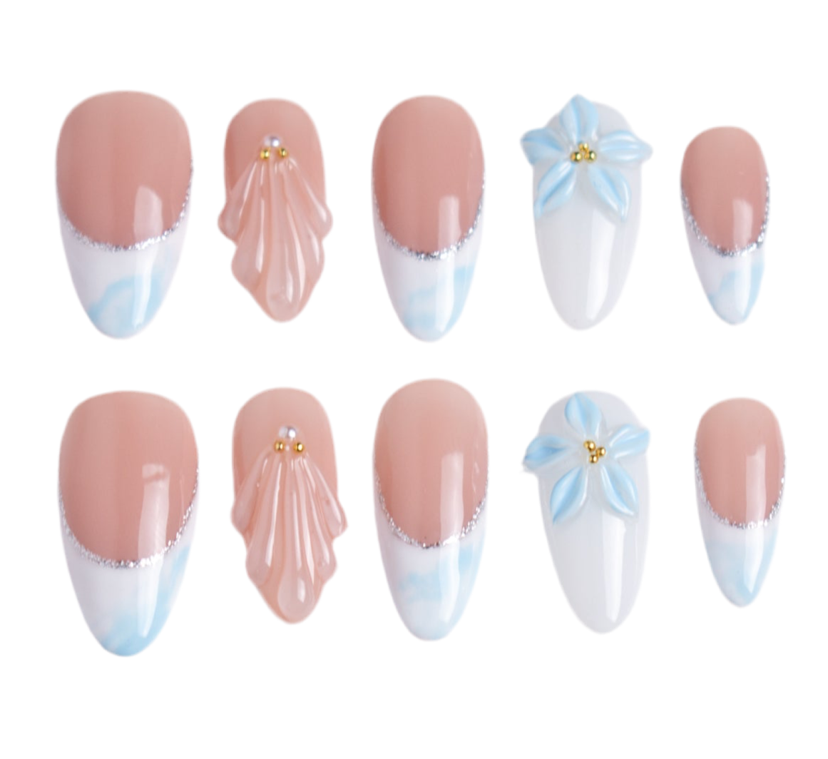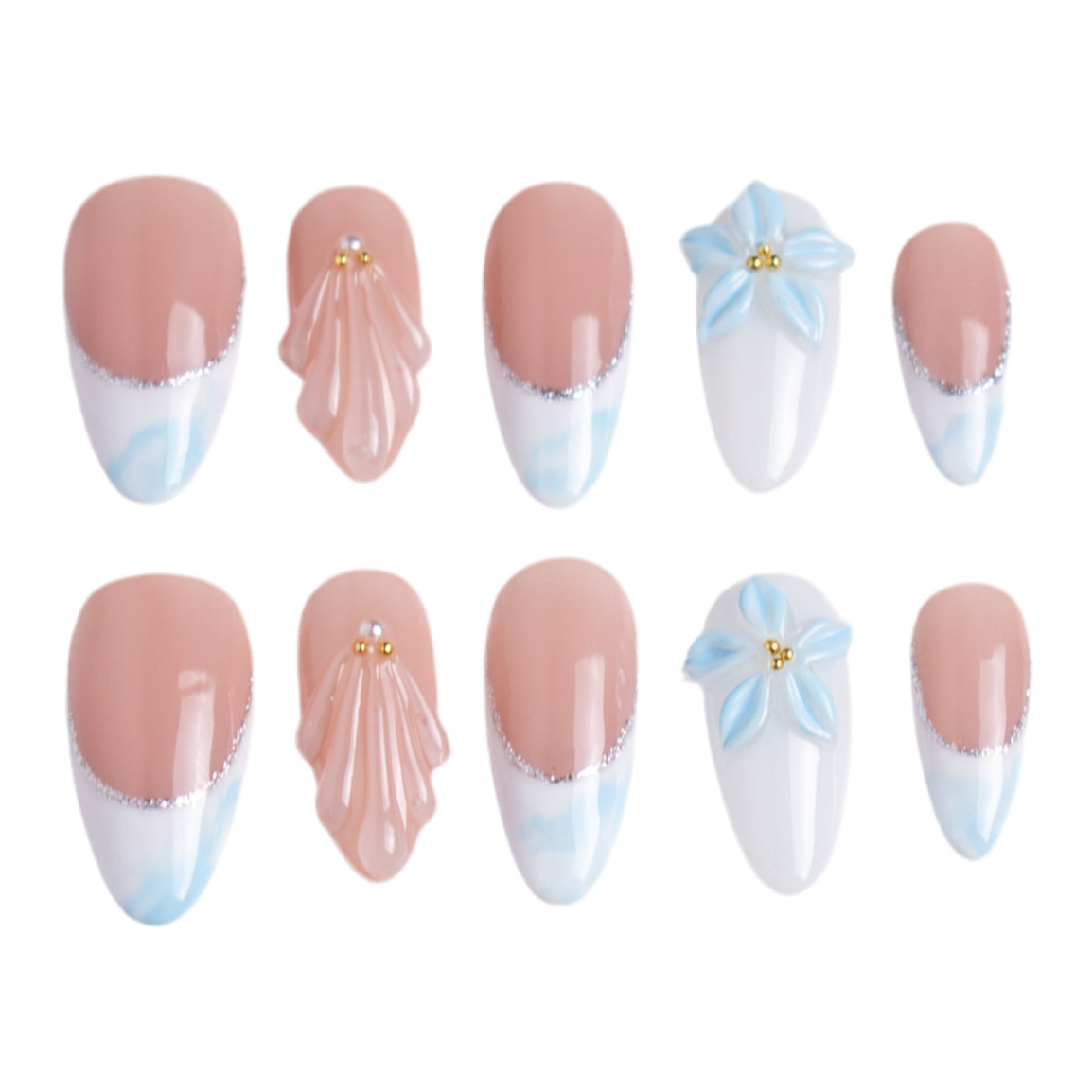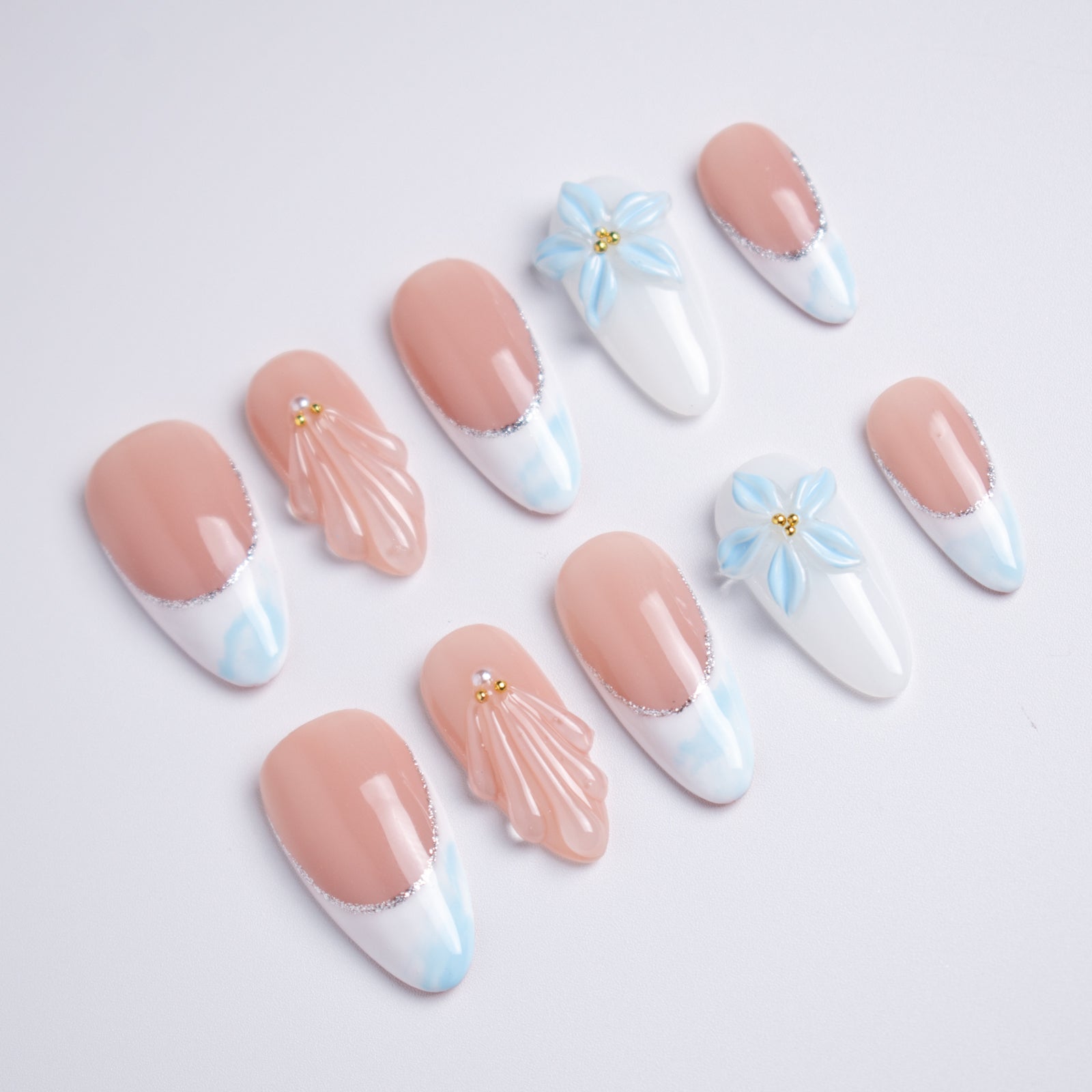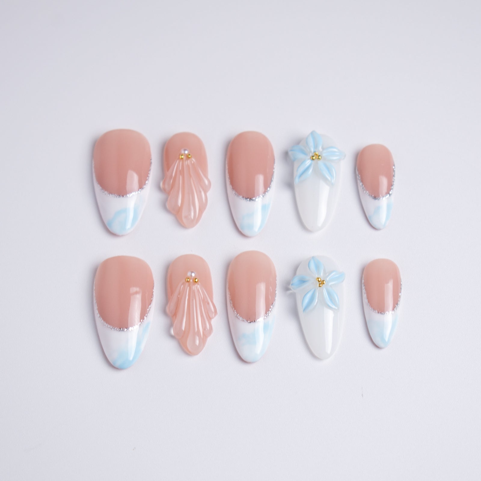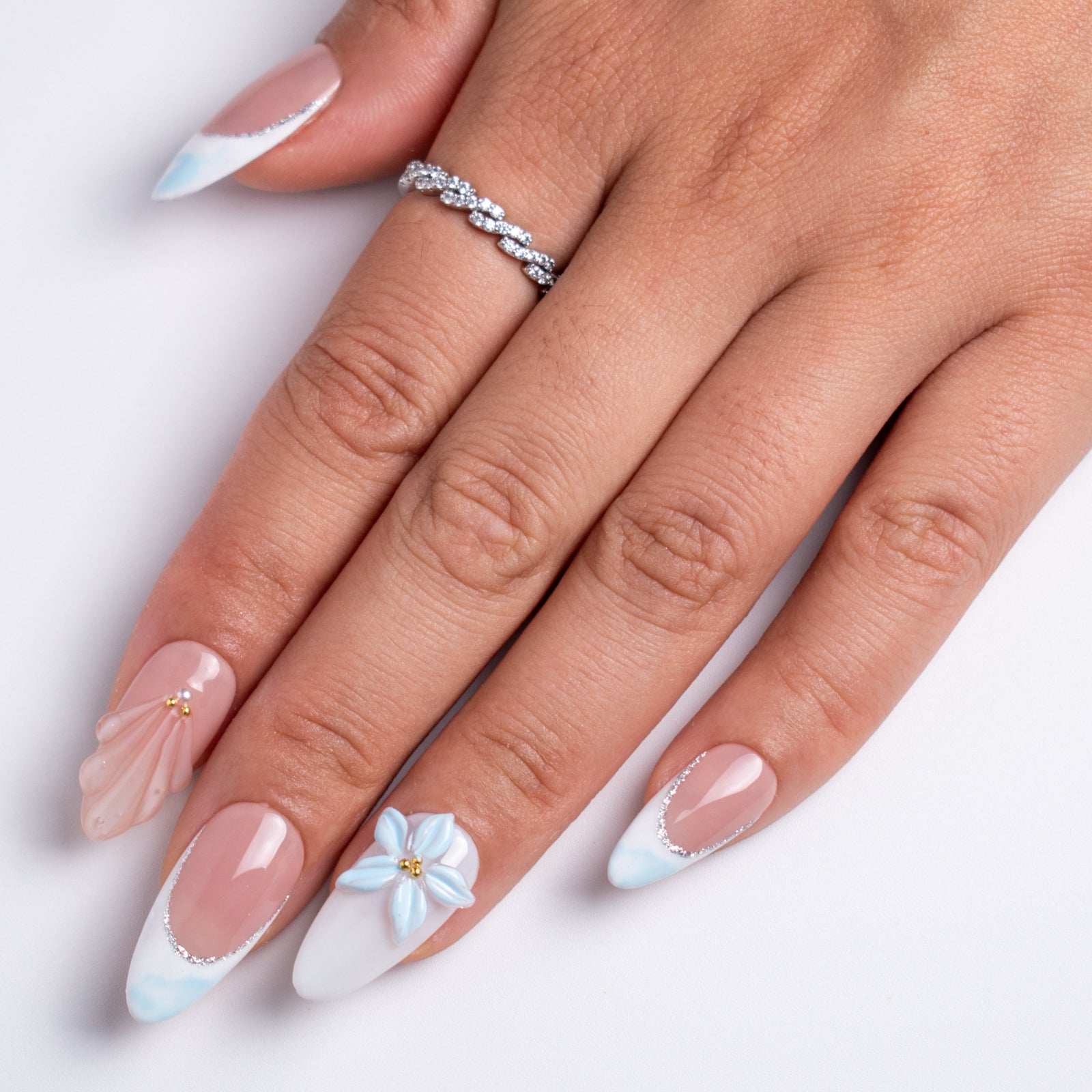 This serene set blends soft nude and white tones with delicate sky-blue marbling at the tips, outlined in fine silver glitter for an elegant finish. Two accent nails feature hand-sculpted 3D blue flowers with gold bead centers, evoking the calm beauty of blossoms against a clear spring sky. The combination of airy colors and subtle shimmer creates a refined, peaceful look that feels both fresh and timeless.