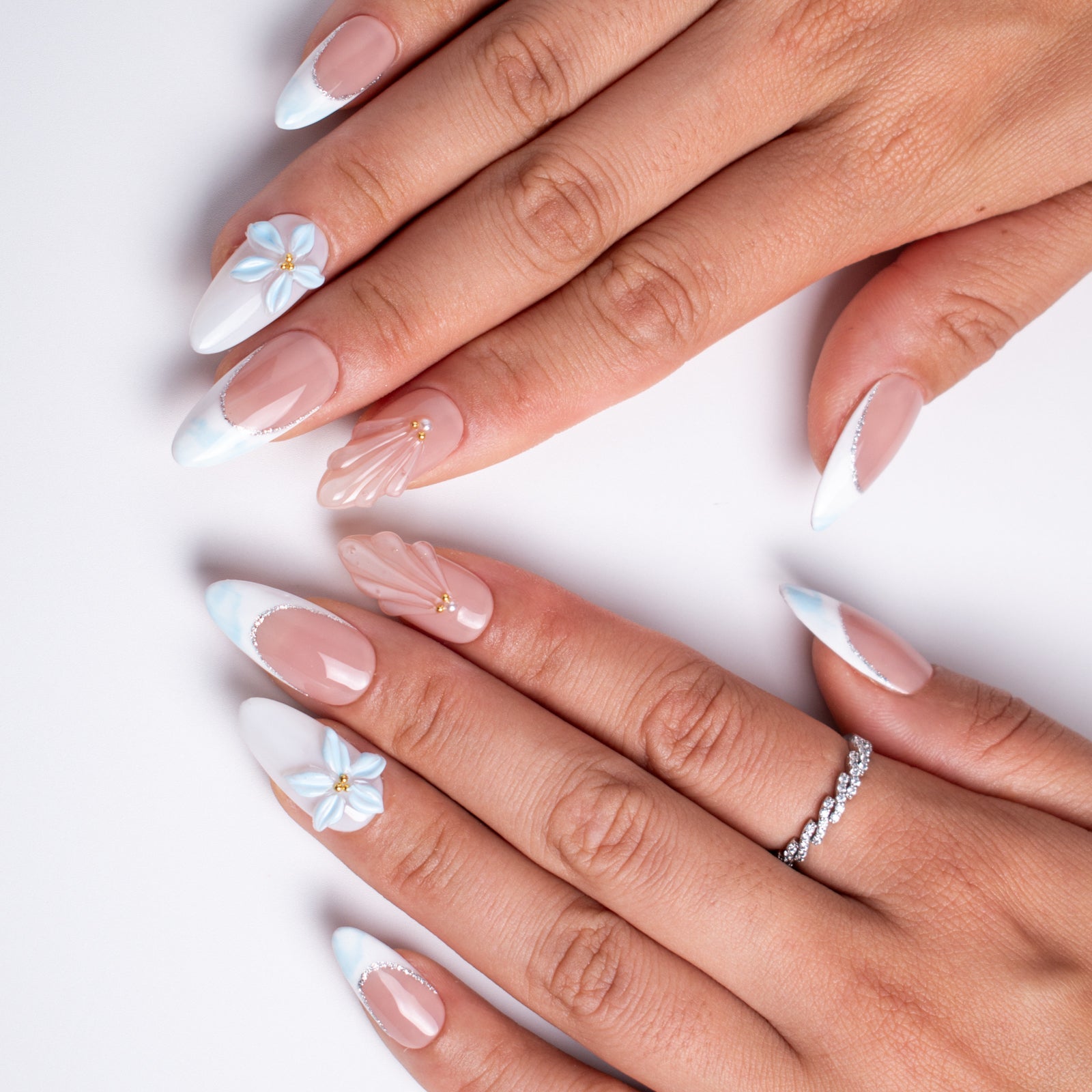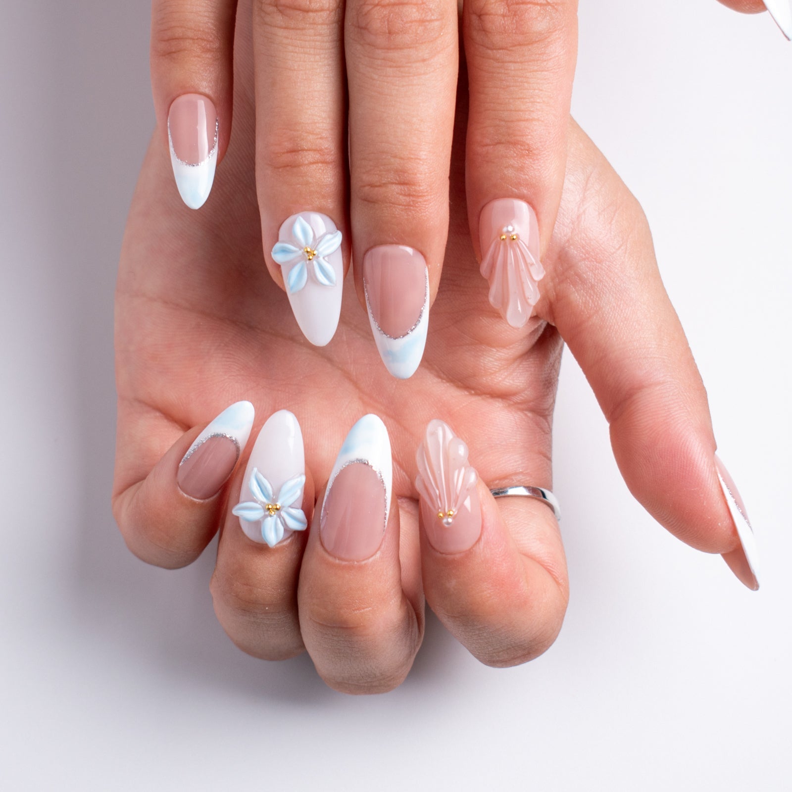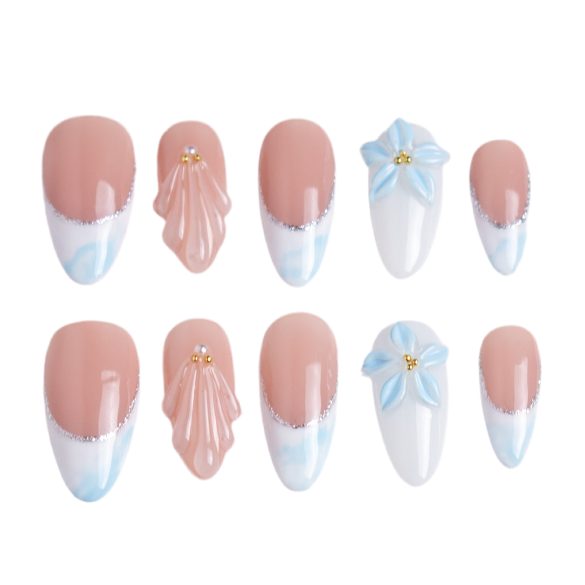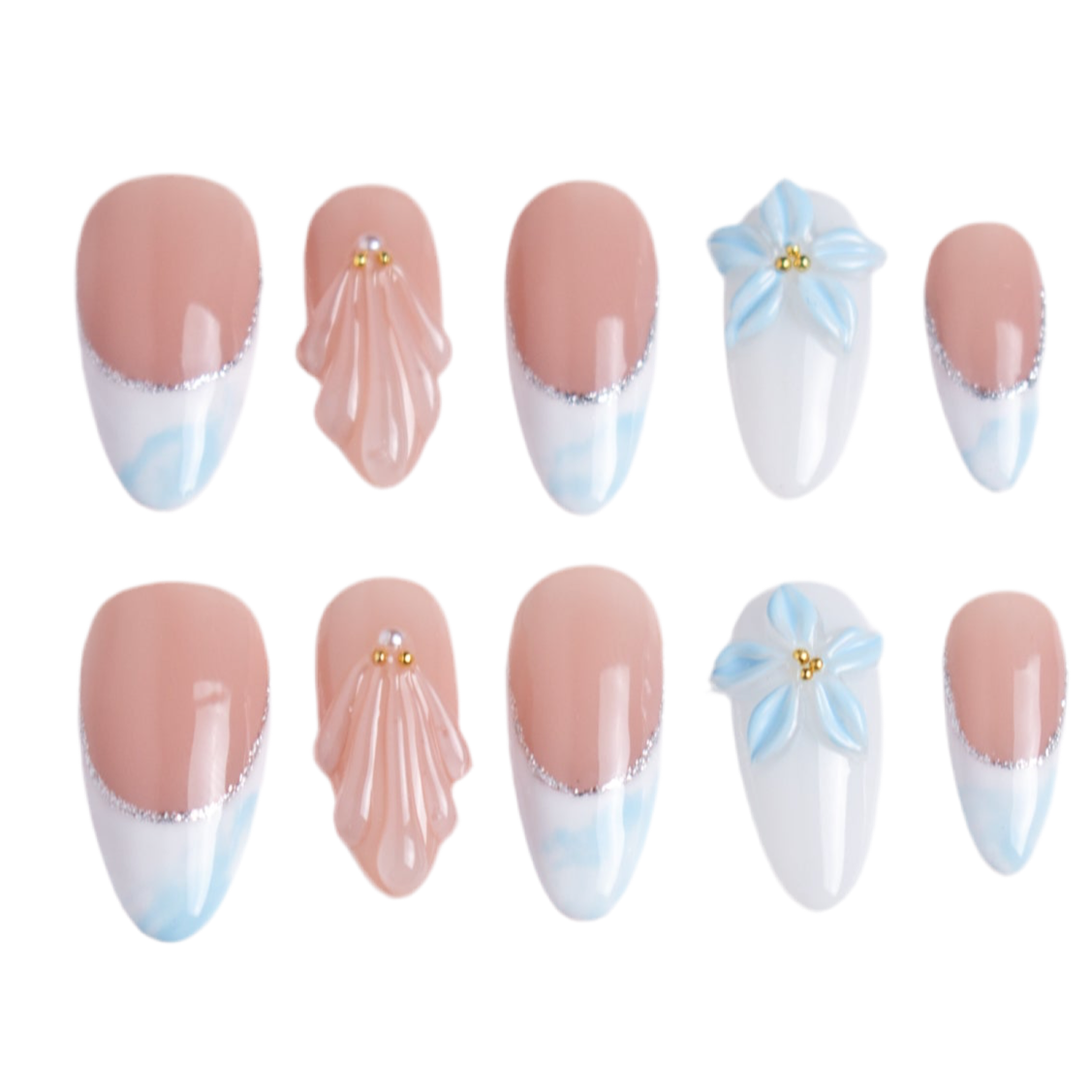This serene set blends soft nude and white tones with delicate sky-blue marbling at the tips, outlined in fine silver glitter for an elegant finish. Two accent nails feature hand-sculpted 3D blue flowers with gold bead centers, evoking the calm beauty of blossoms against a clear spring sky. The combination of airy colors and subtle shimmer creates a refined, peaceful look that feels both fresh and timeless.