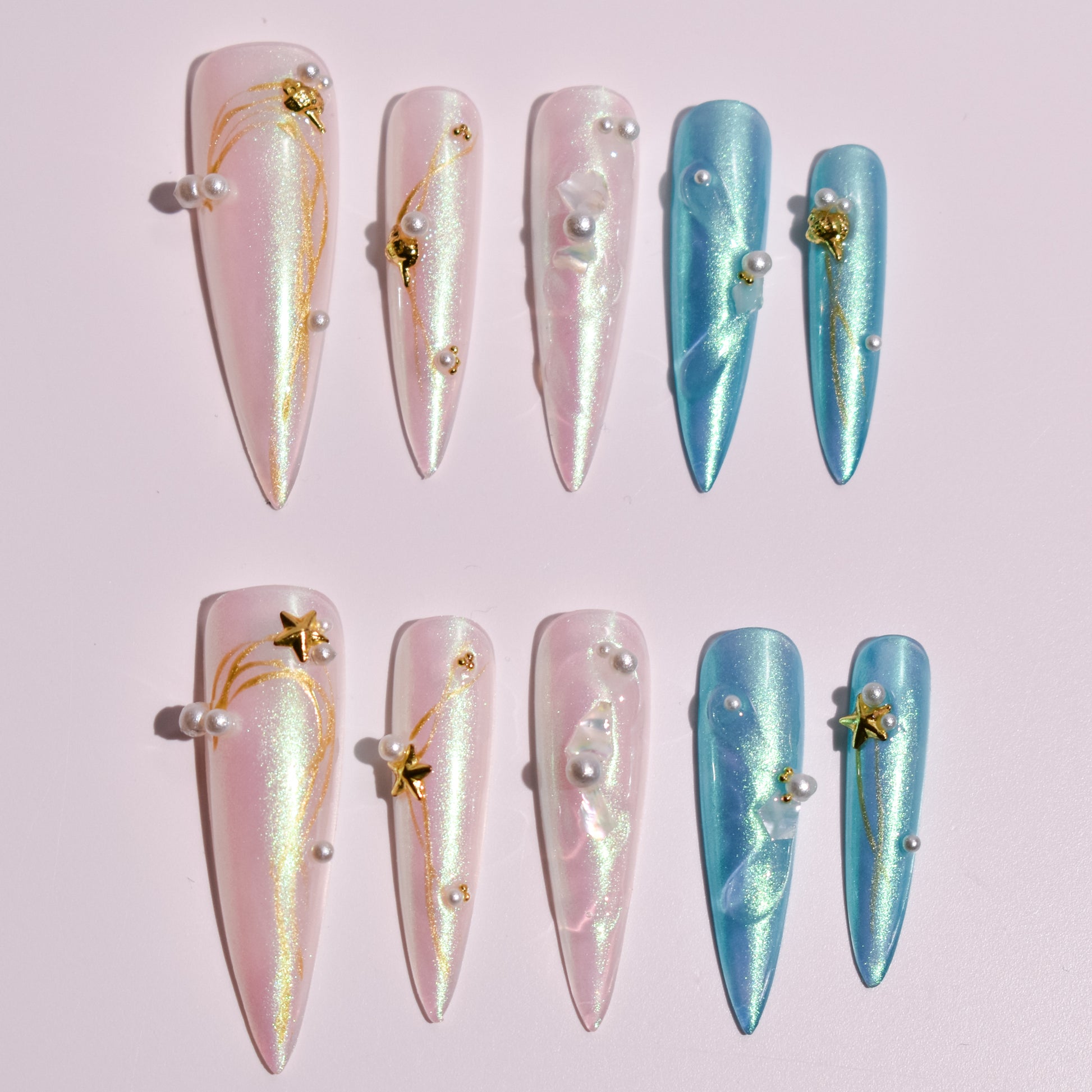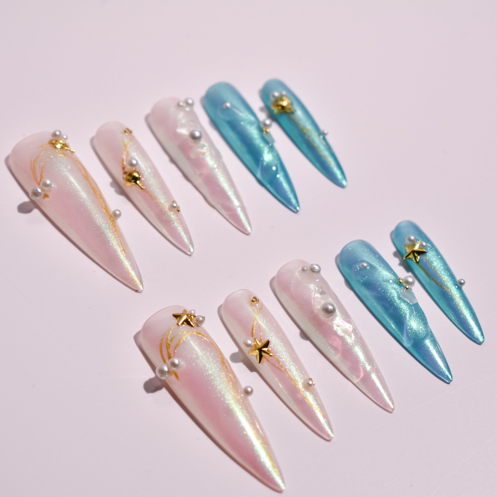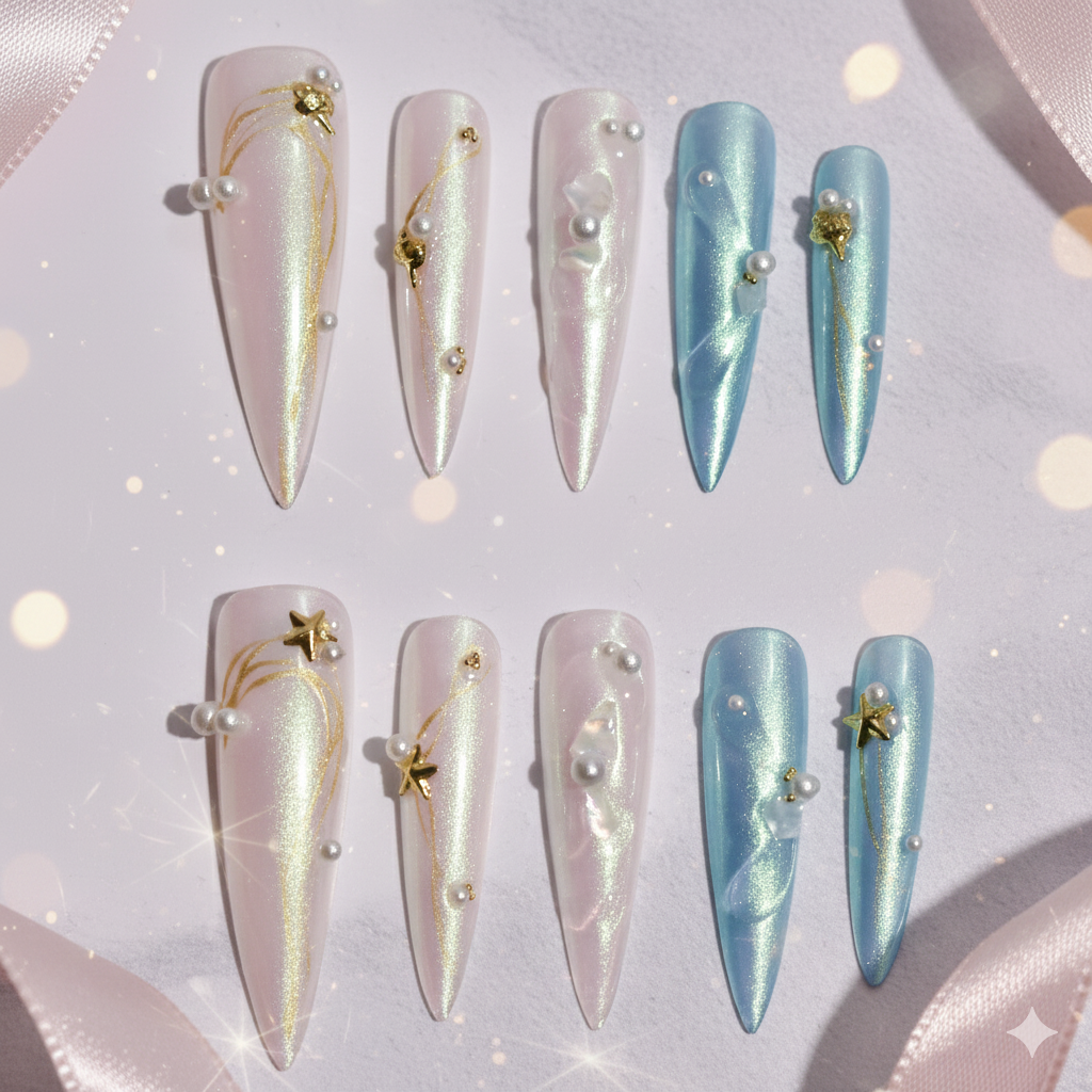 Each nail is meticulously handcrafted using layered sheer gels and smooth gradient transitions that shift with the light. Hand-painted gold detailing sweeps across select nails in delicate, celestial arcs, paired with sculpted gel accents that add organic dimension. Pearl embellishments, star charms, and iridescent shell-like elements are individually placed and sealed into the design, creating depth, texture, and a sense of floating movement without compromising wearability.
