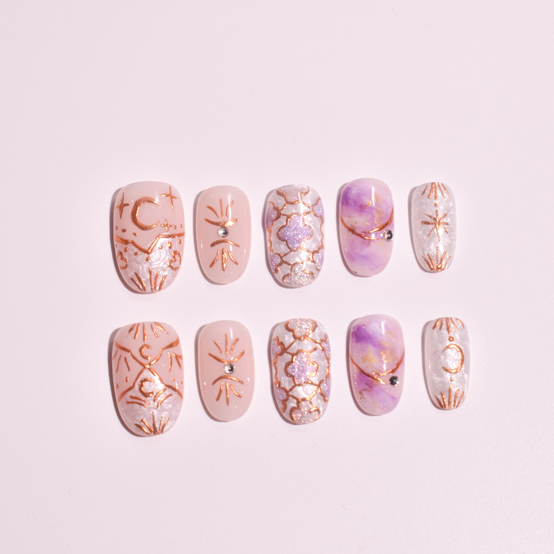 Each nail features intentional symbolism — crescent moons, radiant starbursts, constellation-like line work, and soft crystal accents — creating a mystical yet elegant aesthetic. Subtle iridescent textures and pearlescent finishes add depth without overpowering the softness of the palette.