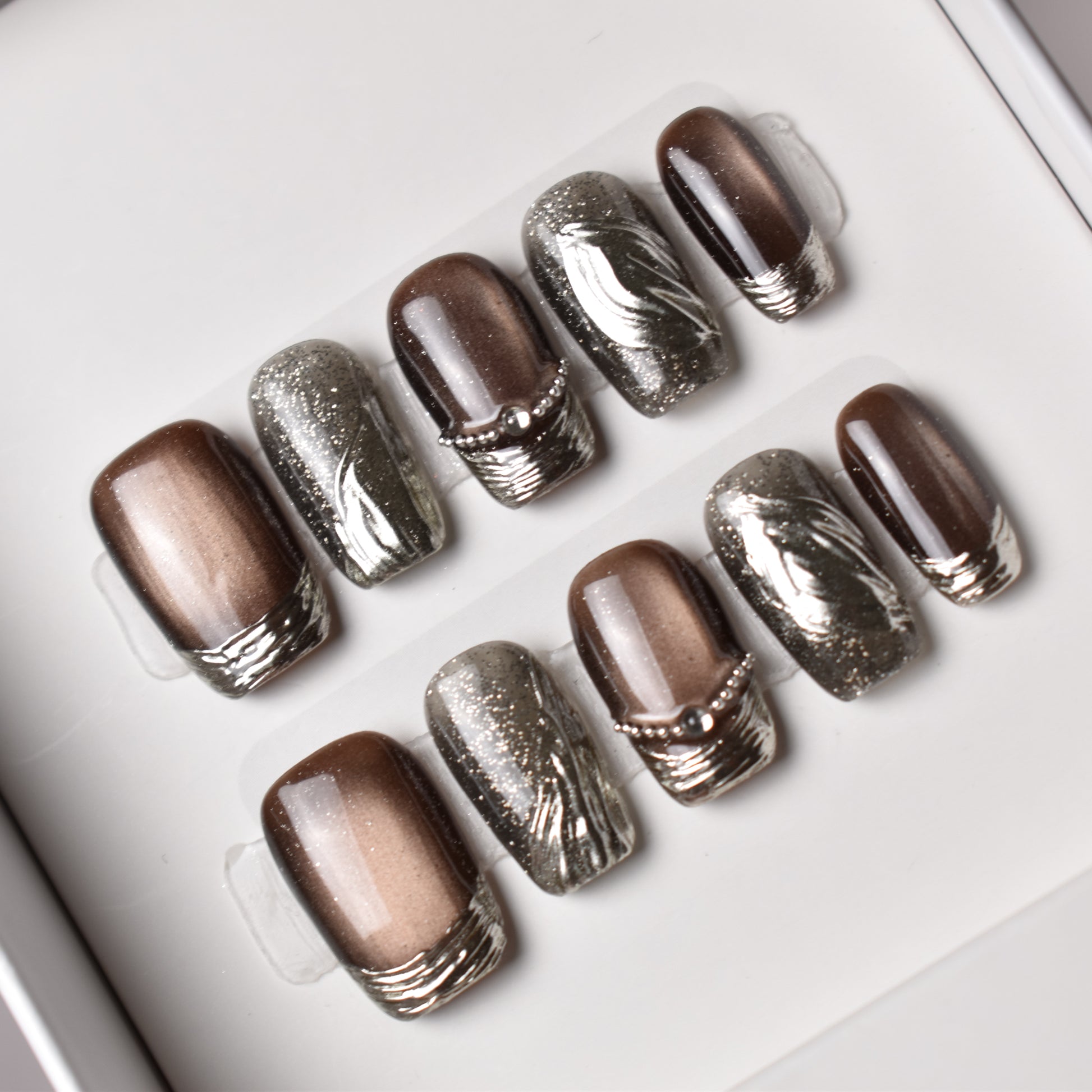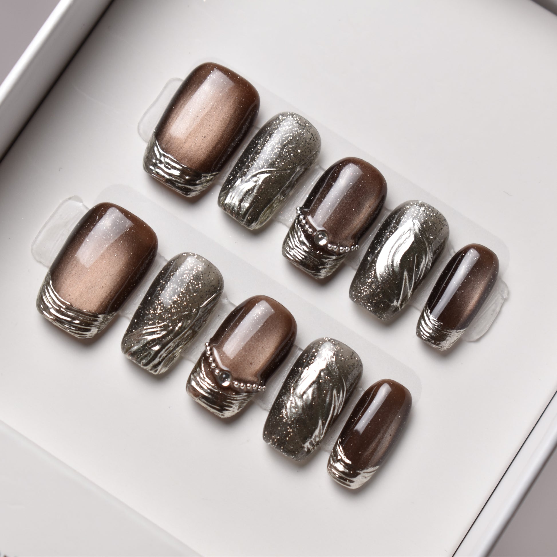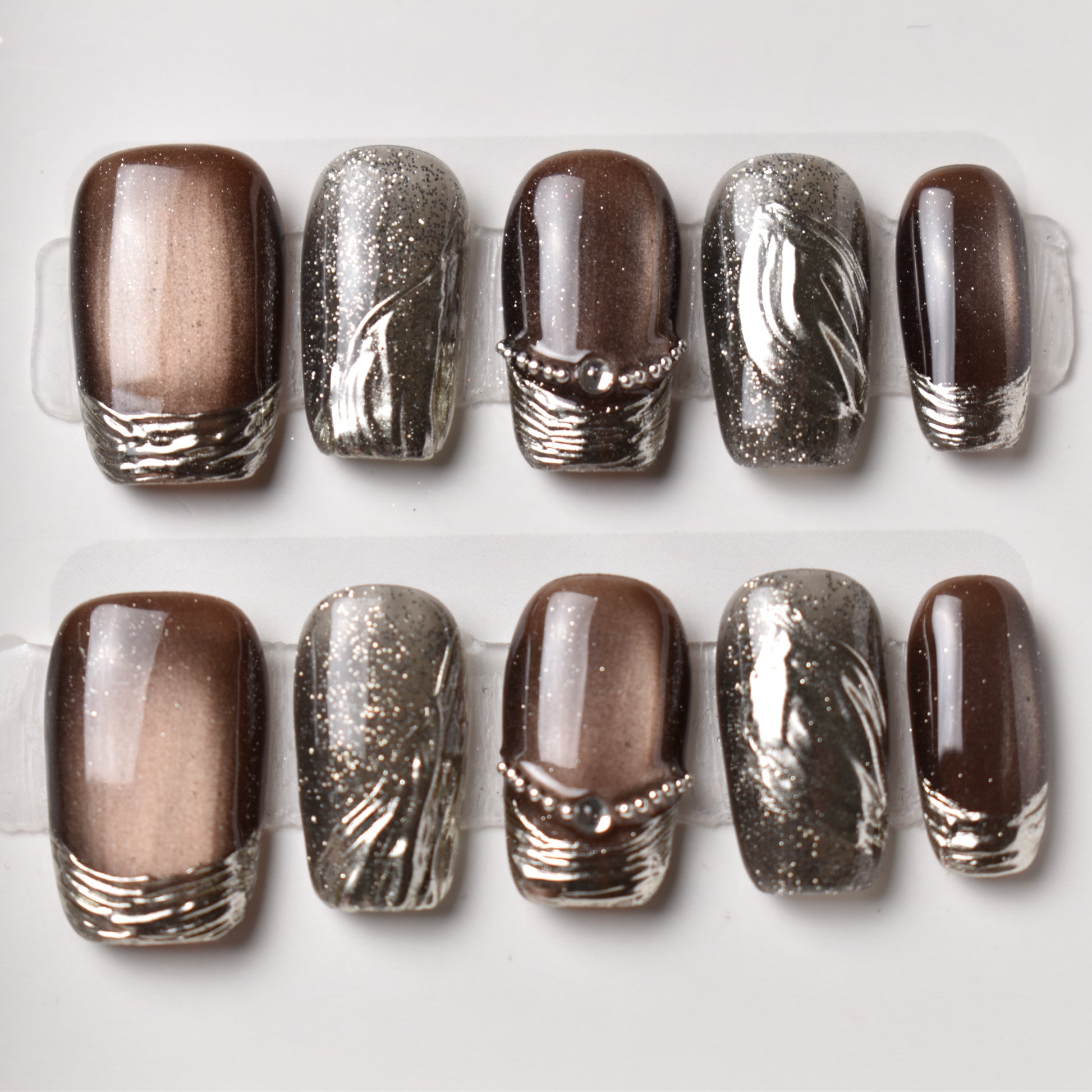 - 10 uniquely designed, hand-painted press-on nails made with high-quality UV gel.