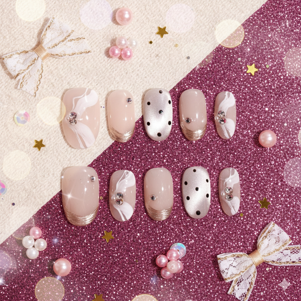 This design features a sheer nude base paired with a mix of pearlized champagne shimmer, hand-painted white marble swirls, and refined gold foil French tips. Subtle crystal embellishments and dotted metallic accents add just the right amount of sparkle without overwhelming the clean, neutral palette.