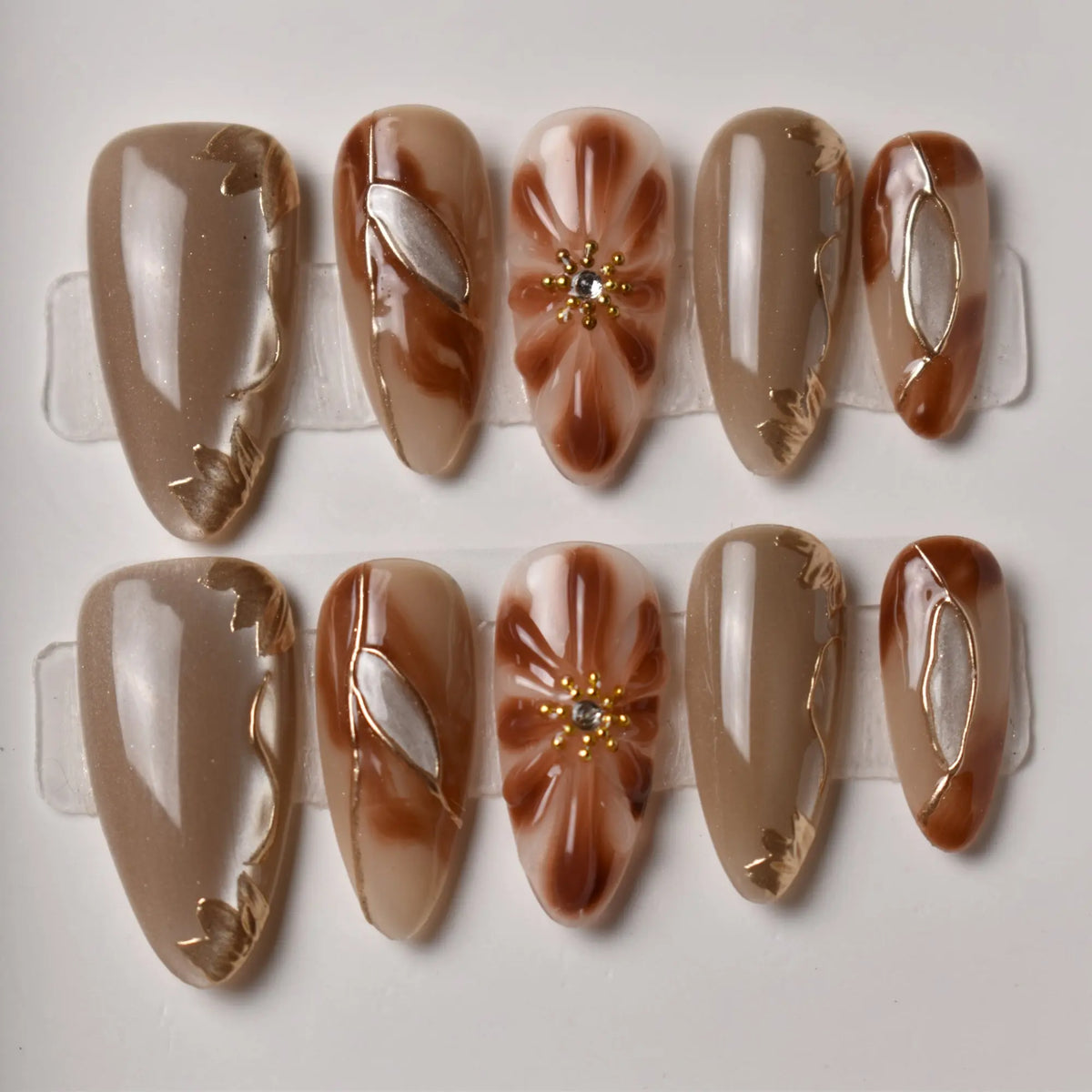 Gentle swirls of caramel and beige create a soothing, marbled effect, accented by golden floral centers and fine metallic edges. This warm and comforting design is perfect for cozy gatherings, autumn afternoons, and moments of quiet elegance.