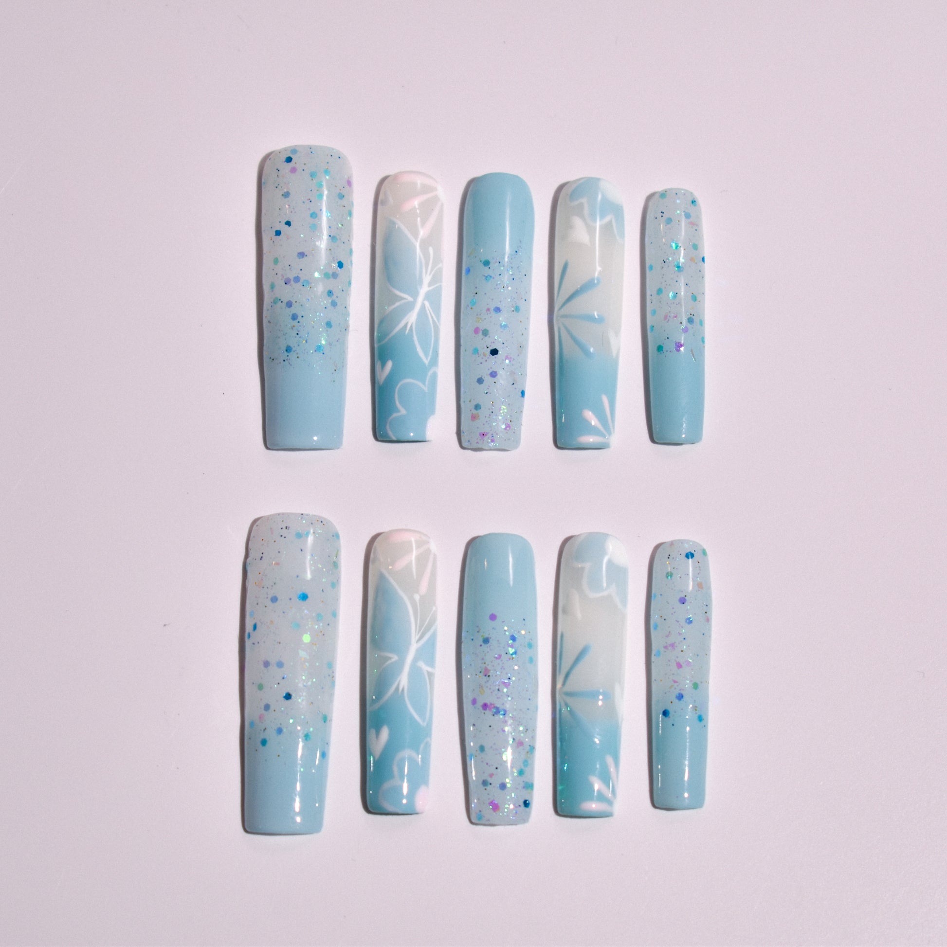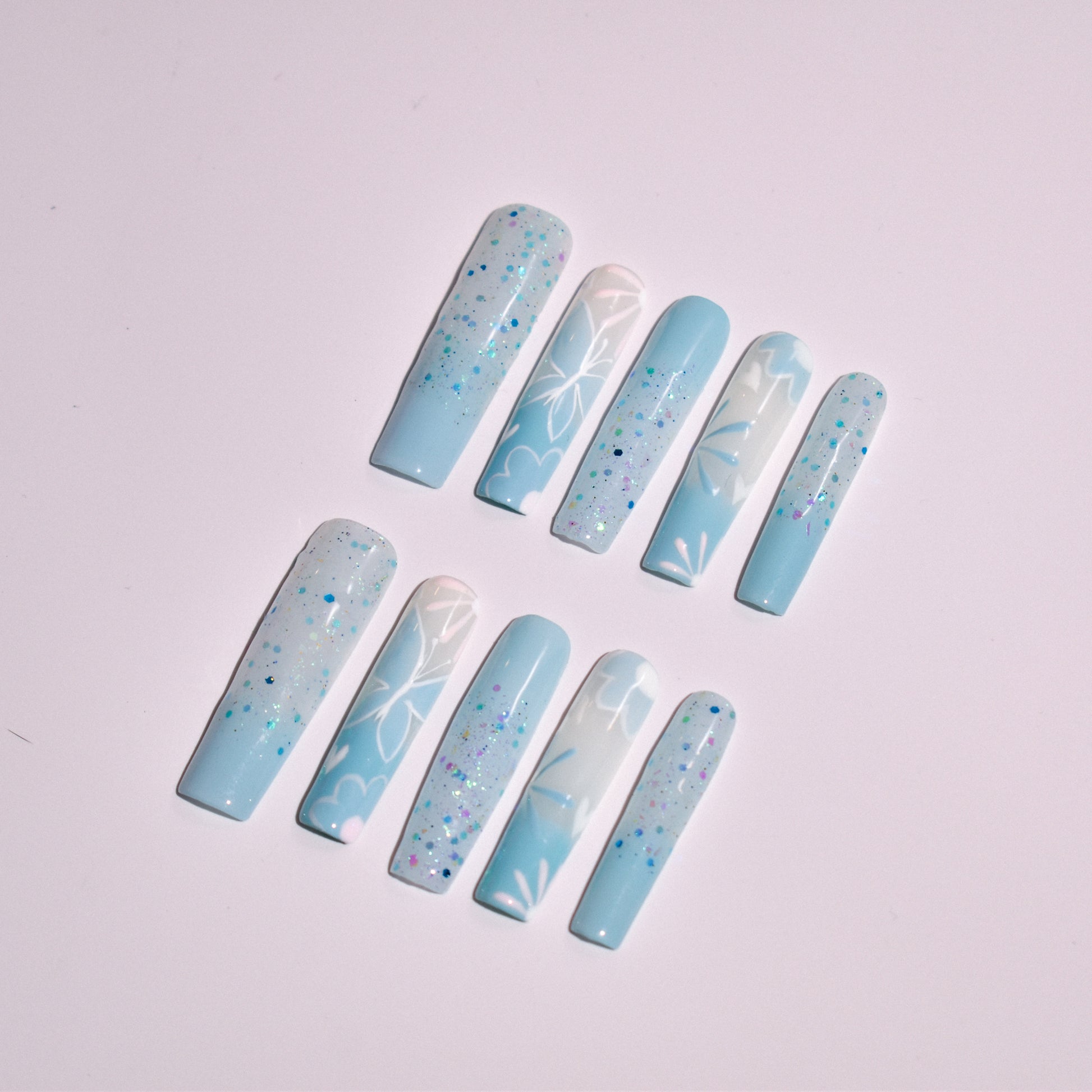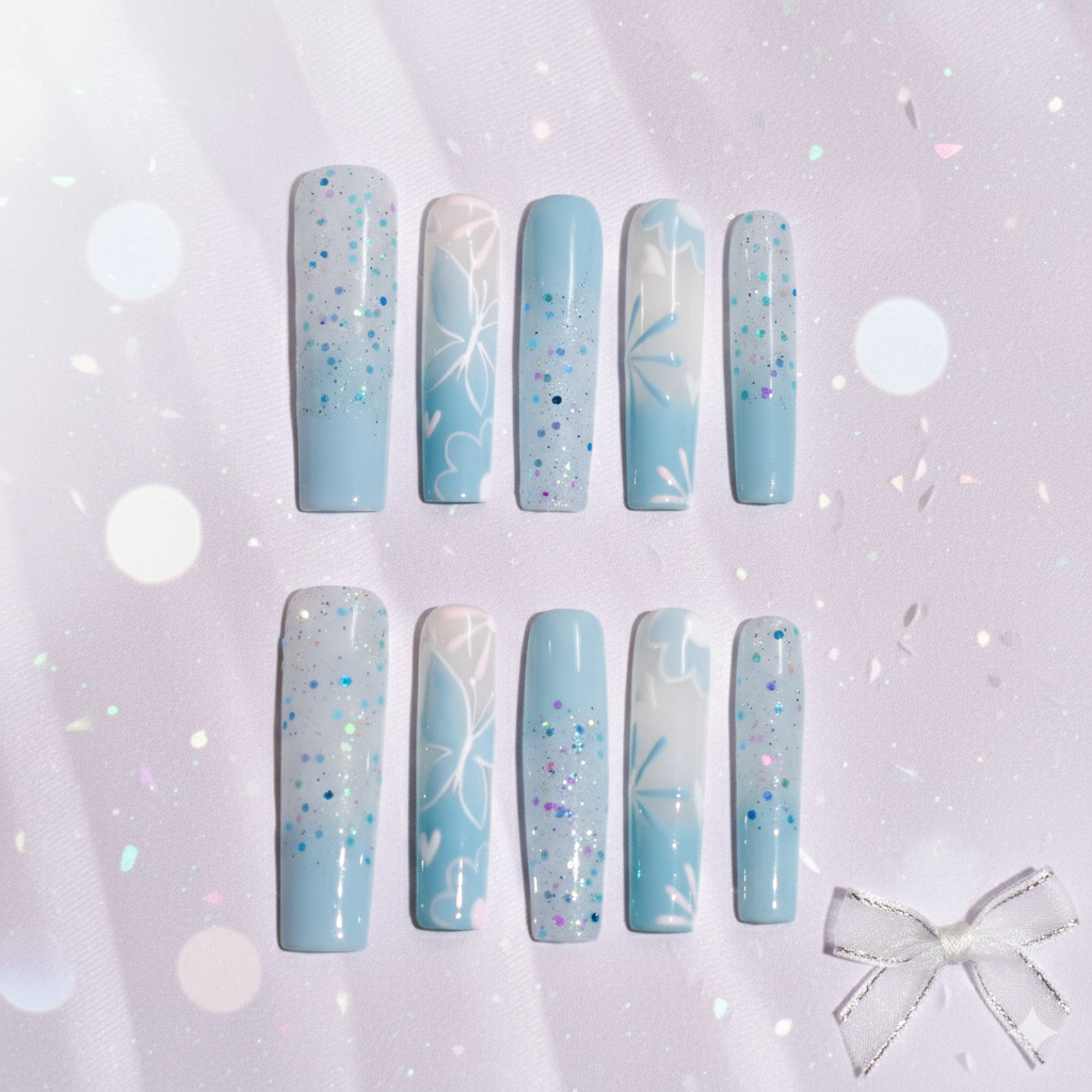 Soft, dreamy, and effortlessly clean—Cloud Drift XL is an extra-long square press-on nail set designed for lovers of airy pastels and minimal glam. This set features a soothing palette of baby blue, milky white, and icy translucent tones, finished with delicate hand-painted floral linework and scattered iridescent glitter flakes that catch the light with every movement.