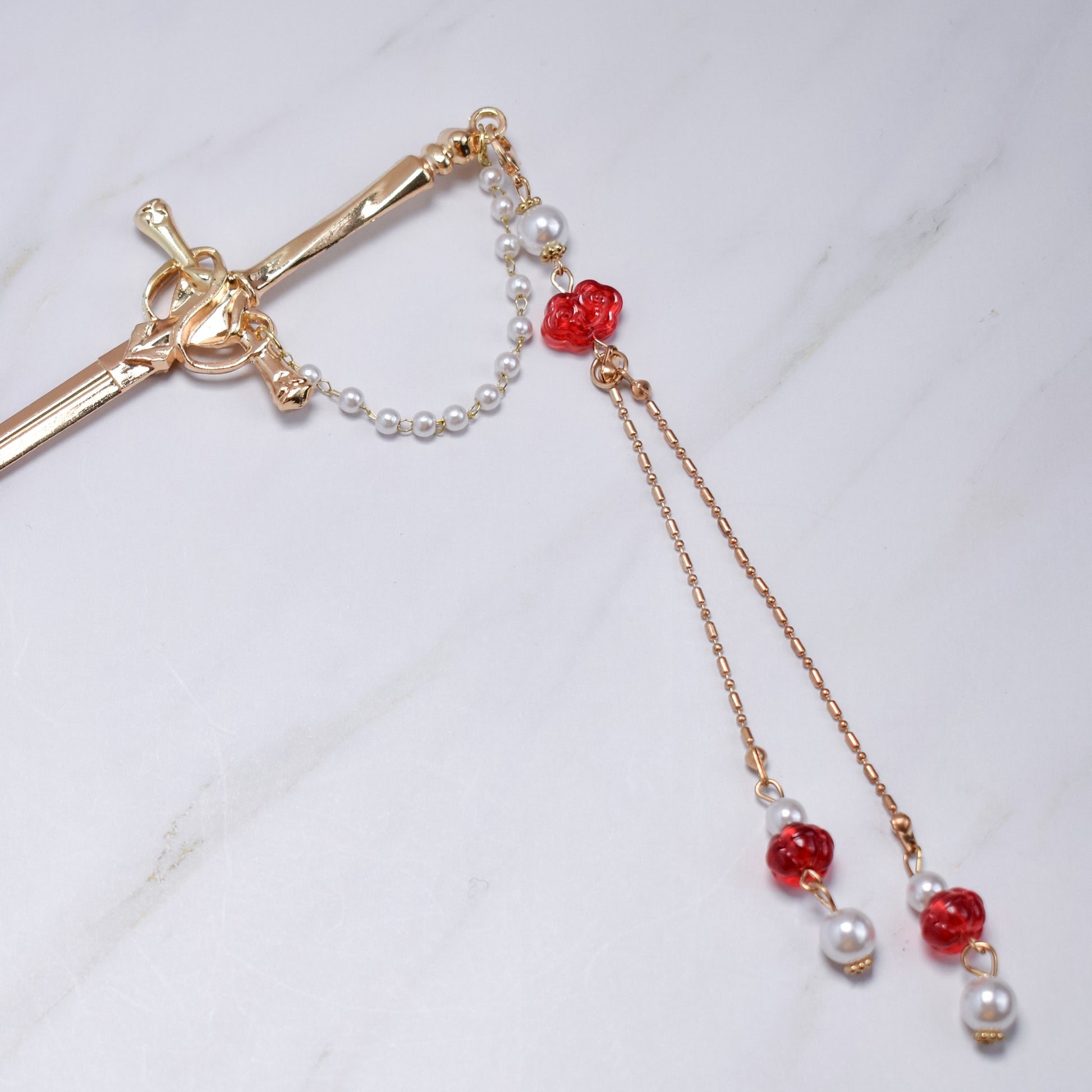 Crimson Pearl Sword Hairpin – Rose Gold Blade with Red Beads & Pearl Drops