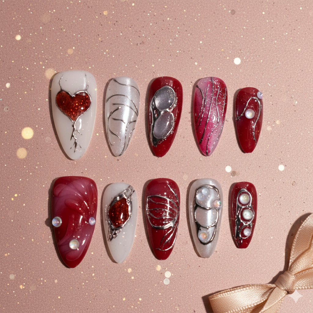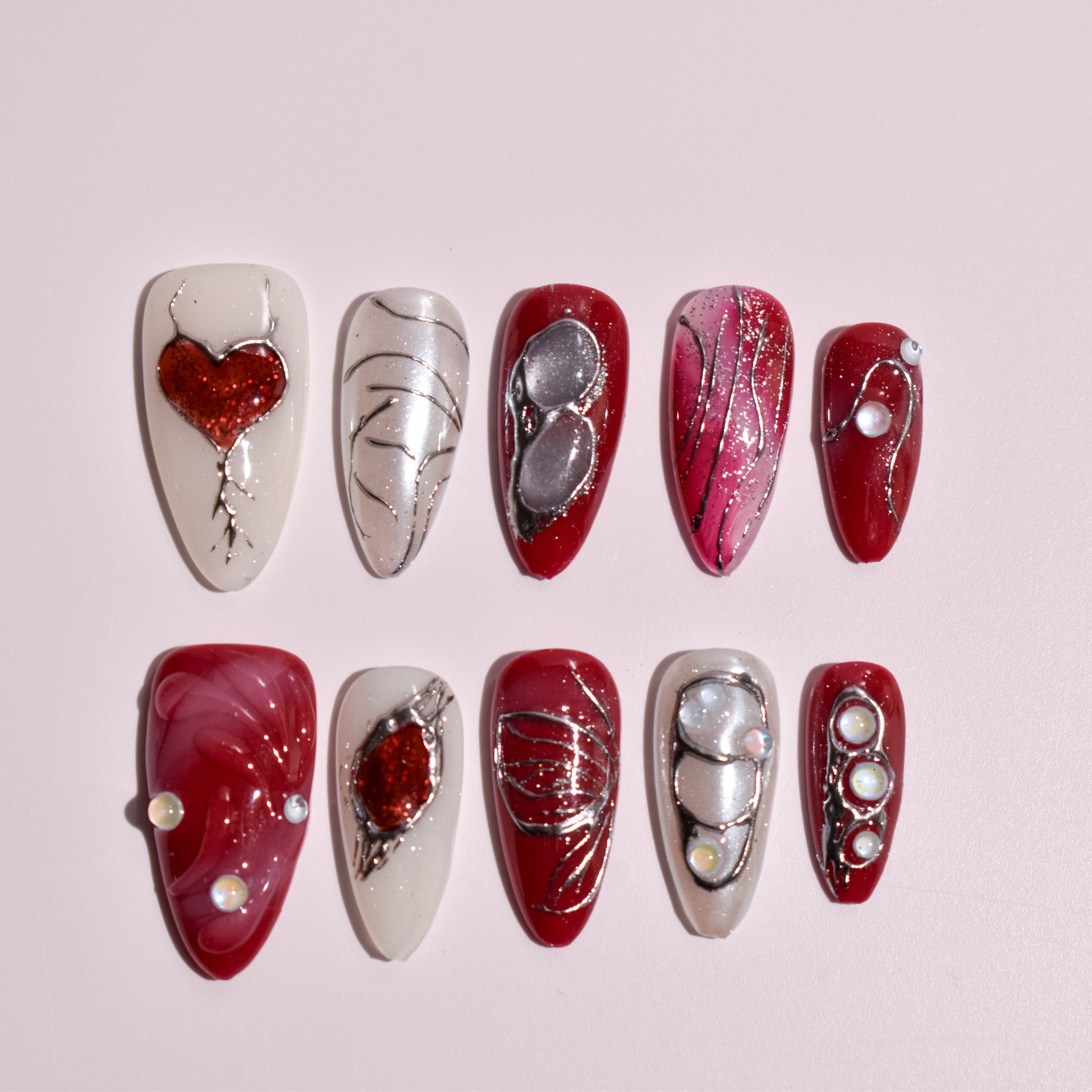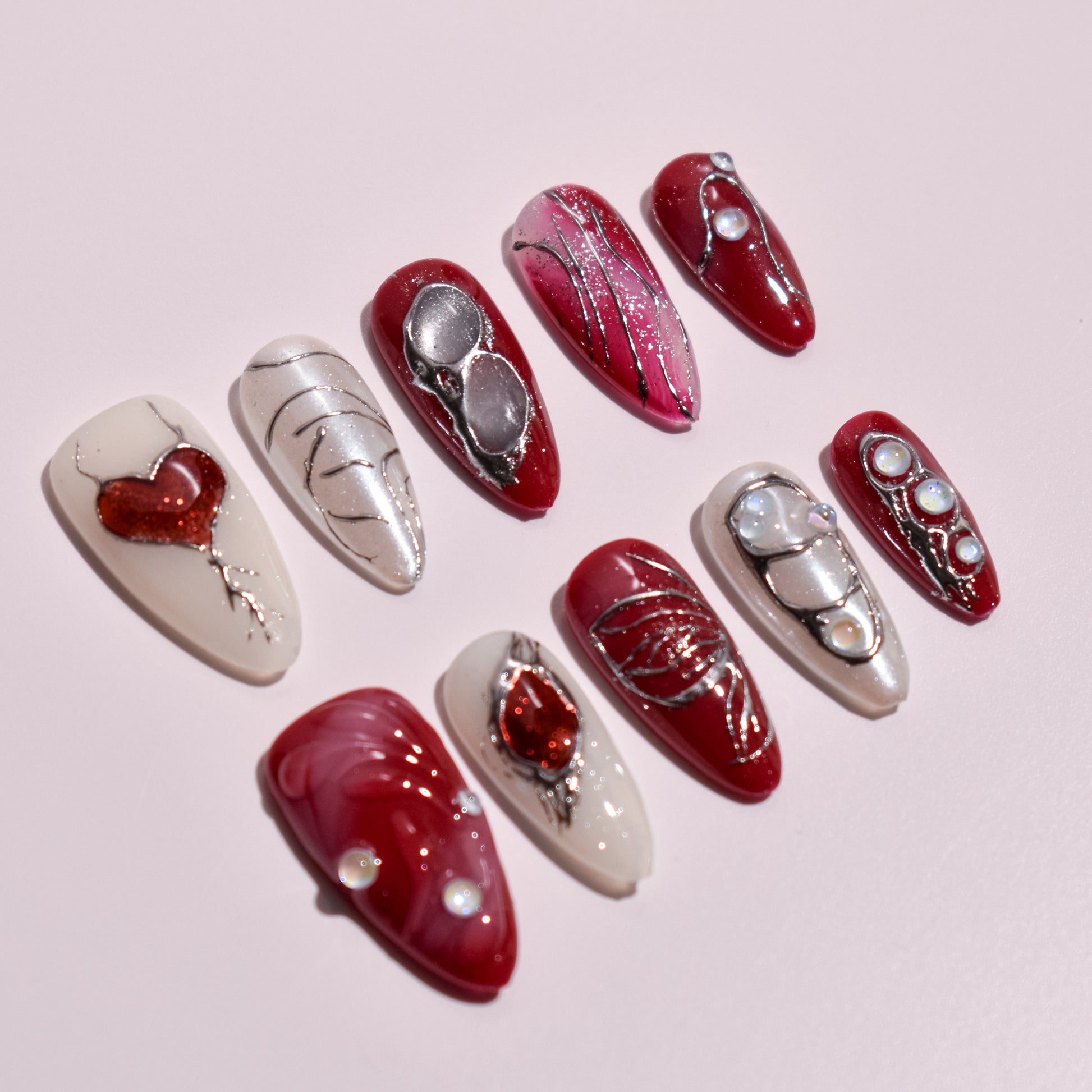 This handmade press-on nail set is sculpted in an almond shape, creating a dramatic, elongated silhouette with a sleek, high-fashion edge. The color palette centers around deep crimson red, molten wine tones, and smoky silver, layered over sheer nude and pearlized bases for contrast and dimension. The length is bold and statement-driven, designed to elevate the hands with a luxe, editorial presence while remaining balanced and wearable.