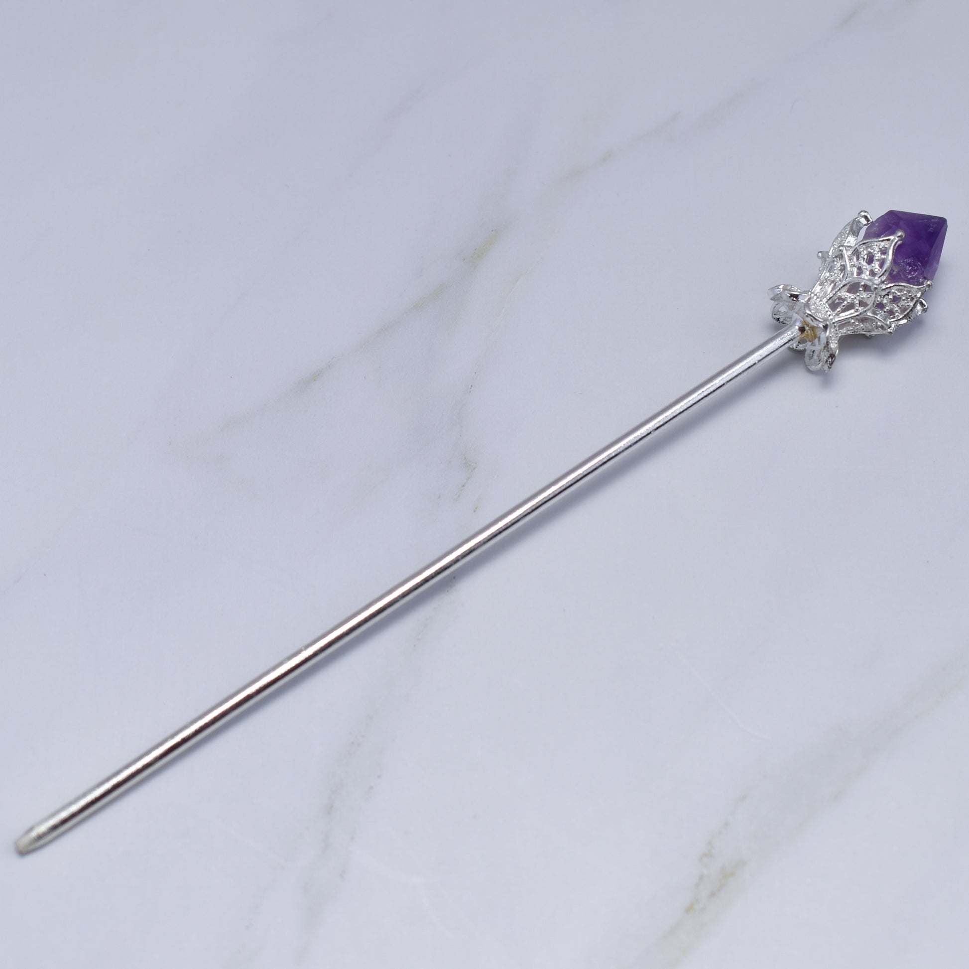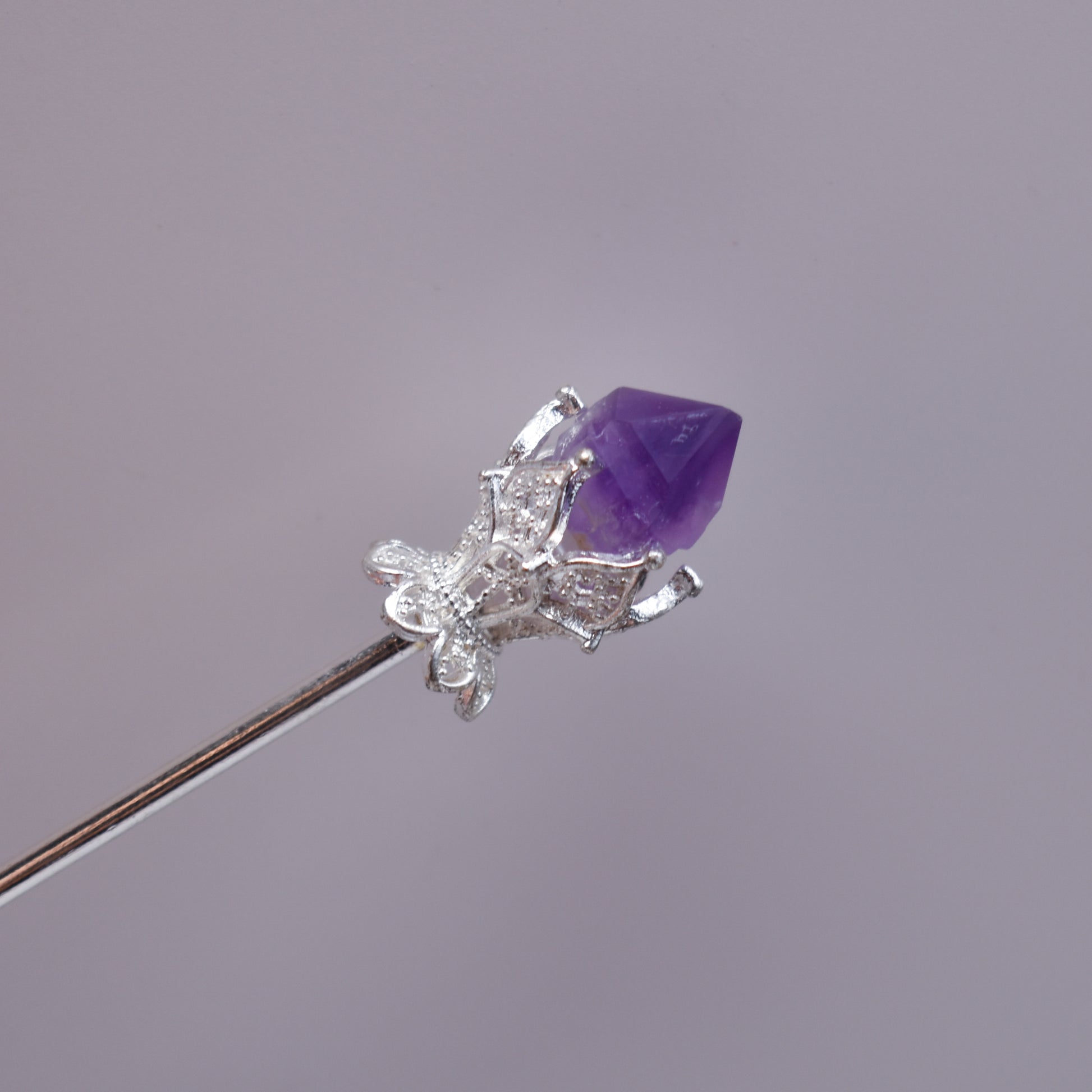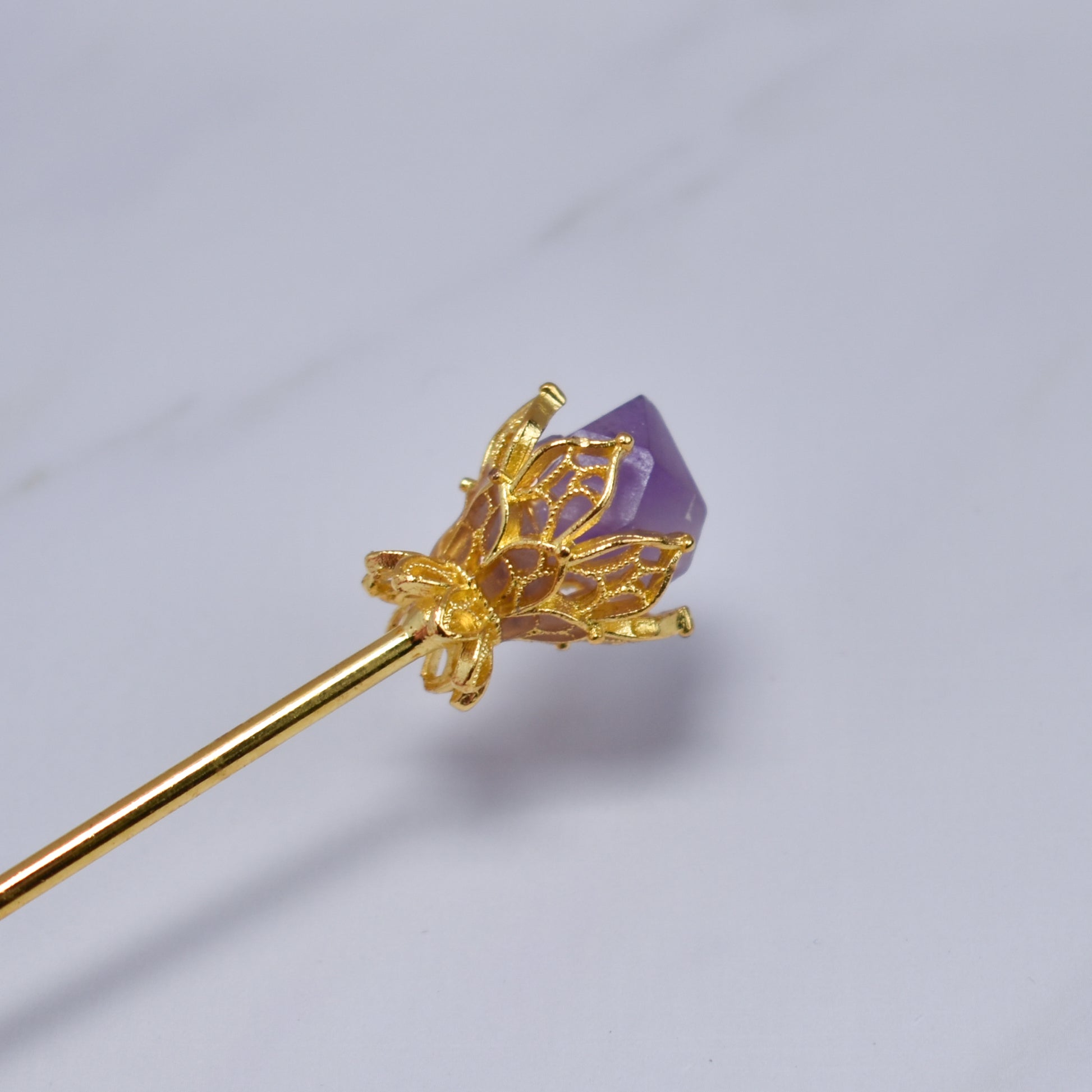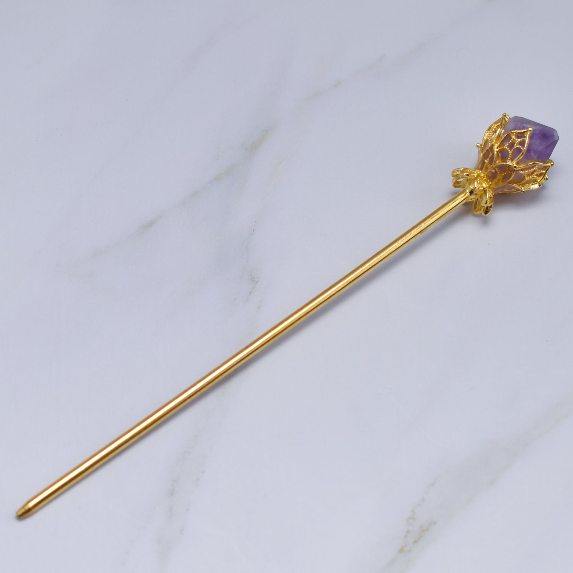 Elevate your hairstyle with the timeless beauty of natural crystal. Our Crystal Blossom Gemstone Hairpin features a raw-cut gemstone held securely in an ornate floral filigree setting, blending elegance, mystique, and vintage charm. Whether you choose amethyst or citrine, each piece adds a radiant, magical touch to buns, braids, and updos.