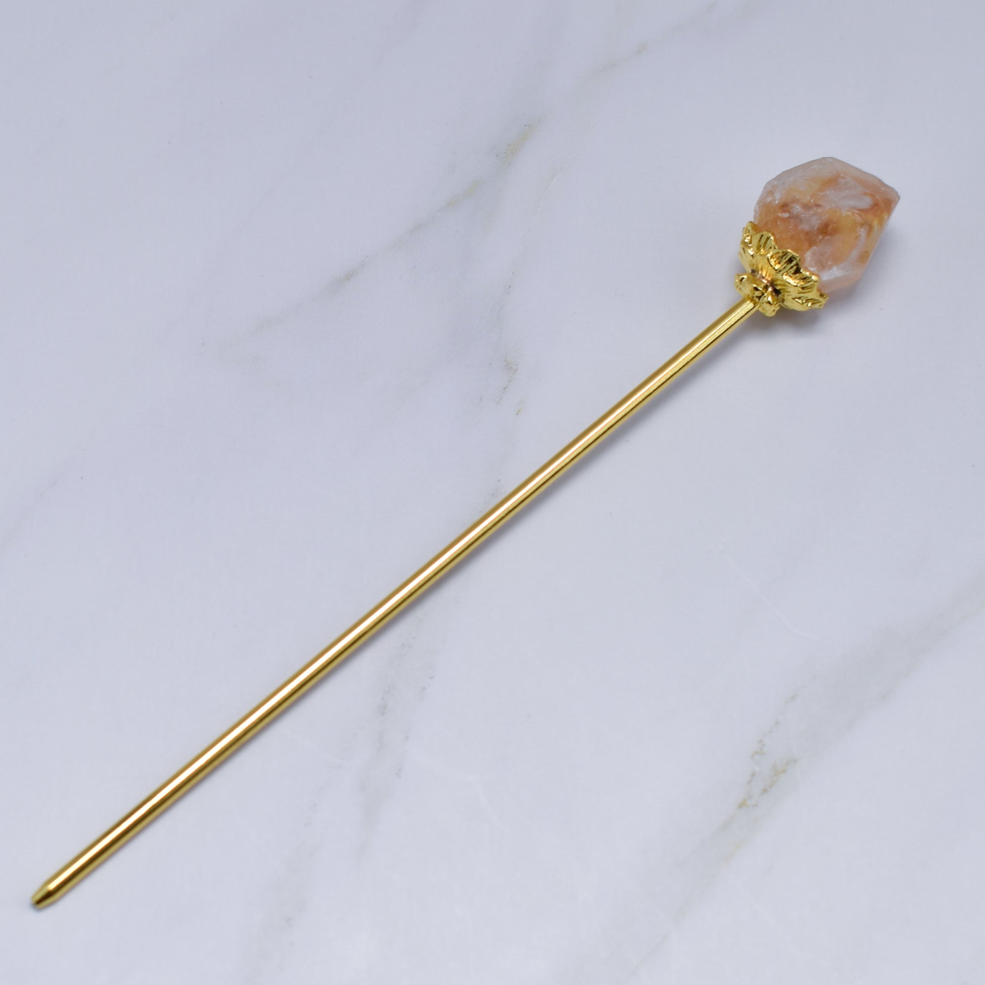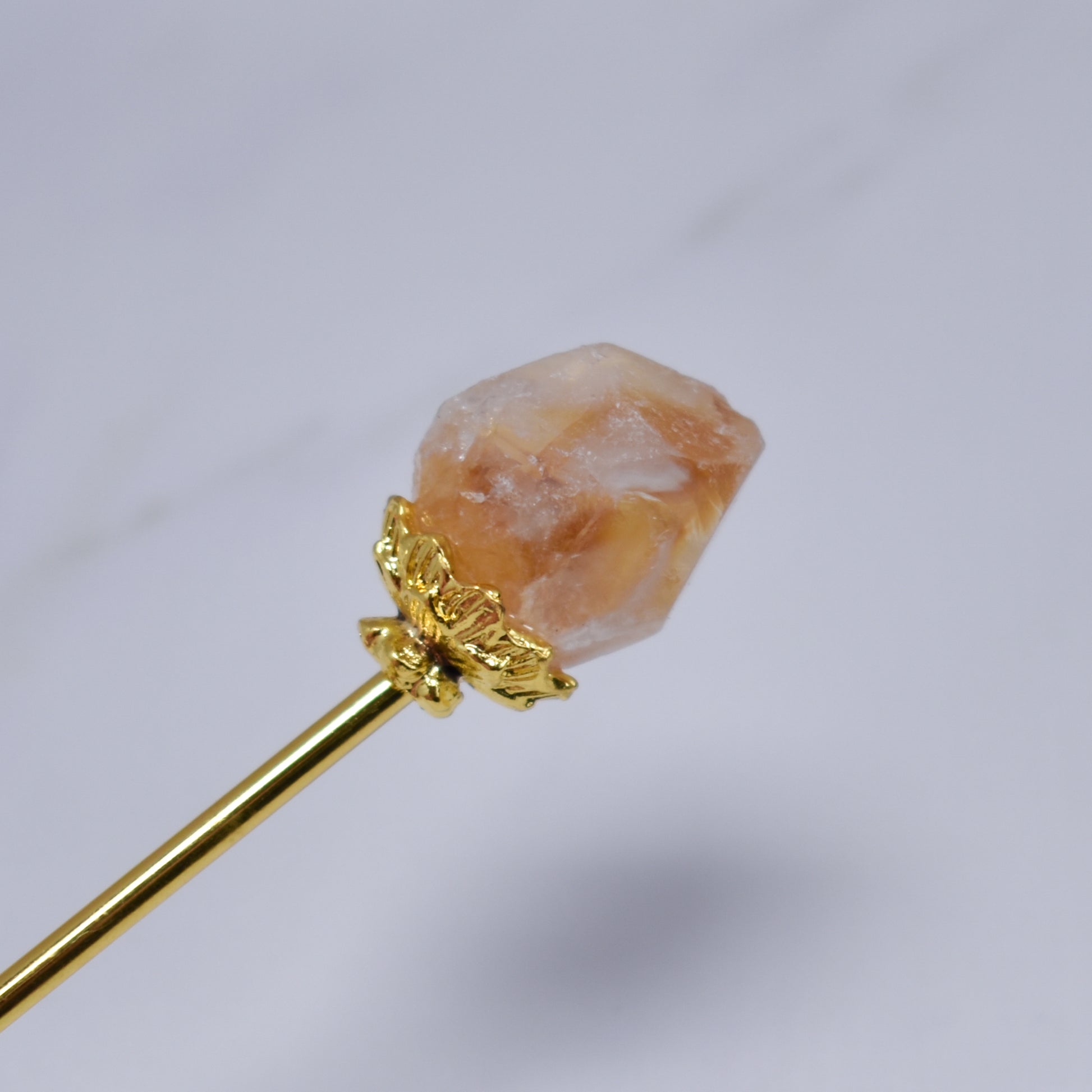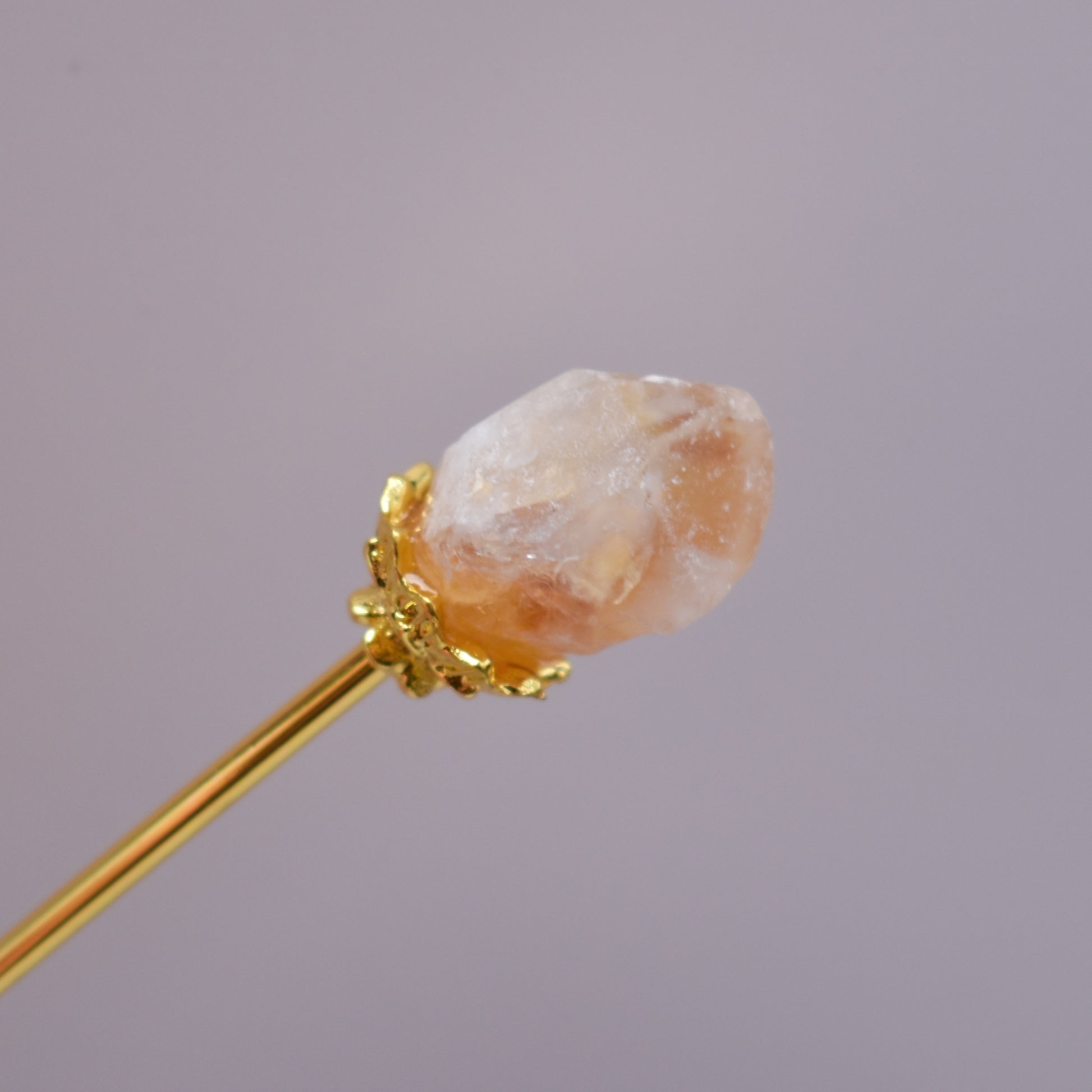 A warm, sunny hairpin with a raw citrine stone embraced by a radiant gold flower mount.