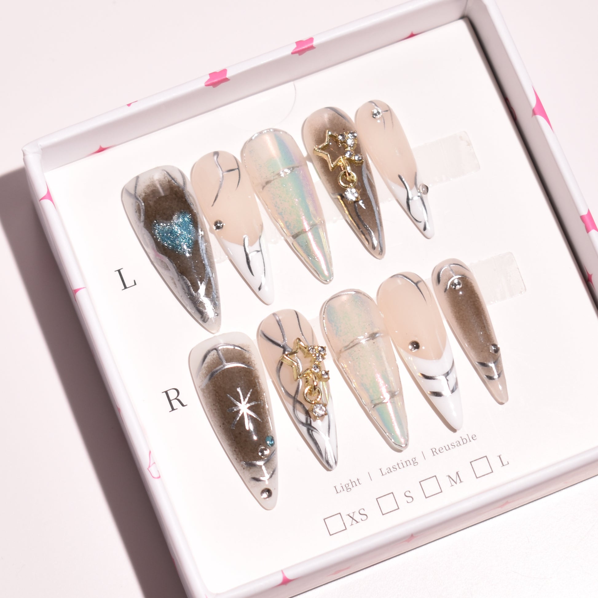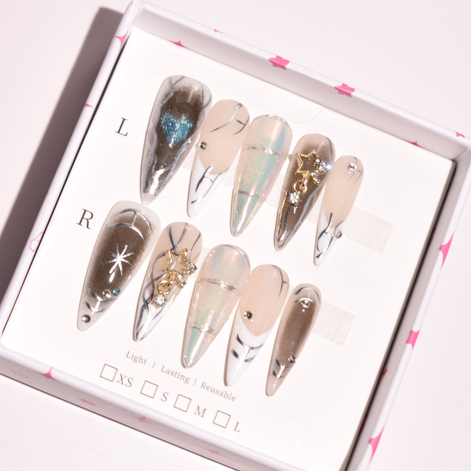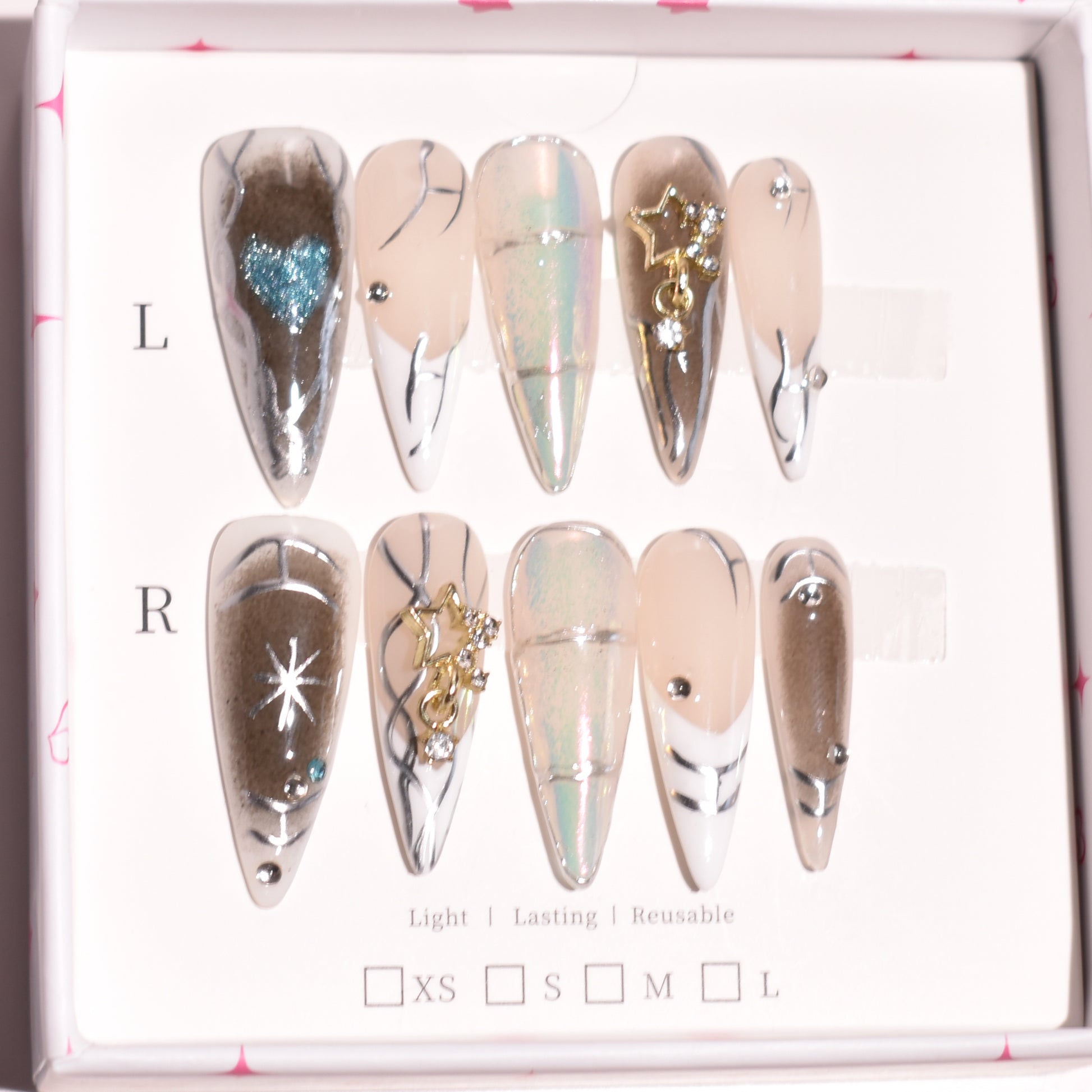 Hand-painted abstract linework and chrome detailing add movement and contrast across the set. Select nails feature delicate rhinestones and a gold star charm, creating focal points that elevate the design without overwhelming its refined palette. Glossy finishes and translucent layers work together to produce a veil-like effect that shifts beautifully under light.