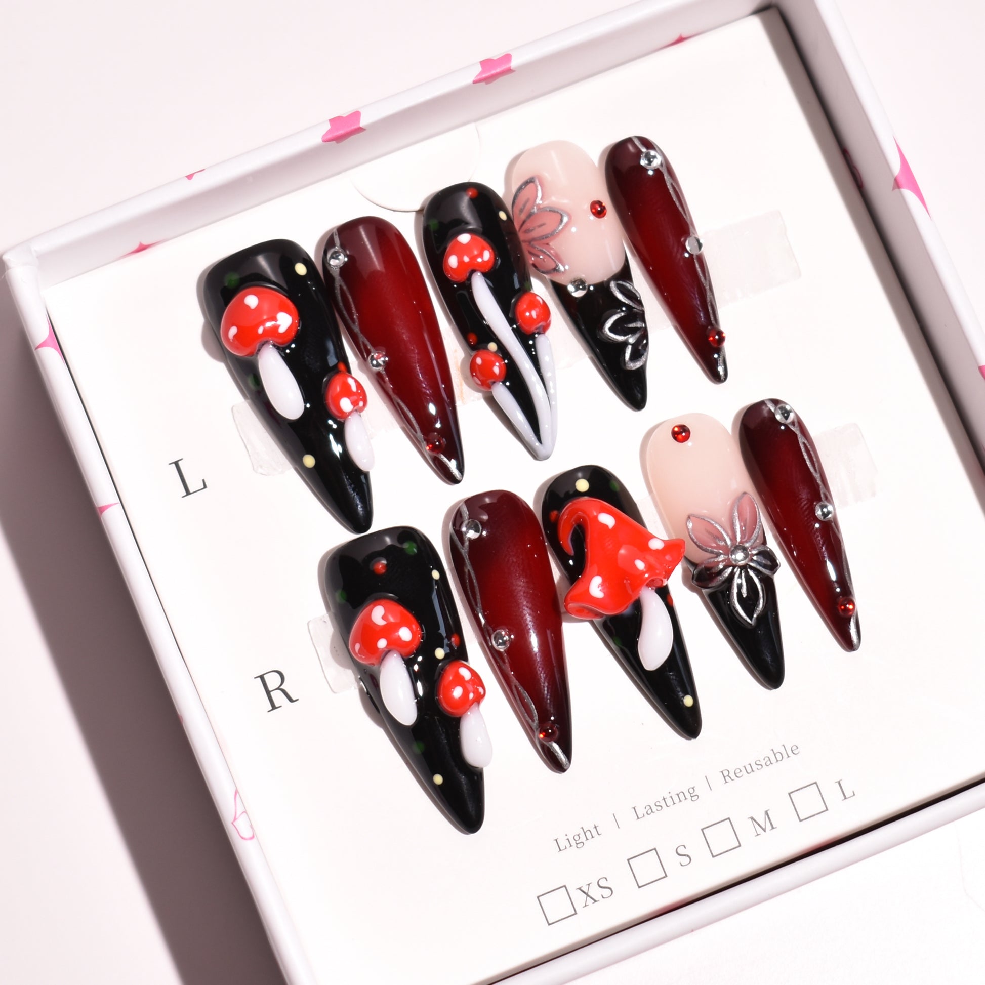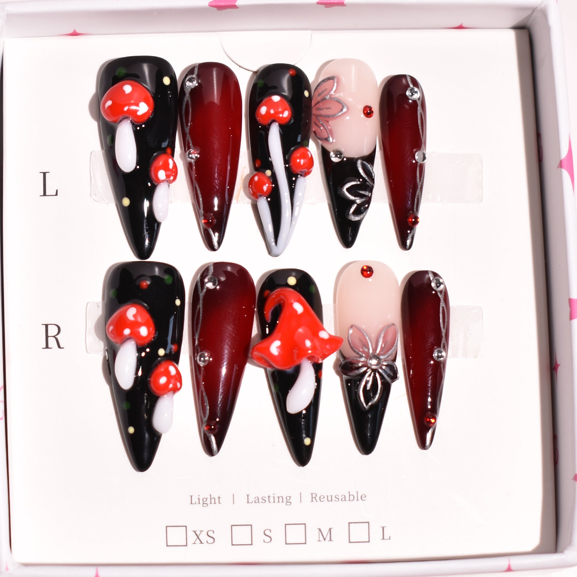 Hand-sculpted mushroom accents, raised floral details, and glossy gel elements bring a three-dimensional quality to the set. Metallic outlines, rhinestone accents, and subtle speckled details add texture and visual interest without overwhelming the design. Each nail is finished with a smooth, high-gloss top coat for a bold, glass-like finish.
